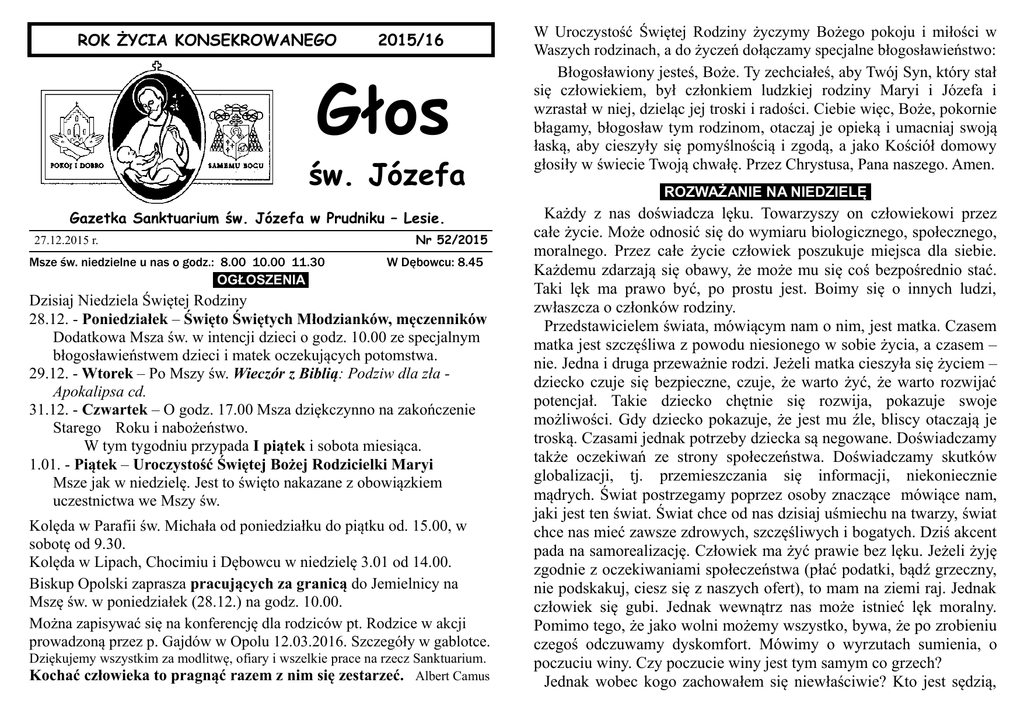 ROK ŻYCIA KONSEKROWANEGO 2015/16 Głos św. Józefa Gazetka Sanktuarium św. Józefa w Prudniku – Lesie. 27.12.2015 r. Msze św. niedzielne u nas o godz.: 8.00 10.00 11.30 OGŁOSZENIA Nr 52/2015 W Dębowcu: 8.45 Dzisiaj Niedziela Świętej Rodziny 28.12. - Poniedziałek – Święto Świętych Młodzianków, męczenników Dodatkowa Msza św. w intencji dzieci o godz. 10.00 ze specjalnym błogosławieństwem dzieci i matek oczekujących potomstwa. 29.12. - Wtorek – Po Mszy św. Wieczór z Biblią: Podziw dla zła Apokalipsa cd. 31.12. - Czwartek – O godz. 17.00 Msza dziękczynno na zakończenie Starego Roku i nabożeństwo. W tym tygodniu przypada I piątek i sobota miesiąca. 1.01. - Piątek – Uroczystość Świętej Bożej Rodzicielki Maryi Msze jak w niedzielę. Jest to święto nakazane z obowiązkiem uczestnictwa we Mszy św. Kolęda w Parafii św. Michała od poniedziałku do piątku od. 15.00, w sobotę od 9.30. Kolęda w Lipach, Chocimiu i Dębowcu w niedzielę 3.01 od 14.00. Biskup Opolski zaprasza pracujących za granicą do Jemielnicy na Mszę św. w poniedziałek (28.12.) na godz. 10.00. Można zapisywać się na konferencję dla rodziców pt. Rodzice w akcji prowadzoną przez p. Gajdów w Opolu 12.03.2016. Szczegóły w gablotce. Dziękujemy wszystkim za modlitwę, ofiary i wszelkie prace na rzecz Sanktuarium. Kochać człowieka to pragnąć razem z nim się zestarzeć. Albert Camus W Uroczystość Świętej Rodziny życzymy Bożego pokoju i miłości w Waszych rodzinach, a do życzeń dołączamy specjalne błogosławieństwo: Błogosławiony jesteś, Boże. Ty zechciałeś, aby Twój Syn, który stał się człowiekiem, był członkiem ludzkiej rodziny Maryi i Józefa i wzrastał w niej, dzieląc jej troski i radości. Ciebie więc, Boże, pokornie błagamy, błogosław tym rodzinom, otaczaj je opieką i umacniaj swoją łaską, aby cieszyły się pomyślnością i zgodą, a jako Kościół domowy głosiły w świecie Twoją chwałę. Przez Chrystusa, Pana naszego. Amen. ROZWAŻANIE NA NIEDZIELĘ Każdy z nas doświadcza lęku. Towarzyszy on człowiekowi przez całe życie. Może odnosić się do wymiaru biologicznego, społecznego, moralnego. Przez całe życie człowiek poszukuje miejsca dla siebie. Każdemu zdarzają się obawy, że może mu się coś bezpośrednio stać. Taki lęk ma prawo być, po prostu jest. Boimy się o innych ludzi, zwłaszcza o członków rodziny. Przedstawicielem świata, mówiącym nam o nim, jest matka. Czasem matka jest szczęśliwa z powodu niesionego w sobie życia, a czasem – nie. Jedna i druga przeważnie rodzi. Jeżeli matka cieszyła się życiem – dziecko czuje się bezpieczne, czuje, że warto żyć, że warto rozwijać potencjał. Takie dziecko chętnie się rozwija, pokazuje swoje możliwości. Gdy dziecko pokazuje, że jest mu źle, bliscy otaczają je troską. Czasami jednak potrzeby dziecka są negowane. Doświadczamy także oczekiwań ze strony społeczeństwa. Doświadczamy skutków globalizacji, tj. przemieszczania się informacji, niekoniecznie mądrych. Świat postrzegamy poprzez osoby znaczące mówiące nam, jaki jest ten świat. Świat chce od nas dzisiaj uśmiechu na twarzy, świat chce nas mieć zawsze zdrowych, szczęśliwych i bogatych. Dziś akcent pada na samorealizację. Człowiek ma żyć prawie bez lęku. Jeżeli żyję zgodnie z oczekiwaniami społeczeństwa (płać podatki, bądź grzeczny, nie podskakuj, ciesz się z naszych ofert), to mam na ziemi raj. Jednak człowiek się gubi. Jednak wewnątrz nas może istnieć lęk moralny. Pomimo tego, że jako wolni możemy wszystko, bywa, że po zrobieniu czegoś odczuwamy dyskomfort. Mówimy o wyrzutach sumienia, o poczuciu winy. Czy poczucie winy jest tym samym co grzech? Jednak wobec kogo zachowałem się niewłaściwie? Kto jest sędzią, autorytetem, weryfikującym moje funkcjonowanie? Bywa również tak, że jeszcze niczego nie robię a już pojawia się poczucie winy. Z poczuciem winy bardzo ściśle związany jest lęk. Poczucie winy często uruchamia lęk. Na początku XX wieku Freud skonstruował koncepcję osobowości. Według Freuda osobowość składa się z kilku wymiarów a najistotniejsze jest to, co biologiczne. Wymiar ten chce zachować przyjemność dla samego siebie. Z kolei wymiar ego mówi, czy realne jest osiągnięcie jakiejś przyjemności. Po przyjemnym i możliwym jest jeszcze inna instancja: superego. Ono decyduje czy to, czego chcę, jest dobre, właściwe, czy też nie. Superego rządzi się zasadą powinności. Żyjesz nie jak chcesz, ale jak powinieneś. Superego mówi: nie wolno, bo będzie kara. Gdy ustaje kontrola ze strony osób znaczących, czynienie tego, co bym chciał uniemożliwia mi moje sumienie. Pozornie mogłoby się wydawać, że to ja sam podejmuję decyzje, jednak nic bardziej mylnego. Ileż to razy jako dzieci słyszeliśmy od osób znaczących, czego nie powinno się robić. Przekazując nam pewne powinności, można dziecku niechcący sprzedać własne obawy i lęki. Dochodzi do internalizacji, czyli do przejęcia norm osób znaczących. Jednak młody człowiek wyruszający w świat nie może otrząsnąć się ze zdumienia: w świecie bywa zupełnie inaczej, aniżeli twierdzili rodzice. Według Freuda, sumienie jest reprezentacją tego, co dały nam osoby znaczące. W superego (sumieniu) znajduje się jeszcze tzw. ja idealne. Może też pojawić się mechanizm identyfikacji: nieświadomie jestem jakąś osobą znaczącą, nie jestem sobą. Jak często robimy coś, czego robić nie chcemy? Jak często nasze zamiary, decyzje i czyny związane są przede wszystkim i wyłączne z oceną drugiego człowieka? Gdy nie spełniam oczekiwań innych, pojawia się poczucie winy, niemające jednak z grzechem wiele wspólnego. Dla św. Tomasza sumienie było zwierciadłem, świadkiem dobrych/złych zachowań. W przeciwieństwie do poczucia winy, sumienie człowiek odnajduje w sobie. Poczucie winy wynikające z superego,