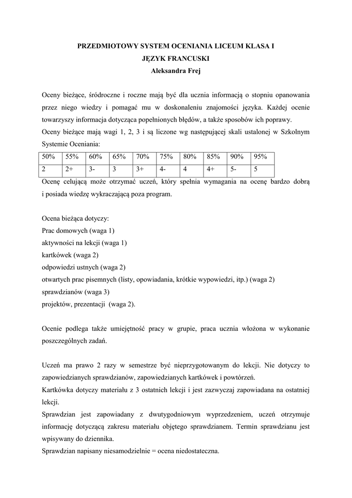 PRZEDMIOTOWY SYSTEM OCENIANIA LICEUM KLASA I JĘZYK FRANCUSKI Aleksandra Frej Oceny bieżące, śródroczne i roczne mają być dla ucznia informacją o stopniu opanowania przez niego wiedzy i pomagać mu w doskonaleniu znajomości języka. Każdej ocenie towarzyszy informacja dotycząca popełnionych błędów, a także sposobów ich poprawy. Oceny bieżące mają wagi 1, 2, 3 i są liczone wg następującej skali ustalonej w Szkolnym Systemie Oceniania: 50% 55% 60% 65% 70% 75% 80% 85% 90% 95% 2 2+ 3- 3 3+ 4- 4 4+ 5- 5 Ocenę celującą może otrzymać uczeń, który spełnia wymagania na ocenę bardzo dobrą i posiada wiedzę wykraczającą poza program. Ocena bieżąca dotyczy: Prac domowych (waga 1) aktywności na lekcji (waga 1) kartkówek (waga 2) odpowiedzi ustnych (waga 2) otwartych prac pisemnych (listy, opowiadania, krótkie wypowiedzi, itp.) (waga 2) sprawdzianów (waga 3) projektów, prezentacji (waga 2). Ocenie podlega także umiejętność pracy w grupie, praca ucznia włożona w wykonanie poszczególnych zadań. Uczeń ma prawo 2 razy w semestrze być nieprzygotowanym do lekcji. Nie dotyczy to zapowiedzianych sprawdzianów, zapowiedzianych kartkówek i powtórzeń. Kartkówka dotyczy materiału z 3 ostatnich lekcji i jest zazwyczaj zapowiadana na ostatniej lekcji. Sprawdzian jest zapowiadany z dwutygodniowym wyprzedzeniem, uczeń otrzymuje informację dotyczącą zakresu materiału objętego sprawdzianem. Termin sprawdzianu jest wpisywany do dziennika. Sprawdzian napisany niesamodzielnie = ocena niedostateczna. Uczeń ma prawo do poprawy uzyskanej oceny bieżącej w terminie ustalonym z nauczycielem. Ocena śródroczna i roczna jest wystawiana na podstawie średniej ważonej zgodnie ze Szkolnym Systemem Oceniania. Oceny zostają wpisane do e-dziennika w ciągu tygodnia. Ocena z obu semestrów jest równoważna. Uczeń może otrzymać ocenę wyższą od przewidywanej jeśli spełnia warunki opisane w Szkolnym Systemie Oceniania oraz poprawi w terminie ustalonym z nauczycielem sprawdziany na ocenę, o która się ubiega. Ocena osiągnięć ucznia: ocena niedostateczna - uczeń nie opanował wiadomości, co uniemożliwia mu posługiwanie się językiem - uczeń ma duże trudności z prawidłowym posługiwaniem się słownictwem - uczeń nie potrafi zbudować najprostszych zdań nawet z pomocą nauczyciela - uczeń nie prowadzi systematycznie zeszytu - uczeń jest nieprzygotowany do lekcji - jego braki w wiedzy są na tyle duże, że uniemożliwiają komunikację językową ocena dopuszczająca - uczeń opanował wiedzę w stopniu elementarnym - uczeń ma duże braki w opanowaniu wiadomości i umiejętności określonych programem, ale braki te nie przekreślają możliwości dalszego kształcenia - uczeń reaguje na proste polecenia nauczyciela, często poparte gestem - wypowiedzi ucznia są bardzo ograniczone, odpowiada na pytania jednym słowem - pisemne wypowiedzi ucznia sprowadzają się do poprawnego zapisu wyrazu lub krótkiego zwrotu - uczeń prowadzi systematycznie zeszyt - uczeń często nie odrabia zajęć domowych lub wykonuje je niesamodzielnie ocena dostateczna - uczeń opanował materiał programowy w stopniu podstawowym - uczeń stosuje ubogie słownictwo i popełnia liczne błędy leksykalne i gramatyczne - uczeń ma kłopoty z poprawną wymową i zapisem wyrazów - uczeń uczestniczy w komunikacji, choć ilość popełnianych błędów niekiedy ją utrudnia - uczeń ma również problemy ze zrozumieniem przeczytanych lub wysłuchanych tekstów - uczeń jest zazwyczaj przygotowany do zajęć ocena dobra - uczeń opanował materiał programowy w stopniu umożliwiającym posługiwanie się językiem zarówno w mowie jak i w piśmie - uczeń uczestniczy w konwersacji a sporadycznie popełniane błędy nie zakłócają jej - w czasie komunikacji zadaje pytania i udziela szczegółowych informacji - rozumie ogólny sens przeczytanych i wysłuchanych tekstów - uczeń poprawnie stosuje wiadomości i umiejętności do samodzielnej pracy - uczeń chętnie uczestniczy w lekcjach, jest aktywny - zdarza mu się być nieprzygotowanym do lekcji, ale stara się szybko nadrobić braki ocena bardzo dobra -uczeń płynnie czyta ze zrozumieniem dłuższe i bardziej złożone teksty i dialogi; - uczeń rozumie globalne i szczegółowo tekstu czytany; - uczeń wyszukuje żądane informacje, określa kontekst komunikacyjny tekstu ( nadawca odbiorca, forma wypowiedzi), rozpoznaje związki między poszczególnymi częściami tekstu - uczeń wykazuje się dokładną i pełną znajomością materiału zawartego w programie - uczeń wykazuje dużą samodzielność i potrafi bez pomocy nauczyciela radzić sobie w typowych sytuacjach komunikacyjnych - uczeń potrafi zdobyć potrzebne informacje i je wykorzystać w rozmowie lub do napisania listu, notatki - uczeń posiada szeroki zasób słownictwa, który potrafi wykorzystać do pełnej wypowiedzi na zadany temat. - uczeń jest zawsze przygotowany do lekcji i nie ma żadnych zaległości w nauce - uczeń jest aktywny na lekcjach ocena celująca - uczeń w pełni opanował materiał zawarty w programie - wypowiedzi ucznia wyróżniają się pod względem bogactwa językowego i treści - posiada dodatkowe wiadomości i umiejętności, co stanowi często efekt samodzielnej pracy ucznia - uczeń charakteryzuje się bogactwem języka i swobodą wypowiedzi w mowie i piśmie - uczeń jest w pełni komunikatywny - uczeń czyta biegle, rozumie i właściwie interpretuje przeczytane teksty - uczeń prawidłowo rozumie wypowiedzi nauczyciela i dłuższe komunikaty - uczeń jest zawsze przygotowany do lekcji - uczeń na lekcjach jest zawsze aktywny, sumienny i obowiązkowy, pomaga słabszym w nauce.