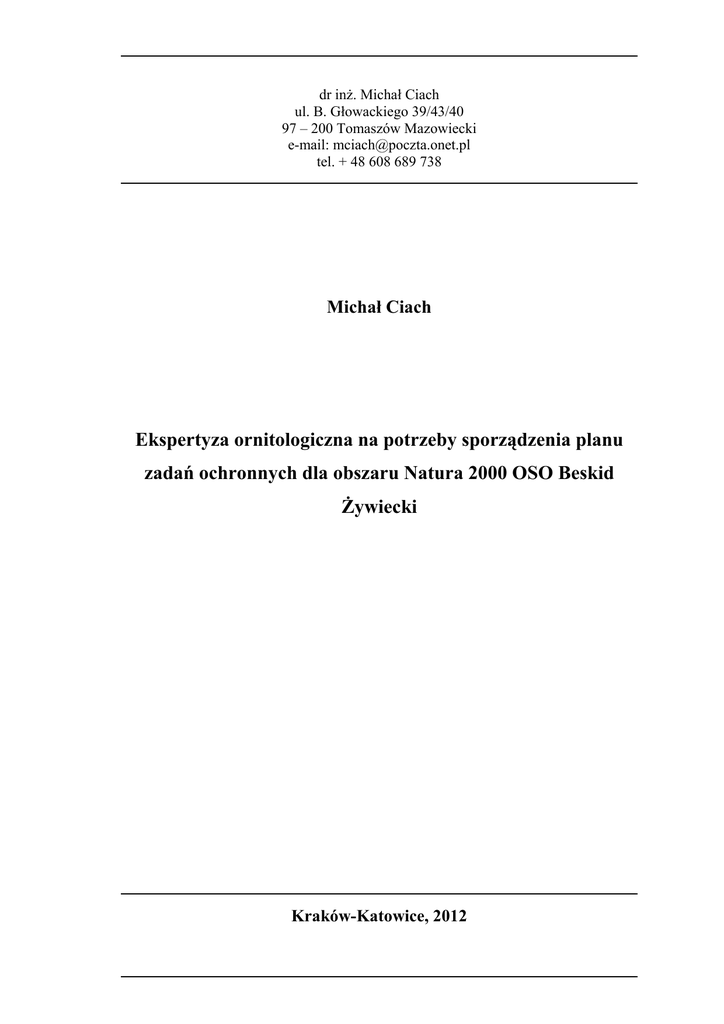 dr inż. Michał Ciach ul. B. Głowackiego 39/43/40 97 – 200 Tomaszów Mazowiecki e-mail: [email protected] tel. + 48 608 689 738 Michał Ciach Ekspertyza ornitologiczna na potrzeby sporządzenia planu zadań ochronnych dla obszaru Natura 2000 OSO Beskid Żywiecki Kraków-Katowice, 2012 Spis treści: 1. Charakterystyka ostoi .................................................................................. 3 2. Głuszec Tetrao urogallus ...................................................................... 4 3. Jarząbek Bonasia bonasia ...................................................................... 17 4. Sóweczka Glaucidium passerinum 5. Puchacz Bubo bubo .......................................................... 19 .................................................................................. 23 6. Włochatka Aegolius funereus ...................................................................... 27 7. Puszczyk uralski Strix uralensis .......................................................... 31 8. Dzięcioł czarny Dryocopus martius .......................................................... 35 9. Dzięcioł białogrzbiety Dendrocopos leucotos ............................................... 37 10. Dzięcioł trójpalczasty Picoides tridactylus …........................................... 41 11. Dzięcioł zielonosiwy Picus canus 12. Derkacz Crex crex .......................................................... 45 .................................................................................. 49 13. Orzeł przedni Aquila chrysaetos .......................................................... 52 14. Wskazanie przedmiotów ochrony na obszarze OSO Beskid Żywiecki ........... 56 15. Literatura .............................................................................................. 58 Sposób cytowania: Ciach M. 2012. Ekspertyza ornitologiczna na potrzeby sporządzenia planu zadań ochronnych dla obszaru Natura 2000 OSO Beskid Żywiecki. Maszynopis + warstwy GIS. Regionalna Dyrekcja Ochrony Środowiska, Katowice. Charakterystyka ostoi Beskid Żywiecki położony jest w Beskidach Zachodnich, będących częścią Zewnętrznych Karpat Zachodnich (Kondracki 2000). Obszar ten składa się z kilku pasm górskich, wśród których wyróżnia się grupa Wielkiej Raczy (1236 m n. p. m.) oraz grupa Pilska (1557 m n. p. m.). W krajobrazie dominują kopulaste grzbiety górskie poprzecinane siecią licznych potoków i strumieni tworzących zlewnię Soły. Beskidy Zachodnie zbudowane są z fliszowych utworów serii magurskiej (Kondracki 2000). Beskid Żywiecki utworzony jest z fliszu karpackiego, zbudowanego z piaskowców przedzielonych warstwami łupków. Obszar ostoi w przeważającej części pokryty zbiorowiskami leśnymi, cechuje charakterystyczny dla gór piętrowy układ roślinności. Wśród zbiorowisk roślinnych dominują żyzna buczyna karpacka Dentario glandulosaeFagetum, dolnoreglowy bór jodłowo-świerkowy Abieti-Piceetum oraz górnoreglowa acydofilna świerczyna karpacka Plagiothecio-Piceetum (Matuszkiewicz 2001, Holeksa i Szwagrzyk 2004a, 2004b, Szwagrzyk i Holeksa 2004). Do gatunków dominujących należy świerk pospolity Picea abies, tworzący bory górnoreglowe oraz buk zwyczajny Fagus sylvatica i jodła pospolita Abies alba tworzące lasy regla dolnego. Jednak w skutek działalności człowieka zbiorowiska leśne uległy na badanym terenie daleko idącym przekształceniom. W wyniku masowego wprowadzania w niższych położeniach sztucznych nasadzeń świerkowych zbiorowiska leśne w znacznej części zostały silnie zmienione. W efekcie świerk w wielu miejscach stał się dominantem w drzewostanie. W ostatnich latach obserwowane są jednak katastrofalne rozpady sztucznych drzewostanów świerkowych, które mogą doprowadzić do silnego spadku wieku drzewostanów, a nawet okresowej utraty lesistości na części obszaru. Tereny leśne stanowią obecnie około 82% powierzchni ostoi. Pozostałą część zajmują tereny otwarte (głównie łąki i polany), a w mniejszym stopniu tereny zabudowane oraz cieki wodne. W masywie Pilska obecna jest górna granica lasu wraz ze zbiorowiskami kosodrzewiny Pinus mugo oraz niewielkimi płatami łąk alpejskich. Ostoja Beskid Żywiecki PLB240002 (IBA PL127) pokrywa większą część pasma Beskidu Żywieckiego. W zasadniczej części pokrywa się ona z obszarem Żywieckiego Parku Krajobrazowego oraz Specjalnym Obszarem Ochrony Siedlisk „Beskid Żywiecki” (PLH240006). Fragmenty OSO Beskid Żywiecki są objęte także ochroną w formie rezerwatów przyrody: Butorza (30,68 ha), Śrubita (24,99 ha), Pod Rysianką (27,54 ha), Oszast (48,82 ha), Dziobaki (13,06 ha), Gawroniec (23,69 ha), Romanka (98,45 ha), Pilsko (105,21 ha obejmujący zlikwidowany i włączony rezerwat Pięć Kopców) oraz Muńcoł (45,20 ha). Rezerwaty utworzono w celu ochrony najcenniejszych fragmentów lasów regla dolnego oraz górnoreglowych borów świerkowych. Jednak nadal część najcenniejszych drzewostanów nie jest chroniona w stopniu wystarczającym i wskazane jest utworzenie kilku dalszych rezerwatów. Część obszaru ostoi wchodzi w skład Leśnego Kompleksu Promocyjnego Lasy Beskidu Śląskiego. Administracyjnie obszar OSO Beskid Żywiecki znajduje się na terenie województwa śląskiego. Lasy administrowane są przez Regionalną Dyrekcję Lasów Państwowych w Katowicach. Obszar ostoi leży na ternie Nadleśnictwa Jeleśnia, Nadleśnictwa Węgierska Górka oraz Nadleśnictwa Ujsoły. Po stronie Słowackiej, sąsiadujący z OSO Beskid Żywiecki teren, pokryty jest SOO Kysucké Beskydy w rejonie „worka raczańskiego” i dwoma niewielkimi SOO Pilsko oraz SOO Rašeliniská Oravských Beskýd w rejonie masywu Pilska. Obszar ptasi OSO Horná Orava obejmuje rozległy teren rozciągający się od wschodniej części „worka raczańskiego” po rejon masywu Pilska. Głuszec Tetrao urogallus Kod gatunku: A108 1a) Weryfikacja aktualnego stanu pop