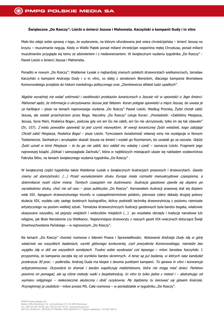 Świąteczne „Do Rzeczy”: Lisicki o śmierci Jezusa i Mahometa. Kaczyński o kampanii Dudy i in vitro Mało kto zdaje sobie sprawę z tego, że wydarzenie, na którym ufundowana jest wiara chrześcijańska – śmierć Jezusa na krzyżu – muzułmanie negują. Kiedy w Wielki Piątek ponad miliard chrześcijan wspomina mękę Chrystusa, ponad miliard muzułmanów przygląda się temu ze zdziwieniem i z niedowierzaniem. W świątecznym wydaniu tygodnika „Do Rzeczy” Paweł Lisicki o śmierci Jezusa i Mahometa. Ponadto w nowym „Do Rzeczy”: Waldemar Łysiak o najbardziej znanych polskich drzeworytach wielkanocnych, Jarosław Kaczyński o kampanii Andrzeja Dudy i o in vitro, co dalej z senatorem Biereckim, dlaczego kampania Bronisława Komorowskiego przejdzie do historii marketingu politycznego oraz „Ziemkiewicza alfabet ludzi upadłych”. Nigdzie wyraźniej nie widać wtórności i osobliwości przekazów koranicznych o Jezusie niż w opowieści o Jego śmierci. Mahomet sądzi, że informacja o ukrzyżowaniu Jezusa jest fałszem. Koran potępia opowieści o męce Jezusa, bo uważa je za hańbiące – pisze na łamach najnowszego wydania „Do Rzeczy” Paweł Lisicki. Według Proroka, Żydzi chcieli zabić Jezusa, ale zostali przechytrzeni przez Boga. Naczelny „Do Rzeczy” cytuje Koran: „Powiedzieli: »Zabiliśmy Mesjasza, Jezusa, Syna Marii, Posłańca Boga«, podczas gdy oni ani Go nie zabili, ani Go nie ukrzyżowali, tylko im się tak zdawało” (IV, 157). Z wielu powodów opowieść ta jest czymś niezwykłym. W wersji koranicznej Żydzi wiedzieli, kogo zabijają! Chcieli zabić Mesjasza, Posłańca Boga! – pisze Lisicki. Tymczasem świadomość własnej winy nie występuje w Nowym Testamencie. Sanhedryn i arcykapłan skazali Jezusa na śmierć i wydali go Rzymianom, bo uważali go za oszusta. Gdyby Żydzi uznali w kimś Mesjasza – to by go nie zabili, lecz oddali mu władzę i cześć – zaznacza Lisicki. Fragment jego najnowszej książki „Dżihad i samozagłada Zachodu”, która w najbliższych miesiącach ukaże się nakładem wydawnictwa Fabryka Słów, na łamach świątecznego wydania tygodnika „Do Rzeczy” . W świątecznej części tygodnika także Waldemar Łysiak o świątecznych ilustracjach prasowych i drzeworytach. Gazety znamy od starożytności. (…) Przed wynalezieniem druku Europa miała rozmaite manuskryptowe czasopisma, a dziennikarze nosili różne miana. Tamtych czasopism nie ilustrowano. Ilustracja gazetowa zjawiła się dopiero po wynalezieniu druku, choć nie od razu – pisze publicysta „Do Rzeczy”. Karnawałem ilustracji prasowej stał się dopiero wiek XIX. Apogeum drzeworytowego triumfu w czasopiśmiennictwie polskim, pierwsze cztery dekady drugiej połowy stulecia XIX, wydało cały zastęp świetnych ksylografów, którzy podnieśli technikę drzeworytniczą z poziomu rzemiosła artystycznego na poziom wielkiej sztuki. Tematyka drzeworytniczych ilustracji gazetowych była bardzo bogata, właściwie ukazywano wszystko, od pejzaży wiejskich i widoczków miejskich (…) po wszelakie obrzędy i tradycje narodowe lub religijne, jak Boże Narodzenie czy Wielkanoc. Najsłynniejsze drzeworyty z naszych gazet XIX–wiecznych dotyczące Świąt Zmartwychwstania Pańskiego – w najnowszym „Do Rzeczy”. Na łamach „Do Rzeczy” również rozmowa z liderem Prawa i Sprawiedliwości. Notowania Andrzeja Dudy idą w górę właściwie we wszystkich badaniach, wyniki głównego konkurenta, czyli prezydenta Komorowskiego, niemalże bez wyjątku idą w dół we wszystkich sondażach. Trudno sobie wyobrażać coś lepszego – mówi Jarosław Kaczyński. I przypomina, że kampania zaczęła się od wyników bardzo skromnych. A teraz są już badania, w których nasz kandydat przekracza 30 proc. – podkreśla. Andrzej Duda ma kłopot z dwoma punktami kampanii. To sprawa in vitro i konwencja antyprzemocowa. Oczywiście to dramat i bardzo współczuję małżeństwom, które nie mogą mieć dzieci. Państwo powinno im pomagać, ale są różne metody walki z bezpłodnością. In vitro to tylko jedna z metod i – abstrahując od wymiaru religijnego – niekoniecznie skuteczna i dość ryzykowna. My będziemy tu kierować się głosem Kościoła. Przynajmniej ja osobiście – mówi prezes PiS. Cała rozmowa – w poniedziałek w tygodniku „Do Rzeczy”. PMPG Polskie Media SA Batory Office Building II, Al. Jerozolimskie 212, 02-486 Warszawa tel. (+48 22) 347 50 00, fax (+48 22) 347 50 01, www.point-group.pl NIP 521-00-88-831, REGON 010768408, KRS 0000051017, Kapitał zakładowy: 103 897 320 zł W „Do Rzeczy” także o tym, że PiS potrzebuje Grzegorza Biereckiego, a Bierecki potrzebuje PiS. Obecne zamieszanie wokół SKOK-ów raczej tego nie zmieni. To było do przewidzenia, że prędzej czy później temat SKOK-ów zostanie odpalony. Liczyliśmy jednak, że Platforma zostawi to sobie na kampanię parlamentarną, bo Andrzeja Dudę trudno z tym tematem połączyć – opowiada „Do Rzeczy” jeden z ważnych polityków PiS. Dlaczego więc temat pojawił się teraz? Duda niebezpiecznie idzie do góry, staje się coraz mocniejszy. Trzeba więc grać wszystkim, co się ma – odpowiada rozmówca tygodnika. Dla PiS w tej sytuacji najważniejsza jest ochrona Andrzeja Dudy. Dlatego politycy tej partii dwoją się i troją, by przenieść uwagę opinii publicznej na związki Bronisława Komorowskiego ze SKOK–iem Wołomin – upadłą kasą, którą mieli zarządzać ludzie powiązani z Wojskowymi Służbami Informacyjnymi. Co dalej z samym senatorem Biereckim – w nowym „Do Rzeczy”. Na łamach „Do Rzeczy” również o tym, że kampania wyborcza Bronisława Komorowskiego może przejść do historii politycznego marketingu. Jest prowadzona tak nieudolnie, że kandydat tylko traci wyborców. A sztabowcy PO nie mają pomysłu na zmianę – pisze Wojciech Wybranowski. Podkreśla, że w kampanii prezydenckiej Bronisława Komorowskieg