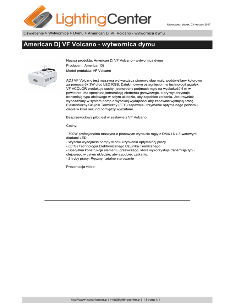Utworzono: piątek, 03 marzec 2017 Oświetlenie > Wytwornice > Dymu > American Dj VF Volcano - wytwornica dymu American Dj VF Volcano - wytwornica dymu Nazwa produktu: American Dj VF Volcano - wytwornica dymu Producent: American Dj Model produktu: VF Volcano ADJ VF Volcano jest maszyną wytwarzjącą pionowy słup mgły, podświetlany kolorowo za pomocą 6x 3W diod LED RGB. Dzięki nowym osiągnięciom w technologii grzałek, VF VCOLOR produkuje suchy, jednorodny podmuch mgły na wyskokość 4 m w powietrze. Ma specjalną konstrukcję elementu grzewczego, ktory wykorzystuje transmisję typu olejowego w całym układzie, aby zapobiec zatkaniu. Jest rownież wyposażony w system pomp o wysokiej wydajności aby zapewnić wydajną pracę. Elektroniczny Czujnik Termiczny (ETS) zapewnia utrzymanie optymalnego poziomu ciepła w kilka sekund pomiędzy wyrzutami. Bezprzewodowy pilot jest w zestawie z VF Volcano. Cechy: - 700W profesjonalna maszyna o pionowym wyrzucie mgly z DMX i 6 x 3-watowymi diodami LED - Wysoka wydajność pompy w celu uzyskania optymalnej pracy - (ETS) Technologia Elektronicznego Czujnika Termicznego - Specjalna konstrukcja elementu grzewczego, ktora wykorzystuje transmisję typu olejowego w całym układzie, aby zapobiec zatkaniu. - 2 tryby pracy: Ręczny i zdalne sterowanie Prezentacja video: http://www.lcdistribution.pl | [email protected] | | Strona 1/1