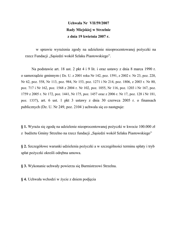 Uchwała Nr VII/59/2007 Rady Miejskiej w Strzelnie z dnia 19 kwietnia 2007 r. w sprawie wyrażenia zgody na udzielenie nieoprocentowanej pożyczki na rzecz Fundacji „Sąsiedzi wokół Szlaku Piastowskiego”. Na podstawie art. 18 ust. 2 pkt 4 i 9 lit. i oraz ustawy z dnia 8 marca 1990 r. o samorządzie gminnym ( Dz. U. z 2001 roku Nr 142, poz. 1591, z 2002 r. Nr 23, poz. 220, Nr 62, poz. 558, Nr 113, poz. 984, Nr 153, poz. 1271 i Nr 214, poz. 1806, z 2003 r. Nr 80, poz. 717 i Nr 162, poz. 1568 z 2004 r. Nr 102, poz. 1055, Nr 116, poz. 1203 i Nr 167, poz. 1759 z 2005 r. Nr 172, poz. 1441, Nr 175, poz. 1457 oraz z 2006 r. Nr 17, poz. 128 i Nr 181, poz. 1337), art. 6 ust. 1 pkt 3 ustawy z dnia 30 czerwca 2005 r. o finansach publicznych (Dz. U. Nr 249, poz. 2104 ) uchwala się co następuje: § 1. Wyraża się zgodę na udzielenie nieoprocentowanej pożyczki w kwocie 100.000 zł z budżetu Gminy Strzelno na rzecz fundacji „Sąsiedzi wokół Szlaku Piastowskiego” § 2. Szczegółowe warunki udzielenia pożyczki a w szczególności terminu spłaty i tryb spłat pożyczki określi odrębna umowa. § 3. Wykonanie uchwały powierza się Burmistrzowi Strzelna. § 4. Uchwała wchodzi w życie z dniem podjęcia Uzasadnienie W ramach Sektorowego programu Operacyjnego „Restrukturyzacja i modernizacja sektora żywnościowego oraz rozwoju obszarów wiejskich 2004 – 2006”, Działanie: 2.7 „Pilotażowy Program Leader+” powstała Lokalna Grupa Działania jako Fundacja „Sąsiedzi wokół Szlaku Piastowskiego”, która swoim zakresem działania obejmuje Gminę Strzelno. Poprzez udzielenie nieoprocentowanej pożyczki z budżetu gminy w kwocie 100.000 zł. Gmina Strzelno wspiera działania fundacji i umożliwia realizowanie zadań określonych przez Program Leader+ tj. uzyskanie wsparcia finansowego ze środków Unii Europejskiej. Uzyskane środki w ramach programu Leader+ posłużą do spłaty udzielonej przez gminę pożyczki. Wyrażenie zgody na udzielenie w/w pożyczki spowoduje konieczność wprowadzenia odpowiednich zmian w uchwale budżetowej wygenerowanie środków niezbędnych do udzielenia pożyczki. poprzez