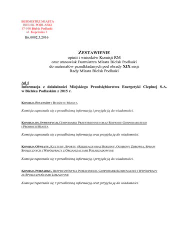 BURMISTRZ MIASTA BIELSK PODLASKI 17-100 Bielsk Podlaski ul. Kopernika 1 BR.0002.5.2016 ZESTAWIENIE opinii i wniosków Komisji RM oraz stanowisk Burmistrza Miasta Bielsk Podlaski do materiałów przedkładanych pod obrady XIX sesji Rady Miasta Bielsk Podlaski Ad 4 Informacja z działalności Miejskiego Przedsiębiorstwa Energetyki Cieplnej S.A. w Bielsku Podlaskim z 2015 r. KOMISJA FINANSÓW I BUDŻETU MIASTA Komisja zapoznała się z przedłożoną informacją i przyjęła ją do wiadomości. KOMISJA DS. INWESTYCJI, GOSPODARKI PRZESTRZENNEJ ORAZ ROZWOJU GOSPODARCZEGO I PROMOCJI MIASTA Komisja zapoznała się z przedłożoną informacją oraz przyjęła ją do wiadomości. KOMISJA OŚWIATY, KULTURY, SPORTU I REKREACJI ORAZ RODZINY, OCHRONY ZDROWIA, SPRAW SPOŁECZNYCH I WSPÓŁPRACY Z ORGANIZACJAMI POZARZĄDOWYMI Komisja zapoznała się z przedłożoną informacją i przyjęła ją do wiadomości. KOMISJA PORZĄDKU, BEZPIECZEŃSTWA PUBLICZNEGO, GOSPODARKI KOMUNALNEJ I WSPÓŁPRACY ZE SPOŁECZNOŚCIAMI LOKALNYMI Komisja zapoznała się z przedłożoną informacją oraz przyjęła ją do wiadomości. 2 Ad 5 Informacja z działalności Przedsiębiorstwa Komunalnego sp. z o.o. w Bielsku Podlaskim w 2015 r. KOMISJA FINANSÓW I BUDŻETU MIASTA Komisja zapoznała się z przedłożoną informacją i przyjęła ją do wiadomości. KOMISJA DS. INWESTYCJI, GOSPODARKI PRZESTRZENNEJ ORAZ ROZWOJU GOSPODARCZEGO I PROMOCJI MIASTA Członek Komisji Mirosław Gołębiowski zwrócił się z prośbą, by analiza była przedkładana Radnym do rozważenia, przed przedłożeniem taryfy dotyczącej wody oraz ścieków. Komisja zapoznała się z przedłożoną informacją oraz przyjęła ją do wiadomości. STANOWISKO BURMISTRZA MIASTA Burmistrz Miasta wyjaśnia, że wniosek został przekazanym do Przedsiębiorstwa Komunalnego w celu zajęcia stanowiska w przedmiotowej sprawie. KOMISJA OŚWIATY, KULTURY, SPORTU I REKREACJI ORAZ RODZINY, OCHRONY ZDROWIA, SPRAW SPOŁECZNYCH I WSPÓŁPRACY Z ORGANIZACJAMI POZARZĄDOWYMI Komisja zapoznała się z przedłożoną informacją i przyjęła ją do wiadomości. KOMISJA PORZĄDKU, BEZPIECZEŃSTWA PUBLICZNEGO, GOSPODARKI KOMUNALNEJ I WSPÓŁPRACY ZE SPOŁECZNOŚCIAMI LOKALNYMI Przewodniczący Komisji Kazimierz Henryk Leszczyński zwrócił się z prośbą o przygotowanie na sesję informacji na temat czego dotyczy zapis w przedłożonym materiale: „W poszczególnych grupach odbiorców procentowy wzrost lub spadek sprzedaży ilościowej ścieków do roku poprzedniego przedstawia się następująco: (…), inne cele – wzrost o 13,5 %”. STANOWISKO BURMISTRZA MIASTA Burmistrz Miasta informuje, że przedmiotowe pytania przesłano do Przedsiębiorstwa Komunalnego sp. z o.o. w celu przygotowania odpowiedzi. Członek Komisji Aleksander Bożko zwrócił się z prośbą, by w pobliżu skrzyżowania ul. Białowieskiej oraz ul. Traugutta postawić pojemnik na śmieci. STANOWISKO BURMISTRZA MIASTA Burmistrz Miasta informuje, że w pobliżu skrzyżowania ul. Białowieskiej oraz ul. Traugutta kosz został już ustawiony. Komisja zapoznała się z przedłożoną informacją oraz przyjęła ją do wiadomości. 3 Ad 6 Sprawozdanie z realizacji Rocznego programu współpracy Miasta Bielsk Podlaski z organizacjami pozarządowymi oraz innymi p[podmiotami, o których mowa w art.3 ust.3 ustawy z dnia 24 kwietnia 2003 r. o działalności pożytku publicznego i o wolontariacie za rok 2015. KOMISJA FINANSÓW I BUDŻETU MIASTA Komisja zapoznała się z przedłożonym sprawozdaniem i przyjęła je do wiadomości. KOMISJA DS. INWESTYCJI, GOSPODARKI PRZESTRZENNEJ ORAZ ROZWOJU GOSPODARCZEGO I PROMOCJI MIASTA Komisja zapoznała się z przedłożonym sprawozdaniem oraz przyjęła je do wiadomości. KOMISJA OŚWIATY, KULTURY, SPORTU I REKREACJI ORAZ RODZINY, OCHRONY ZDROWIA, SPRAW SPOŁECZNYCH I WSPÓŁPRACY Z ORGANIZACJAMI POZARZĄDOWYMI Komisja zapoznała się z przedłożonym sprawozdaniem i przyjęła je do wiadomości. KOMISJA PORZĄDKU, BEZPIECZEŃSTWA PUBLICZNEGO, GOSPODARKI KOMUNALNEJ I WSPÓŁPRACY ZE SPOŁECZNOŚCIAMI LOKALNYMI Komisja zapoznała się z przedłożonym sprawozdaniem oraz przyjęła je do wiadomości. 4 Ad 7 Podjęcie uchwały w sprawie wyrażenia zgody na sprzedaż nieruchomości stanowiącej własność Gminy Miejskiej Bielsk Podlaski, położonej w Bielsku podlaskim przy ul. Brańskiej. KOMISJA FINANSÓW I BUDŻETU MIASTA Komisja pozytywnie zaopiniowała projekt uchwały. KOMISJA DS. INWESTYCJI, GOSPODARKI PRZESTRZENNEJ ORAZ ROZWOJU GOSPODARCZEGO I PROMOCJI MIASTA Komisja pozytywnie zaopiniowała projekt uchwały. KOMISJA OŚWIATY, KULTURY, SPORTU I REKREACJI ORAZ RODZINY, OCHRONY ZDROWIA, SPRAW SPOŁECZNYCH I WSPÓŁPRACY Z ORGANIZACJAMI POZARZĄDOWYMI Komisja pozytywnie zaopiniowała projekt uchwały. KOMISJA PORZĄDKU, BEZPIECZEŃSTWA PUBLICZNEGO, GOSPODARKI KOMUNALNEJ I WSPÓŁPRACY ZE SPOŁECZNOŚCIAMI LOKALNYMI Komisja pozytywnie zaopiniowała projekt uchwały. 5 Ad 8 Podjęcie uchwały w sprawie wyrażenia zgody na dokonanie darowizny działek stanowiących własność Gminy Miejskiej Bielsk Podlaski, położonych w Bielsku Podlaskim w pasach drogowych dróg powiatowych na rzecz Powiatu Bielskiego w Bielsku Podlaskim. KOMISJA FINANSÓW I BUDŻETU MIASTA Komisja pozytywnie zaopiniowała projekt uchwały. KOMISJA DS. INWESTYCJI, GOSPODARKI PRZESTRZENNEJ ORAZ ROZWOJU GOSPODARCZEGO I PROMOCJI MIASTA Komisja pozytywnie zaopiniowała projekt uchwały. KOMISJA OŚWIATY, KULTURY, SPORTU I REKREACJI ORAZ RODZINY, OCHRONY ZDROWIA, SPRAW SPOŁECZNYCH I WSPÓŁPRACY Z ORGANIZACJAMI POZARZĄDOWYMI Komisja pozytywnie zaopiniowała projekt uchwały. KOMISJA PORZĄDKU, BEZPIECZEŃSTWA PUBLICZNEGO, GOSPODARKI KOMUNALNEJ I WSPÓŁPRACY ZE SPOŁECZNOŚCIAMI LOKALNYMI Komisja pozytywnie zaopiniowała projekt uchwały. 6 Ad 9 Podjęcie uchwały w sprawie dokonania zmian w budżecie miasta na 2016 r. KOMISJA FINANSÓW I BUDŻETU MIASTA Komisja pozytywnie zaopiniowała projekt uchwały. KOMIS