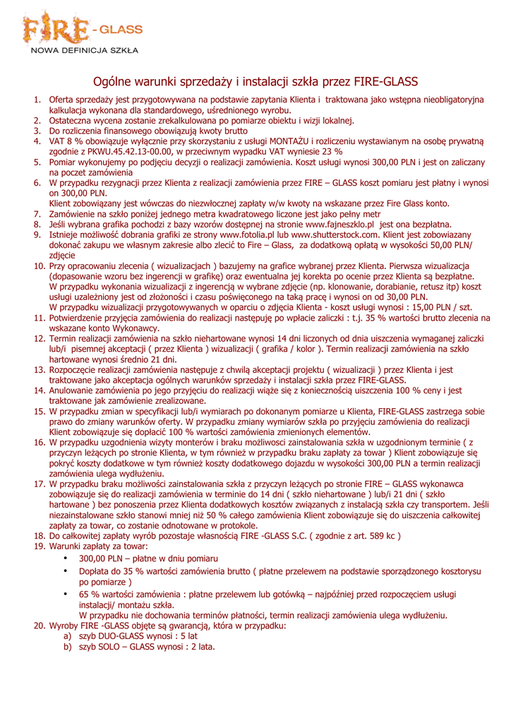 Ogólne warunki sprzedaży i instalacji szkła przez FIRE-GLASS 1. Oferta sprzedaży jest przygotowywana na podstawie zapytania Klienta i traktowana jako wstępna nieobligatoryjna kalkulacja wykonana dla standardowego, uśrednionego wyrobu. 2. Ostateczna wycena zostanie zrekalkulowana po pomiarze obiektu i wizji lokalnej. 3. Do rozliczenia finansowego obowiązują kwoty brutto 4. VAT 8 % obowiązuje wyłącznie przy skorzystaniu z usługi MONTAŻU i rozliczeniu wystawianym na osobę prywatną zgodnie z PKWU.45.42.13-00.00, w przeciwnym wypadku VAT wyniesie 23 % 5. Pomiar wykonujemy po podjęciu decyzji o realizacji zamówienia. Koszt usługi wynosi 300,00 PLN i jest on zaliczany na poczet zamówienia 6. W przypadku rezygnacji przez Klienta z realizacji zamówienia przez FIRE – GLASS koszt pomiaru jest płatny i wynosi on 300,00 PLN. Klient zobowiązany jest wówczas do niezwłocznej zapłaty w/w kwoty na wskazane przez Fire Glass konto. 7. Zamówienie na szkło poniżej jednego metra kwadratowego liczone jest jako pełny metr 8. Jeśli wybrana grafika pochodzi z bazy wzorów dostępnej na stronie www.fajneszklo.pl jest ona bezpłatna. 9. Istnieje możliwość dobrania grafiki ze strony www.fotolia.pl lub www.shutterstock.com. Klient jest zobowiazany dokonać zakupu we własnym zakresie albo zlecić to Fire – Glass, za dodatkową opłatą w wysokości 50,00 PLN/ zdjęcie 10. Przy opracowaniu zlecenia ( wizualizacjach ) bazujemy na grafice wybranej przez Klienta. Pierwsza wizualizacja (dopasowanie wzoru bez ingerencji w grafikę) oraz ewentualna jej korekta po ocenie przez Klienta są bezpłatne. W przypadku wykonania wizualizacji z ingerencją w wybrane zdjęcie (np. klonowanie, dorabianie, retusz itp) koszt usługi uzależniony jest od złożoności i czasu poświęconego na taką pracę i wynosi on od 30,00 PLN. W przypadku wizualizacji przygotowywanych w oparciu o zdjęcia Klienta - koszt usługi wynosi : 15,00 PLN / szt. 11. Potwierdzenie przyjęcia zamówienia do realizacji następuję po wpłacie zaliczki : t.j. 35 % wartości brutto zlecenia na wskazane konto Wykonawcy. 12. Termin realizacji zamówienia na szkło niehartowane wynosi 14 dni liczonych od dnia uiszczenia wymaganej zaliczki lub/i pisemnej akceptacji ( przez Klienta ) wizualizacji ( grafika / kolor ). Termin realizacji zamówienia na szkło hartowane wynosi średnio 21 dni. 13. Rozpoczęcie realizacji zamówienia następuje z chwilą akceptacji projektu ( wizualizacji ) przez Klienta i jest traktowane jako akceptacja ogólnych warunków sprzedaży i instalacji szkła przez FIRE-GLASS. 14. Anulowanie zamówienia po jego przyjęciu do realizacji wiąże się z koniecznością uiszczenia 100 % ceny i jest traktowane jak zamówienie zrealizowane. 15. W przypadku zmian w specyfikacji lub/i wymiarach po dokonanym pomiarze u Klienta, FIRE-GLASS zastrzega sobie prawo do zmiany warunków oferty. W przypadku zmiany wymiarów szkła po przyjęciu zamówienia do realizacji Klient zobowiązuje się dopłacić 100 % wartości zamówienia zmienionych elementów. 16. W przypadku uzgodnienia wizyty monterów i braku możliwosci zainstalowania szkła w uzgodnionym terminie ( z przyczyn leżących po stronie Klienta, w tym również w przypadku braku zapłaty za towar ) Klient zobowiązuje się pokryć koszty dodatkowe w tym również koszty dodatkowego dojazdu w wysokości 300,00 PLN a termin realizacji zamówienia ulega wydłużeniu. 17. W przypadku braku możliwości zainstalowania szkła z przyczyn leżących po stronie FIRE – GLASS wykonawca zobowiązuje się do realizacji zamówienia w terminie do 14 dni ( szkło niehartowane ) lub/i 21 dni ( szkło hartowane ) bez ponoszenia przez Klienta dodatkowych kosztów związanych z instalacją szkła czy transportem. Jeśli niezainstalowane szkło stanowi mniej niż 50 % całego zamówienia Klient zobowiązuje się do uiszczenia całkowitej zapłaty za towar, co zostanie odnotowane w protokole. 18. Do całkowitej zapłaty wyrób pozostaje własnością FIRE -GLASS S.C. ( zgodnie z art. 589 kc ) 19. Warunki zapłaty za towar: • 300,00 PLN – płatne w dniu pomiaru • Dopłata do 35 % wartości zamówienia brutto ( płatne przelewem na podstawie sporządzonego kosztorysu po pomiarze ) • 65 % wartości zamówienia : płatne przelewem lub gotówką – najpóźniej przed rozpoczęciem usługi instalacji/ montażu szkła. W przypadku nie dochowania terminów płatności, termin realizacji zamówienia ulega wydłużeniu. 20. Wyroby FIRE -GLASS objęte są gwarancją, która w przypadku: a) szyb DUO-GLASS wynosi : 5 lat b) szyb SOLO – GLASS wynosi : 2 lata.