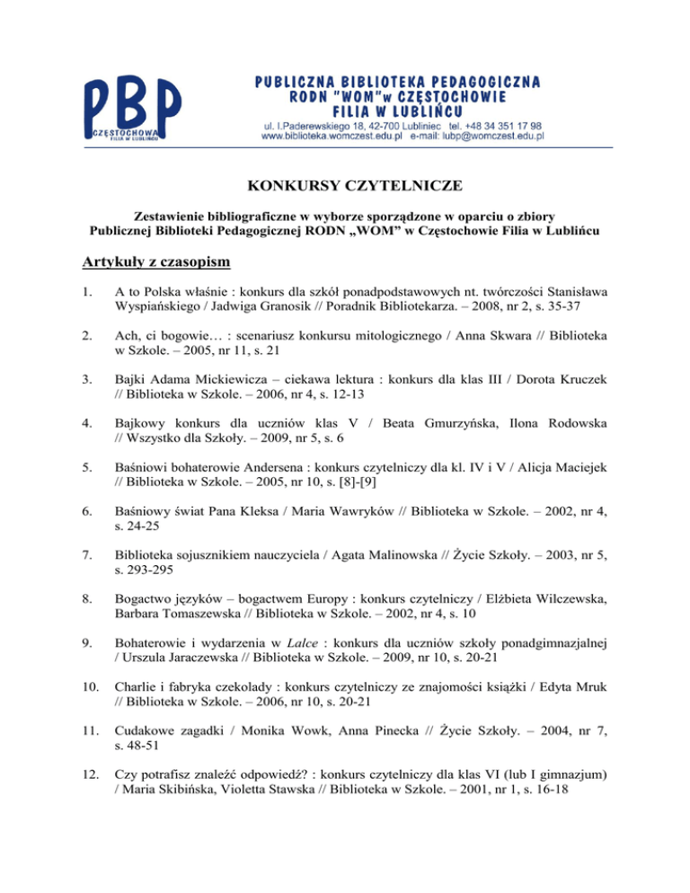 KONKURSY CZYTELNICZE Zestawienie bibliograficzne w wyborze sporządzone w oparciu o zbiory Publicznej Biblioteki Pedagogicznej RODN „WOM” w Częstochowie Filia w Lublińcu Artykuły z czasopism 1. A to Polska właśnie : konkurs dla szkół ponadpodstawowych nt. twórczości Stanisława Wyspiańskiego / Jadwiga Granosik // Poradnik Bibliotekarza. – 2008, nr 2, s. 35-37 2. Ach, ci bogowie… : scenariusz konkursu mitologicznego / Anna Skwara // Biblioteka w Szkole. – 2005, nr 11, s. 21 3. Bajki Adama Mickiewicza – ciekawa lektura : konkurs dla klas III / Dorota Kruczek // Biblioteka w Szkole. – 2006, nr 4, s. 12-13 4. Bajkowy konkurs dla uczniów klas V / Beata Gmurzyńska, Ilona Rodowska // Wszystko dla Szkoły. – 2009, nr 5, s. 6 5. Baśniowi bohaterowie Andersena : konkurs czytelniczy dla kl. IV i V / Alicja Maciejek // Biblioteka w Szkole. – 2005, nr 10, s. [8]-[9] 6. Baśniowy świat Pana Kleksa / Maria Wawryków // Biblioteka w Szkole. – 2002, nr 4, s. 24-25 7. Biblioteka sojusznikiem nauczyciela / Agata Malinowska // Życie Szkoły. – 2003, nr 5, s. 293-295 8. Bogactwo języków – bogactwem Europy : konkurs czytelniczy / Elżbieta Wilczewska, Barbara Tomaszewska // Biblioteka w Szkole. – 2002, nr 4, s. 10 9. Bohaterowie i wydarzenia w Lalce : konkurs dla uczniów szkoły ponadgimnazjalnej / Urszula Jaraczewska // Biblioteka w Szkole. – 2009, nr 10, s. 20-21 10. Charlie i fabryka czekolady : konkurs czytelniczy ze znajomości książki / Edyta Mruk // Biblioteka w Szkole. – 2006, nr 10, s. 20-21 11. Cudakowe zagadki / Monika Wowk, Anna Pinecka // Życie Szkoły. – 2004, nr 7, s. 48-51 12. Czy potrafisz znaleźć odpowiedź? : konkurs czytelniczy dla klas VI (lub I gimnazjum) / Maria Skibińska, Violetta Stawska // Biblioteka w Szkole. – 2001, nr 1, s. 16-18 13. Czy znam Harrego Pottera? : konkurs na temat cyklu powieściowego Joanne K. Rowling / Lucyna Skóra // Poradnik Bibliotekarza. – 2002, nr 4, s. 30-32 14. Czy znasz bajki Charles'a Perraulta? : konkurs dla uczniów klas I-III szkoły podstawowej / Ewa Szwedowska // Biblioteka w Szkole. – 2007, nr 9, s. 15-[17] 15. Czy znasz baśnie Andersena? : konkurs / Wioletta Juszczak // Biblioteka w Szkole. - 2005, nr 10, s. [10]-11 16. Czy znasz książki Kornela Makuszyńskiego? : konkurs czytelniczy / Elżbieta Wróbel // Poradnik Bibliotekarza. – 2001, nr 7-8, s. 35-37 17. Czy znasz legendę o syrenie? : konkurs ze znajomości Syreny Artura Oppmana / Janina Witek // Biblioteka w Szkole. – 2006, nr 11, s. 26 18. Czy znasz Mistrza Ildefonsa? / Maria Majewska // Poradnik Bibliotekarza. – 2003, nr 11, s. 32-33 19. Czy znasz „Opowieść wigilijną”? : konkurs dla klasy VI / Janina Witek // Biblioteka w Szkole. – 2005, nr 10, s. 5 20. Czy znasz tę baśń? : konkurs / Bogumiła Pierzchanowska // Biblioteka w Szkole. - 2002, nr 4, s. 26 21. Czy znasz tę książkę, tego bohatera, tę przygodę? : konkurs czytelniczy dla klas IV / Beata Jarosz // Poradnik Bibliotekarza. – 2007, nr 5, s. 35-38 22. Czy znasz twórczość Krystyny Siesickiej? : konkurs czytelniczy / Bogumiła Kobos // Biblioteka w Szkole. – 2003, nr 10, s. 20 23. Czy znasz Żabę? : konkurs czytelniczy ze znajomości książki Małgorzaty Musierowicz / Anna Marek // Biblioteka w Szkole. – 2007, nr 12, s. [12]-[13] 24. Czytanie to moja pasja : konkurs na plakat / Dobrochna Błażejczak // Biblioteka w Szkole. – 2009, nr 10, s. 23 25. Czytelniczy konkurs walentynkowy / Agnieszka Pawlak // Biblioteka w Szkole. – 2003, nr 12, s. 19 26. Do biegu. Gotowi? Start! : relacja z lekkoatletycznych mistrzostw świata – propozycja konkursu szkolnego dla klas IV-VI / Anna Skwara // Biblioteka w Szkole. – 2006, nr 4, s. 16-17 27. Dzieci z Bullerbyn : konkurs czytelniczy dla klas trzecich / Bożena Małachowska // Biblioteka w Szkole. – 2003, nr 5, s. [14]-[15] 28. Gdzie jesteś Mały Książę? : konkurs literacki dla klasy I gimnazjum / Janina Witek // Biblioteka w Szkole. – 2009, nr 12, s. 28 Oprac. Anna Bidzińska-Kristof - nauczyciel bibliotekarz Publicznej Biblioteki Pedagogicznej RODN „WOM” w Częstochowie Filia w Lublińcu 1 29. Gdy do biblioteki przybywają nowi gimnazjaliści… // Język Polski w Gimnazjum. - 2003/2004, nr 1, s. 29-35 30. Gombrowicz wielkim pisarzem był : konkurs czytelniczy dotyczący twórczości Witolda Gombrowicza dla uczniów liceum / Maria Dymel // Poradnik Bibliotekarza. – 2004, nr 2, s. 24-25 31. Harry Potter : scenariusz konkursu / Krystyna Stępień // Biblioteka w Szkole. – 2002, nr 4, s. 23 32. Harry Potter i czara ognia : konkurs czytelniczy / Ewa Więcek // Biblioteka w Szkole. - 2004, nr 11, s. 22 33. Harry Potter i Insygnia Śmierci : konkurs czytelniczy / Adriana Grochala-Kopeć // Biblioteka w Szkole. – 2009, nr 6, s. 22-23 34. Harry Potter i Zakon Feniksa : konkurs czytelniczy / Adrianna Grochala-Kopeć // Biblioteka w Szkole. – 2004, nr 4, s. 30-31 35. Historia Akademii Pana Kleksa : konkurs czytelniczy dla klasy IV / Alicja Maciejek // Biblioteka w Szkole. – 2006, nr 2, s. 23-25 36. Jak organizuję konkurs czytelniczy w klasach I-III / Alicja Górecka // Nauczanie Początkowe. – 2000/2001, nr 1, s. 85-98 37. Jaka to bajka? : konkurs dla uczniów klasy I szkoły podstawowej z okazji pasowania na czytelnika / Urszula Szczęśniak // Biblioteka w Szkole. – 2006, nr 12, s. 20-21 38. Jestem użytkownikiem biblioteki : minikonkurs / Elżbieta Izydorkiewicz // Biblioteka w Szkole. – 2006, nr 9, s. 21 39. Kamienie na szaniec – bez tajemnic : konkurs czytelniczy / Lucyna Stachowiak // Biblioteka w Szkole. – 2006, nr 4, s. 26 40. Kocham Ciebie, Mamo : scenariusz konkursu recytatorskiego dla klas III / Alina Wilczek, Teresa Kozak // Biblioteka w Szkole. – 2005, nr 2, s. 15-16 41. Konkurs czytelniczy na lekcji języka polskiego / Marta Osińska // Język Polski w Szkole IV-VI. – 2003/2004, nr 4, s. 52-61 42. Konkurs literacki dla uczniów gimnazjum pt. „… zapyt