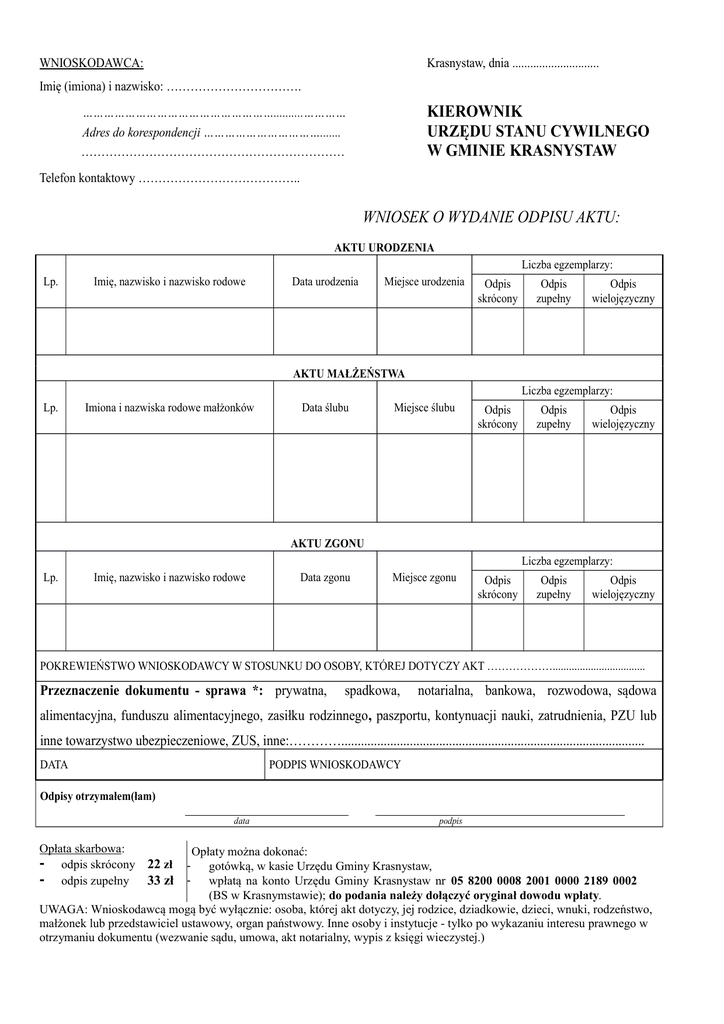 WNIOSKODAWCA: Krasnystaw, dnia ............................. Imię (imiona) i nazwisko: ……………………………. KIEROWNIK URZĘDU STANU CYWILNEGO W GMINIE KRASNYSTAW ………………………………………………..........………… Adres do korespondencji ……………………………....... ………………………………………………………… Telefon kontaktowy ………………………………….. WNIOSEK O WYDANIE ODPISU AKTU: AKTU URODZENIA Liczba egzemplarzy: Lp. Imię, nazwisko i nazwisko rodowe Data urodzenia Miejsce urodzenia Odpis skrócony Odpis zupełny Odpis wielojęzyczny AKTU MAŁŻEŃSTWA Liczba egzemplarzy: Lp. Imiona i nazwiska rodowe małżonków Data ślubu Miejsce ślubu Odpis skrócony Odpis zupełny Odpis wielojęzyczny AKTU ZGONU Liczba egzemplarzy: Lp. Imię, nazwisko i nazwisko rodowe Data zgonu Miejsce zgonu Odpis skrócony Odpis zupełny Odpis wielojęzyczny POKREWIEŃSTWO WNIOSKODAWCY W STOSUNKU DO OSOBY, KTÓREJ DOTYCZY AKT ……………….................................. Przeznaczenie dokumentu - sprawa *: prywatna, spadkowa, notarialna, bankowa, rozwodowa, sądowa alimentacyjna, funduszu alimentacyjnego, zasiłku rodzinnego, paszportu, kontynuacji nauki, zatrudnienia, PZU lub inne towarzystwo ubezpieczeniowe, ZUS, inne:…………............................................................................................. DATA PODPIS WNIOSKODAWCY Odpisy otrzymałem(łam) data Opłata skarbowa: - odpis skrócony 22 zł - odpis zupełny 33 zł podpis Opłaty można dokonać: gotówką, w kasie Urzędu Gminy Krasnystaw, wpłatą na konto Urzędu Gminy Krasnystaw nr 05 8200 0008 2001 0000 2189 0002 (BS w Krasnymstawie); do podania należy dołączyć oryginał dowodu wpłaty. UWAGA: Wnioskodawcą mogą być wyłącznie: osoba, której akt dotyczy, jej rodzice, dziadkowie, dzieci, wnuki, rodzeństwo, małżonek lub przedstawiciel ustawowy, organ państwowy. Inne osoby i instytucje - tylko po wykazaniu interesu prawnego w otrzymaniu dokumentu (wezwanie sądu, umowa, akt notarialny, wypis z księgi wieczystej.) -