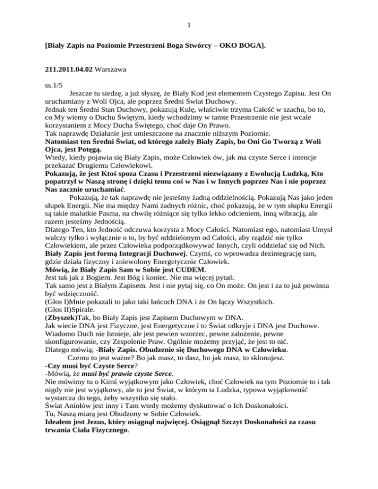1 [Biały Zapis na Poziomie Przestrzeni Boga Stwórcy – OKO BOGA]. 211.2011.04.02 Warszawa ss.1/5 Jeszcze tu siedzę, a już słyszę, że Biały Kod jest elementem Czystego Zapisu. Jest On uruchamiany z Woli Ojca, ale poprzez Średni Świat Duchowy. Jednak ten Średni Stan Duchowy, pokazują Kulę, właściwie trzyma Całość w szachu, bo to, co My wiemy o Duchu Świętym, kiedy wchodzimy w tamte Przestrzenie nie jest wcale korzystaniem z Mocy Ducha Świętego, choć daje On Prawo. Tak naprawdę Działanie jest umieszczone na znacznie niższym Poziomie. Natomiast ten Średni Świat, od którego zależy Biały Zapis, bo Oni Go Tworzą z Woli Ojca, jest Potęgą. Wtedy, kiedy pojawia się Biały Zapis, może Człowiek ów, jak ma czyste Serce i intencje przekazać Drugiemu Człowiekowi. Pokazują, że jest Ktoś spoza Czasu i Przestrzeni niezwiązany z Ewolucją Ludzką, Kto popatrzył w Naszą stronę i dzięki temu coś w Nas i w Innych poprzez Nas i nie poprzez Nas zacznie uruchamiać. Pokazują, że tak naprawdę nie jesteśmy żadną oddzielnością. Pokazują Nas jako jeden słupek Energii. Nie ma między Nami żadnych różnic, choć pokazują, że w tym słupku Energii są takie malutkie Pasma, na chwilę różniące się tylko lekko odcieniem, inną wibracją, ale razem jesteśmy Jednością. Dlatego Ten, kto Jedność odczuwa korzysta z Mocy Całości. Natomiast ego, natomiast Umysł walczy tylko i wyłącznie o to, by być oddzielonym od Całości, aby rządzić nie tylko Człowiekiem, ale przez Człowieka podporządkowywać Innych, czyli oddzielać się od Nich. Biały Zapis jest formą Integracji Duchowej. Czymś, co wprowadza dezintegrację tam, gdzie działa fizyczny i zniewolony Energetycznie Człowiek. Mówią, że Biały Zapis Sam w Sobie jest CUDEM. Jest tak jak z Bogiem. Jest Bóg i koniec. Nie ma więcej pytań. Tak samo jest z Białym Zapisem. Jest i nie pytaj się, co On może. On jest i za to już powinna być wdzięczność. (Głos I)Mnie pokazali to jako taki łańcuch DNA i że On łączy Wszystkich. (Głos II)Spirale. (Zbyszek)Tak, bo Biały Zapis jest Zapisem Duchowym w DNA. Jak wiecie DNA jest Fizyczne, jest Energetyczne i to Świat odkryje i DNA jest Duchowe. Wiadomo Duch nie Istnieje, ale jest pewien wzorzec, pewne założenie, pewne skonfigurowanie, czy Zespolenie Praw. Ogólnie możemy przyjąć, że jest to nić. Dlatego mówią; -Biały Zapis. Obudzenie się Duchowego DNA w Człowieku. Czemu to jest ważne? Bo jak masz, to dasz, bo jak masz, to sklonujesz. -Czy musi być Czyste Serce? -Mówią, że musi być prawie czyste Serce. Nie mówimy tu o Kimś wyjątkowym jako Człowiek, choć Człowiek na tym Poziomie to i tak nigdy nie jest wyjątkowy, ale to jest Świat, w którym ta Ludzka, typowa wyjątkowość wystarcza do tego, żeby wszystko się stało. Świat Aniołów jest inny i Tam wtedy możemy dyskutować o Ich Doskonałości. Tu, Naszą miarą jest Obudzony w Sobie Człowiek. Ideałem jest Jezus, który osiągnął najwięcej. Osiągnął Szczyt Doskonałości za czasu trwania Ciała Fizycznego. 2 Biały Zapis, to DNA stanowi Pomost ze Stwórcą. Wiadomo Stwórca Stworzył Ciało, Stwórca Stworzył Ducha(?). Odstawiliśmy Go prawie na tor boczny. Zachłystujemy się Bogiem Twórcą, Duchem Świętym, Ojcem. Ale tam jest tylko Wykładnia Praw, które wprowadzają Zmiany w Przestrzeni Stwórcy. Choć korzystaliśmy z Tamtych Praw nie mogliśmy w niczym Stwórcy dorównać. Dzisiaj to, co się stanie na Poziomie Przestrzeni Stwórczych, bo tutaj będzie jakaś łączność ze Stwórcą, z Jego pewnymi fragmentami, to jest i tak w Naszej Energetyce najważniejsze, najmocniejsze wydarzenie. Pokazują mi Łoże Lenariego. Stoi i wcale nie jest chory jak kiedyś. Stoi u góry i Promieniuje. Nie potrafię określić Twarzy. Jest młoda, a stara. Ma zwichrowaną, na boki przesuniętą brodę jakby wiał wiatr, a jednocześnie może i jej nie mieć, bo mogą to być chmury. Ma dziwne Światło. Tak jak u Jezusa wokół korony głowy, to u Niego sięga aż do wysokości trzeciego Czakramu, ale również promieniuje tymi Promyczkami cały, tylko na pozostałej części Ciała i między rękami słabiej. Najsilniej ta ogromna korona sięgająca Głowy i do połowy brzucha i dłonie. Reszta mniej. My jesteśmy Kolumną tego Światełka i zaczynamy kręcić się na białej tafli z prawa na lewo i przez to, że Tu na dole kręci się to szybciej, a górne warstwy tego strumienia jeszcze nie ruszyły Strumień skręca się jak długi cukierek choinkowy. Zaczyna to powoli przypominać Energetyczny Strumień jakby nić DNA. Pełny, całkowicie skręcony, z Promyczkami walec. Powoli zaczynamy w tym uczestniczyć. Nasze Energie są dopasowywane. Nasza Istota powoli jest wyciągana w tę karuzelę. Tak jakbyśmy byli pod wpływem dziwnej temperatury rozdymani. Temperatura działa, a My powoli wyparowujemy stapiając się z tym DNA. Z tym słupem, który zakładamy, że jest DNA, bo napis wyraźnie się tutaj ukazał. Biały Zapis jest Wejściem –„Dostępem” do OKA BOGA. OKO BOGA jest ukryte i znajduje się wewnątrz Człowieka. Człowiek w ogóle nie potrafi z Niego korzystać, ale owe OKO, gdy Istnieje, czasem jak Człowiek osiąga pewne Stany, gdzie musi być włączona Czysta Świadomość, potrafi być przez Nie prowadzony. Wtedy, pokazują Głos Wewnętrzny, tu zaciskają pięść, jest silny, pewny i niewzruszenie pcha Go ku czemuś. Głos Wewnętrzny dodaje Człowiekowi Siły. Jak już Go usłyszy, to oznacza, że Człowiek będzie się Nim kierował, wytrwa. Usłyszy Go tylko Ktoś silny, a doda mu wszystko to, czego potrzebuje. Na końcu Drogi widzę Stwórcę. Ponieważ żartobliwie mówiąc zapomniano o Nim, to musimy wrócić do Początku. Ponieważ dla Nas dopóki Istnieje Dusza i Ciało, to On jest Najważniejszy. Nasz Bóg Stwórca. A Złota Kolumna, a Biali i Złoci Bracia są Jego Dziećmi, są Jego Promykami, które Jemu pomagały. Wszyscy 
