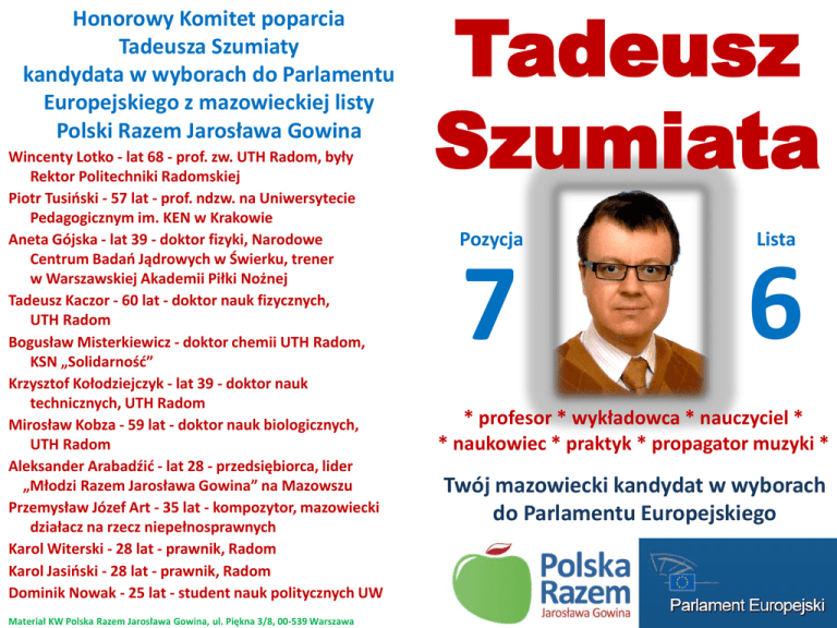 Honorowy Komitet poparcia Tadeusza Szumiaty kandydata w wyborach do Parlamentu Europejskiego z mazowieckiej listy Polski Razem Jarosława Gowina Wincenty Lotko - lat 68 - prof. zw. UTH Radom, były Rektor Politechniki Radomskiej Piotr Tusiński - 57 lat - prof. ndzw. na Uniwersytecie Pedagogicznym im. KEN w Krakowie Aneta Gójska - lat 39 - doktor fizyki, Narodowe Centrum Badań Jądrowych w Świerku, trener w Warszawskiej Akademii Piłki Nożnej Tadeusz Kaczor - 60 lat - doktor nauk fizycznych, UTH Radom Bogusław Misterkiewicz - doktor chemii UTH Radom, KSN „Solidarność” Krzysztof Kołodziejczyk - lat 39 - doktor nauk technicznych, UTH Radom Mirosław Kobza - 59 lat - doktor nauk biologicznych, UTH Radom Aleksander Arabadźić - lat 28 - przedsiębiorca, lider „Młodzi Razem Jarosława Gowina” na Mazowszu Przemysław Józef Art - 35 lat - kompozytor, mazowiecki działacz na rzecz niepełnosprawnych Karol Witerski - 28 lat - prawnik, Radom Karol Jasiński - 28 lat - prawnik, Radom Dominik Nowak - 25 lat - student nauk politycznych UW Materiał KW Polska Razem Jarosława Gowina, ul. Piękna 3/8, 00-539 Warszawa Tadeusz Szumiata Pozycja Lista 7 6 * profesor * wykładowca * nauczyciel * * naukowiec * praktyk * propagator muzyki * Twój mazowiecki kandydat w wyborach do Parlamentu Europejskiego Edukacja techniczna i kultura filarem Regionu, Polski i Unii Europejskiej PLANOWANE PRACE W KOMISJACH PARLAMENTU EUROPEJSKIEGO: KULTURY I EDUKACJI - laboratoria i wychowanie techniczne w szkołach UE „nie” dla zamykania szkół – tworzenie mniejszych klas pomoc materialna i lokalowa dla najlepszych szkół budowa filharmonii w miastach o średniej wielkości środki unijne na rozwój kultury i edukacji w regionie wsparcie unijne dla niepełnosprawnych i sportu PRZEMYSŁU, BADAŃ NAUKOWYCH I ENERGII - koniec cięć w programach nauczania na studiach ścisła współpraca uczelni wyższych z przemysłem skuteczniejsze wparcie innowacyjności polskich firm odnawialne źródła energii = niezależność Polski ZMIANY W UNII EUROPEJSKIEJ : - „nie” dla unijnej dominacji i kosztownej biurokracji kluby narodowe i sojusze międzypaństwowe w PE europejskie standardy ale suwerenne rozwiązania środki unijne na rozwój zaniedbanych miast w UE „tak” dla jednomandatowych okręgów wyborczych prorodzinne prawo pracy w całej Unii Europejskiej Fakty z życiorysu kandydata: Profesor nadzwyczajny na Wydziale Mechanicznym Uniwersytetu TechnologicznoHumanistycznego w Radomiu Ukończone studia na Wydziale Fizyki Uniwersytetu Warszawskiego i doktorat w Instytucie Fizyki PAN w Warszawie Absolwent, nauczyciel i opiekun olimpijczyków w Liceum im. Jana Kochanowskiego w Radomiu Autor kilkudziesięciu prac z fizyki magnetyzmu, nanotechnologii, defektoskopii i ochrony środowiska Ponad 150 cytowań artykułów w czasopismach o zasięgu światowym Staże zagraniczne w Wielkiej Brytanii, Francji, Finlandii i Słowacji Konsultant naukowy firm w regionie radomskim i w Stanach Zjednoczonych Współorganizator festiwali muzycznych Członek Zarządu drużyny futbolu amerykańskiego Green Ducks Radom Działacz na rzecz niepełnosprawnych Wiek 44 lata, żonaty, ma syna Krzysztofa