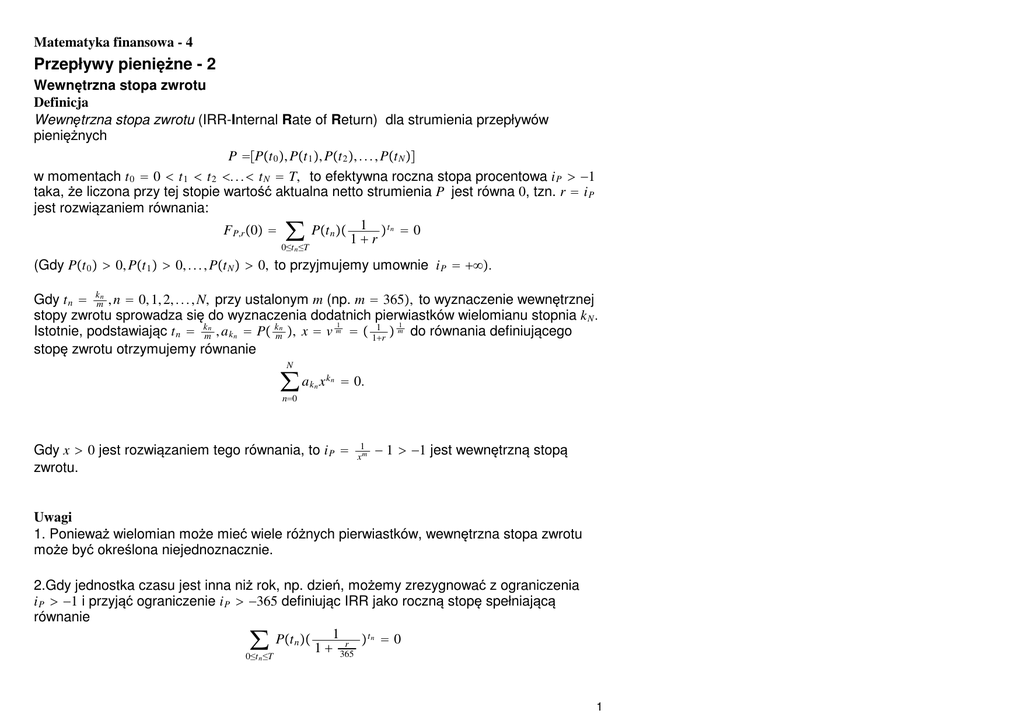 Matematyka finansowa - 4 Przepływy pieniężne - 2 Wewnętrzna stopa zwrotu Definicja Wewnętrzna stopa zwrotu (IRR-Internal Rate of Return) dla strumienia przepływów pieniężnych P =Pt 0 , Pt 1 , Pt 2 , . . . , Pt N  w momentach t 0 = 0 < t 1 < t 2 <. . . < t N = T, to efektywna roczna stopa procentowa i P > −1 taka, że liczona przy tej stopie wartość aktualna netto strumienia P jest równa 0, tzn. r = i P jest rozwiązaniem równania: F P,r 0 = ∑ Pt n  1  t n = 0 1+r 0≤t n ≤T (Gdy Pt 0  > 0, Pt 1  > 0, . . . , Pt N  > 0, to przyjmujemy umownie i P = +∞. Gdy t n = kmn , n = 0, 1, 2, . . . , N, przy ustalonym m (np. m = 365, to wyznaczenie wewnętrznej stopy zwrotu sprowadza się do wyznaczenia dodatnich pierwiastków wielomianu stopnia k N . 1 1 1 Istotnie, podstawiając t n = kmn , a k n = P kmn , x = v m =  1+r  m do równania definiującego stopę zwrotu otrzymujemy równanie N ∑ ak xk n n = 0. n=0 Gdy x > 0 jest rozwiązaniem tego równania, to i P = zwrotu. 1 xm − 1 > −1 jest wewnętrzną stopą Uwagi 1. Ponieważ wielomian może mieć wiele różnych pierwiastków, wewnętrzna stopa zwrotu może być określona niejednoznacznie. 2.Gdy jednostka czasu jest inna niż rok, np. dzień, możemy zrezygnować z ograniczenia i P > −1 i przyjąć ograniczenie i P > −365 definiując IRR jako roczną stopę spełniającą równanie ∑ Pt n  1 +1 r  tn = 0 365 0≤t n ≤T 1 Przykłady Niech: r - roczna stopa procentowa r ↦ F P,r 0 - wartość aktualna netto (PV) strumienia P, przy stopie r 1 1 F P,r 0 = P0 + P1 1 + P2 + P3 1+r 1 + r 2 1 + r 3 20 15 PV 10 5 -0.1 0 0.1 0.2 0.3 r 0.4 0.5 0.6 -5 Funkcja r ↦ F P,r 0 dla P = P0; P1; P2; P3 = −12; 3; 3; 15 20 15 PV 10 5 -0.1 0 0.1 0.2 0.3 r 0.4 0.5 0.6 -5 Funkcja r ↦ F P,r 0 dla P = P0; P1; P2; P3 = −12; −9; 18; 15 2 -0.1 0.2 0.1 r 0.3 0.2 0.4 0.5 0.6 0 -0.2 -0.4 -0.6 PV-0.8 -1 -1.2 -1.4 -1.6 Funkcja r ↦ F P,r 0 dla P = P0; P1; P2; P3 = −12; 15; 12; −15 0.1 0.2 r 0.3 0.4 0.5 0 -0.02 PV -0.04 -0.06 Funkcja r ↦ F P,r 0 dla P = P0; P1; P2; P3 = −12; 43; −51; 20 Pewną informację o maksymalnej liczbie dodatnich pierwiastków wielomianu daje następujące twierdzenie: Twierdzenie (Kartezjusza - Harriota) K Liczba dodatnich pierwiastków (pierwiastek k −krotny liczymy k razy) wielomianu ∑ a k x k nie k=0 jest większa od liczby zmian znaku w ciągu a 0 , a 1 , . . . , a K i różni się od niej o liczbę parzystą . 3 Zadanie Udowodnić powyższe twierdzenie. Wskazówka Najpierw udowodnić następujące lematy: 1) Jeśli w ciągu b 0 , b 1 , . . . , b n mamy b 0 b n < 0, to liczba zmian znaku w tym ciągu jest nieparzysta; jeśli b 0 b n > 0, to liczba zmian znaku jest parzysta. 2) Jeśli wielomian Qx pomnożymy przez x − c, gdzie c > 0, to liczba zmian znaku w ciągu współczynników zmieni się o liczbę nieparzystą (liczba zmian znaku w ciągu współczynników wielomianu Qxx − c różni się od liczby zmian znaku w ciągu współczynników wielomianu Qx o liczbę nieparzystą) następnie skorzystać z rozkładu wielomianu na czynniki liniowe oraz nierozkładalne stopnia 2. Wniosek Jeśli dla 0 ≤ k 0 < k 1 <. . . < k m−1 < k m <. . . < k N mamy a k 0 < 0, a k 1 < 0, . . . , a k m−1 < 0, a k m > 0, . . . , a k N > 0, N to wielomian Wx = ∑ a k n x k n ma dokładnie jeden pierwiastek dodatni. n=0 Dowód wniosku Na mocy twierdzenia Kartezjusza - Harriota wielomian Wx ma nie więcej niż jeden pierwiastek dodatni. Pozostaje wykazać, że istnieje pierwiastek dodatni. Mamy lim+ x→0 Wx = lim+ x→0 x k0 N ∑ a k x k −k n n 0 = a k 0 < 0, n=0 zatem istnieje c > 0 takie, że Wc < 0. Ponadto, N lim Wx = lim x kN x→∞ x→∞ ∑ ak n=0 n 1 x k N −k n zatem istnieje d > c takie, że Wd > 0. Z własności Darboux, istnieje x 0 ∈ c, d, takie, że Wx 0  = 0. = ∞, ■ 4 Wniosek Gdy w strumieniu przepływów P ostatni wydatek poprzedza pierwszy wpływ, tzn. Pt 0  < 0, Pt 1  < 0, . . . , Pt m−1  < 0, Pt m  > 0, Pt m+1  > 0, . . . , Pt N  > 0, (albo odwrotnie), to wewnętrzna stopa zwrotu i P jest określona jednoznacznie. Dla dowolnej liczby rzeczywistej p oznaczając: p + = maxp, 0, p − = max−p, 0 mamy p = p+ − p− Niech teraz: P + = Pt 0  + , Pt 1  + , . . . , Pt N  +  - strumień wpływów (Cash Input Flows), P − = Pt 0  − , Pt 1  − , . . . , Pt N  −  - strumień wydatków (Cash Output Flows). Zatem P = P+ − P− F P,i P 0 = F P + ,i P 0 − F P − ,i P 0 = 0 i zachodzi równość: F P + ,i P 0 = ∑ Pt n  +  1 tn 1 + iP ∑ Pt n  −  1  t n = F P − ,i 0 P 1 + iP 0≤t n ≤T = 0≤t n ≤T tj. wewnętrzna stopa zwrotu jest taką stopą, przy której suma zdyskontowanych wpływów jest równa sumie zdyskontowanych wydatków. Uwaga Dla strumienia P̂ ciągłych płatności z intensywnością t  pt, t ∈ 0, T, przy kapitale początkowym F0 = P0 , wewnętrzna stopa zwrotu i P jest zdefiniowana jako rozwiązanie x = i P równania T 1 P0 + ∫ ps ds = 0 1 + x s 0 5 Zadanie Wyznaczyć i P (np. metodą Newtona) przy stałej intensywności pt ≡ 30, T = 5, P0 = −100, tj. rozwiązać równanie − 100 + ∫ 301 + x −s ds = 0 5 0 , Solution is: x = 0. 191 060  : − 100 + 30x 5 + 10x + 10x + 5x 5+ x ln1 + x1 + x , Solution is: x = 0. 191 060  2 3 4 =0 Zmodyfikowana wewnętrzna stopa zwrotu (Modified Internal Rate of Return), dla strumienia przepływów pieniężnych P = Pt 0 , Pt 1 , Pt 2 , . . . , Pt N  w momentach t = t 0 , t 1 , t 2 , . . . , t N ; przy zakładanych stopach: i f - dla wydatków, i r - dla wpływów, to efektywna roczna stopa procentowa m P taka, że: F P + ,i r T = F P − ,i f 01 + m P  T−0 ∑ 0≤t n ≤T Pt n  +  1  t n 1 + i r  T 1 + ir = ∑ Pt n  −  0≤t n ≤T 1 tn 1 + if 1 + m P  T Stąd mP = ∑ Pt n  +  1+i1 r  t n 0≤t n ≤T ∑ Pt n  −  1+i1 f  t n 1 T 1 + i r  − 1 0≤t n ≤T Uwaga. Gdy i r = i f = i P , to m P = i P . 6