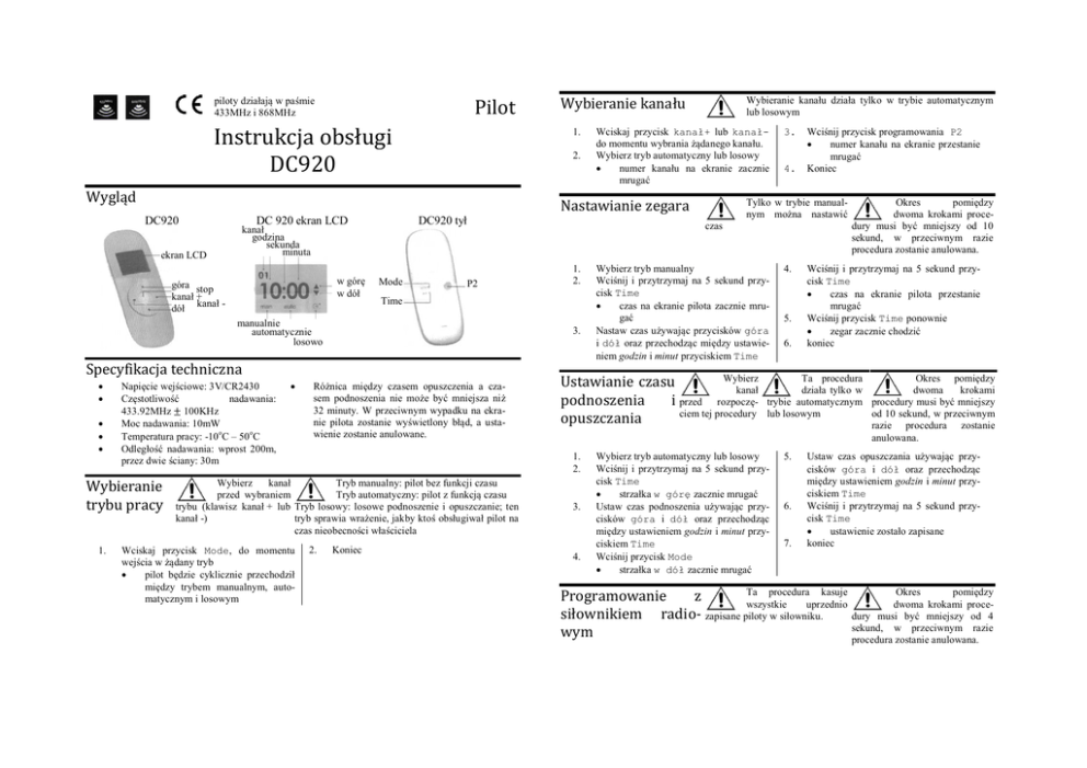 piloty działają w paśmie 433MHz i 868MHz Pilot Instrukcja obsługi DC920 1. 2. Wygląd ekran LCD DC 920 ekran LCD DC920 tył kanał godzina sekunda minuta w górę w dół góra stop kanał + dół kanał - Mode P2 Wybieranie trybu pracy 1. 3. Różnica między czasem opuszczenia a czasem podnoszenia nie może być mniejsza niż 32 minuty. W przeciwnym wypadku na ekranie pilota zostanie wyświetlony błąd, a ustawienie zostanie anulowane. 2. Koniec 4. 3. 4. Wciśnij przycisk programowania P2 numer kanału na ekranie przestanie mrugać Koniec Tylko w trybie manualnym można nastawić Wybierz tryb manualny Wciśnij i przytrzymaj na 5 sekund przycisk Time czas na ekranie pilota zacznie mrugać Nastaw czas używając przycisków góra i dół oraz przechodząc między ustawieniem godzin i minut przyciskiem Time Wybierz Ustawianie czasu kanał podnoszenia i przed rozpoczęciem tej procedury opuszczania 1. 2. Wybierz kanał Tryb manualny: pilot bez funkcji czasu przed wybraniem Tryb automatyczny: pilot z funkcją czasu trybu (klawisz kanał + lub Tryb losowy: losowe podnoszenie i opuszczanie; ten kanał -) tryb sprawia wrażenie, jakby ktoś obsługiwał pilot na czas nieobecności właściciela Wciskaj przycisk Mode, do momentu wejścia w żądany tryb pilot będzie cyklicznie przechodził między trybem manualnym, automatycznym i losowym 1. 2. Time Specyfikacja techniczna Napięcie wejściowe: 3V/CR2430 Częstotliwość nadawania: 433.92MHz ± 100KHz Moc nadawania: 10mW Temperatura pracy: -10oC – 50oC Odległość nadawania: wprost 200m, przez dwie ściany: 30m 3. czas manualnie automatycznie losowo Wciskaj przycisk kanał+ lub kanałdo momentu wybrania żądanego kanału. Wybierz tryb automatyczny lub losowy numer kanału na ekranie zacznie mrugać Nastawianie zegara DC920 Wybieranie kanału działa tylko w trybie automatycznym lub losowym Wybieranie kanału 4. 5. 6. Okres pomiędzy dwoma krokami procedury musi być mniejszy od 10 sekund, w przeciwnym razie procedura zostanie anulowana. Wciśnij i przytrzymaj na 5 sekund przycisk Time czas na ekranie pilota przestanie mrugać Wciśnij przycisk Time ponownie zegar zacznie chodzić koniec Ta procedura Okres pomiędzy działa tylko w dwoma krokami trybie automatycznym procedury musi być mniejszy lub losowym od 10 sekund, w przeciwnym razie procedura zostanie anulowana. Wybierz tryb automatyczny lub losowy Wciśnij i przytrzymaj na 5 sekund przycisk Time strzałka w górę zacznie mrugać Ustaw czas podnoszenia używając przycisków góra i dół oraz przechodząc między ustawieniem godzin i minut przyciskiem Time Wciśnij przycisk Mode strzałka w dół zacznie mrugać 5. 6. 7. Ustaw czas opuszczania używając przycisków góra i dół oraz przechodząc między ustawieniem godzin i minut przyciskiem Time Wciśnij i przytrzymaj na 5 sekund przycisk Time ustawienie zostało zapisane koniec Ta procedura kasuje Okres pomiędzy Programowanie z wszystkie uprzednio dwoma krokami procesiłownikiem radio- zapisane piloty w siłowniku. dury musi być mniejszy od 4 sekund, w przeciwnym razie wym procedura zostanie anulowana. Ta procedura działa tylko w trybie manualnym. 1. 2. Włącz zasilanie siłownika siłownik wyemituje sygnał dźwiękowy Wciśnij dwukrotnie przycisk programowania P2 na pilocie przy każdym wciśnięciu siłownik wyemituje sygnał dźwiękowy 3. 4. Kasowanie pilota Wciśnij na pilocie przycisk: a) góra, aby siłownik kręcił się zgodnie z ruchem wskazówek zegara po kliknięciu przycisku góra; lub b) dół, aby siłownik kręcił się przeciwnie do ruchu wskazówek zegara po kliknięciu przycisku góra Koniec Informacje dodatkowe: nie wszystkie siłowniki emitują sygnały dźwiękowe - w takim przypadku należy przynajmniej raz spróbować wykonać procedurę programowania „na ślepo” Jeden odbiornik może Okres pomiędzy Programowanie z przechować maksymaldwoma krokami proceDC227, DC228 lub nie 20 kanałów różnych nadajni- dury musi być mniejszy od 10 ków, a jeden kanał nadajnika sekund, w przeciwnym razie DC136 może kontrolować maksymalnie procedura zostanie anulowana. 20 odbiorników 1. 2. 3. Włącz zasilanie odbiornika Wciśnij przycisk programowania P2 na odbiorniku dioda na odbiorniku zacznie mrugać Wciśnij stop na odbiorniku dioda na odbiorniku zacznie mrugać w sposób długi 4. 5. Wciśnij na pilocie przycisk góra dioda na odbiorniku przestanie mrugać Koniec Okres pomiędzy dwoma krokami procedury Programowanie pilomniejszy od 6 sekund, w przeciwnym razie ta jako dodatkowy zostanie anulowana. A – pilot już zaprogramowany B – pilot do zaprogramowania jako dodatkowy 1. 2. 3. Włącz zasilanie siłownika Wciśnij przycisk stop na pilocie A Wciśnij dwukrotnie przycisk programowania P2 na pilocie A 4. 5. musi być procedura Wciśnij przycisk programowania P2 na pilocie B siłownik wyemituje sygnał dźwiękowy Koniec 1. 2. 3. Ta procedura kasuje Okres pomiędzy również piloty dodatdwoma krokami procekowe w siłowniku/odbiorniku dury musi być mniejszy od 6 sekund, w przeciwnym razie procedura zostanie anulowana. Włącz zasilanie siłownika Wciśnij przycisk stop na pilocie Wciśnij przycisk programowania P2 na pilocie 4. 5. 6. Wciśnij przycisk stop na pilocie Wciśnij przycisk programowania P2 na pilocie siłownik wyemituje sygnał dźwiękowy Koniec