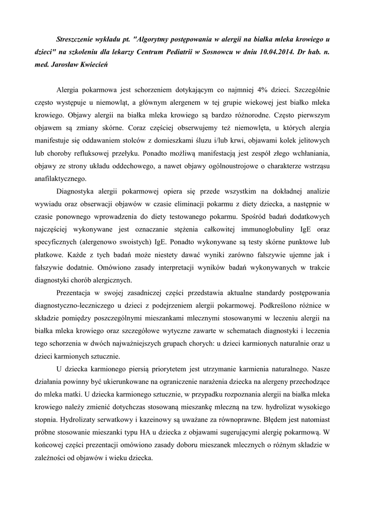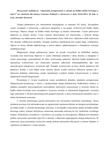Streszczenie wykładu pt. "Algorytmy postępowania w alergii na białka mleka krowiego u dzieci" na szkoleniu dla lekarzy Centrum Pediatrii w Sosnowcu w dniu 10.04.2014. Dr hab. n. med. Jarosław Kwiecień Alergia pokarmowa jest schorzeniem dotykającym co najmniej 4% dzieci. Szczególnie często występuje u niemowląt, a głównym alergenem w tej grupie wiekowej jest białko mleka krowiego. Objawy alergii na białka mleka krowiego są bardzo różnorodne. Często pierwszym objawem są zmiany skórne. Coraz częściej obserwujemy też niemowlęta, u których alergia manifestuje się oddawaniem stolców z domieszkami śluzu i/lub krwi, objawami kolek jelitowych lub choroby refluksowej przełyku. Ponadto możliwą manifestacją jest zespół złego wchłaniania, objawy ze strony układu oddechowego, a nawet objawy ogólnoustrojowe o charakterze wstrząsu anafilaktycznego. Diagnostyka alergii pokarmowej opiera się przede wszystkim na dokładnej analizie wywiadu oraz obserwacji objawów w czasie eliminacji pokarmu z diety dziecka, a następnie w czasie ponownego wprowadzenia do diety testowanego pokarmu. Spośród badań dodatkowych najczęściej wykonywane jest oznaczanie stężenia całkowitej immunoglobuliny IgE oraz specyficznych (alergenowo swoistych) IgE. Ponadto wykonywane są testy skórne punktowe lub płatkowe. Każde z tych badań może niestety dawać wyniki zarówno fałszywie ujemne jak i fałszywie dodatnie. Omówiono zasady interpretacji wyników badań wykonywanych w trakcie diagnostyki chorób alergicznych. Prezentacja w swojej zasadniczej części przedstawia aktualne standardy postępowania diagnostyczno-leczniczego u dzieci z podejrzeniem alergii pokarmowej. Podkreślono różnice w składzie pomiędzy poszczególnymi mieszankami mlecznymi stosowanymi w leczeniu alergii na białka mleka krowiego oraz szczegółowe wytyczne zawarte w schematach diagnostyki i leczenia tego schorzenia w dwóch najważniejszych grupach chorych: u dzieci karmionych naturalnie oraz u dzieci karmionych sztucznie. U dziecka karmionego piersią priorytetem jest utrzymanie karmienia naturalnego. Nasze działania powinny być ukierunkowane na ograniczenie narażenia dziecka na alergeny przechodzące do mleka matki. U dziecka karmionego sztucznie, w przypadku rozpoznania alergii na białka mleka krowiego należy zmienić dotychczas stosowaną mieszankę mleczną na tzw. hydrolizat wysokiego stopnia. Hydrolizaty serwatkowy i kazeinowy są uważane za równoprawne. Błędem jest natomiast próbne stosowanie mieszanki typu HA u dziecka z objawami sugerującymi alergię pokarmową. W końcowej części prezentacji omówiono zasady doboru mieszanek mlecznych o różnym składzie w zależności od objawów i wieku dziecka.