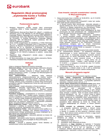 Regulamin Akcji promocyjnej „wyśmienite konto z Tchibo (kapsułki)” Postanowienia ogólne §1 1. 2. 3. 4. 5. Niniejszy Regulamin określa zasady Akcji promocyjnej „wyśmienite konto z Tchibo (kapsułki)” („Akcja promocyjna”, „Akcja”). Organizatorem Akcji jest Euro Bank S.A. („Bank”), z siedzibą we Wrocławiu, przy ul. Św. Mikołaja 72, 50-126 Wrocław, wpisany do Krajowego Rejestru Sądowego pod numerem KRS 0000025313, prowadzonego przez Sąd Rejonowy dla Wrocławia Fabrycznej we Wrocławiu, VI Wydział Gospodarczy Krajowego Rejestru Sądowego NIP: 521-008-25-38, kapitał zakładowy: 563 096 032,05 zł (opłacony w całości). Akcja została przygotowana we współpracy z Tchibo Warszawa Sp. z o.o. , z siedzibą w Warszawie, przy ul. Fabrycznej 5, spółką wpisaną do Rejestru Przedsiębiorców prowadzonego przez Sąd Rejonowy dla m. st. Warszawy w Warszawie, XIII Wydział Gospodarczy Krajowego Rejestru Sądowego pod numerem KRS 0000019739, NIP521-012-40-30, REGON 011567818, kapitał zakładowy 51 231 000,00 zł (opłacony w całości), zwaną dalej „Tchibo”. Regulamin Akcji („Regulamin”) określa prawa i obowiązki Uczestników Akcji. W Akcji promocyjnej nie mogą brać udziału pracownicy Banku, Pośrednicy kredytowi oraz ich pracownicy. Definicje §2 Użyte w niniejszym Regulaminie terminy oznaczają: Dokument zakupu- dokument potwierdzający dokonanie zakupów o łącznej wartości min. 50 zł, w tym co najmniej 1 opakowania kapsułek Cafissimo w Sklepie stacjonarnym lub Sklepie internetowym Tchibo – tj. paragon lub faktura(oryginał lub kserokopia dokumentu); Karta debetowa/Karta – debetowa karta płatnicza spersonalizowana, niespersonalizowana lub mobilna wydana Uczestnikowi do Konta założonego w ramach Akcji promocyjnej; Konto osobiste/Konto – rachunek bieżący w pakiecie Active lub Prestige założony przez Uczestnika w ramach Akcji Promocyjnej, prowadzony zgodnie z Regulaminem Konta dla osób fizycznych w Euro Banku S.A.; Limit w Koncie – kredyt odnawialny w Koncie osobistym; Placówka - jednostka organizacyjna Banku lub jednostka organizacyjna podmiotu, który zawarł z Bankiem umowę o współpracy w zakresie sprzedaży produktów Banku, prowadząca obsługę Klientów; Pośrednik kredytowy - przedsiębiorca w rozumieniu przepisów ustawy z dnia 23.04.1964 r. Kodeks cywilny, związany z Bankiem umową o współpracy w zakresie sprzedaży produktów bankowych, który w zakresie swojej działalności gospodarczej lub zawodowej uzyskuje od Banku korzyści majątkowe dokonując czynności faktycznych lub prawnych związanych z oferowaniem produktów Banku, przygotowaniem i zawieraniem Umowy; Sklep stacjonarny Tchibo – sklep należący do sp. z.o.o. Tchibo Warszawa z siedzibą na terytorium Polski. Adresy sklepów wskazane są stronie internetowej www. tchibo.pl; Sklep internetowy Tchibo - sklep prowadzony przez spółkę z.o.o. Tchibo Warszawa, działający pod adresem www.tchibo.pl, za pośrednictwem którego sprzedawane są towary znajdujące się w jego ofercie przy wykorzystaniu Internetu; Transakcja bezgotówkowa – dokonanie płatności za towary lub usługi przy użyciu Karty; Uczestnik – pełnoletnia osoba fizyczna, posiadająca zdolność do czynności prawnych, która przystąpiła do Akcji promocyjnej i spełnia warunki Akcji; Wniosek - wniosek o zawarcie umowy Konta składany za pośrednictwem strony internetowej Banku. Czas trwania, warunki uczestnictwa i zasady w Akcji promocyjnej §3 1. Akcja promocyjna trwa w okresie od 16.08.2016 r. do 31.10.2016 r. („Okres trwania Akcji promocyjnej”). 2. Uczestnikiem Akcji promocyjnej („Uczestnik”) może być osoba, która spełni łącznie poniższe warunki: a) w okresie trwania Akcji promocyjnej dokonała zakupów o łącznej wartości min. 50 zł, w tym min. 1 opakowania kapsułek Cafissimo w Sklepie stacjonarnym lub internetowym Tchibo oraz posiada Dokument zakupu potwierdzający ten fakt; b) w okresie 12 miesięcy przed dniem przystąpienia do Akcji promocyjnej nie była posiadaczem lub współposiadaczem konta dla osób fizycznych prowadzonego przez Bank, c) w Okresie trwania Akcji promocyjnej prawidłowo i w sposób kompletny wypełni formularz zgłoszeniowy do udziału w Akcji promocyjnej podając w nim następujące dane: imię, nazwisko, pesel, numer telefonu kontaktowego, adres email, numer Dokumentu zakupu datę jego wystawienia oraz kwotę zakupów wskazaną w tym Dokumencie; Formularz zgłoszeniowy dostępny jest na stronie internetowej http://www.konto-eurobank.pl/tchibo oraz w Placówkach. d) zawrze z Bankiem umowę Konta na zasadach i w terminie określonych w ust. 3 poniżej. 3. Umowa Konta w ramach Akcji promocyjnej może zostać zawarta: a) za pośrednictwem Wniosku – po wypełnieniu formularza zgłoszeniowego w formie elektronicznej o którym mowa w ust. 2 pkt. c) niniejszego paragrafu, Uczestnik zostanie przekierowany na stronę internetową Banku, na której po wybraniu jednej z metod zawarcia umowy - w formie elektronicznej poprzez przelew z innego banku lub za pośrednictwem kuriera – wypełni i złoży Wniosek do dnia 31.10.2016 r., a następnie w terminie do dnia 14.11.2016r. zawrze umowę Konta. b) w Placówce Banku do dnia 31.10.2016r. wypełni formularz zgłoszeniowy, o którym mowa w ust. 2 pkt c) niniejszego paragrafu, zawnioskuje o Konto i zawrze umowę Konta. Warunki otrzymania nagród §4 1. Uczestnik, uprawniony jest do otrzymania nagrody w postaci: a) braku opłaty miesięcznej za prowadzenie Konta założonego w ramach Akcji przez okres jednego roku od dnia zawarcia z Bankiem umowy Konta - w przypadku spełnienia warunków, o których mowa w §3 ust. 2 i 3. b) zwrotu opłaty miesięcznej za posiadanie Karty przez okres jednego roku od dnia zawarcia z Bankiem umowy Konta - w przypadku spełnienia warunków o których mowa w §3 ust. 2 i 3 oraz pod warunkiem, że wniosek o wydanie Karty do Konta został złożony w tym samym terminie w