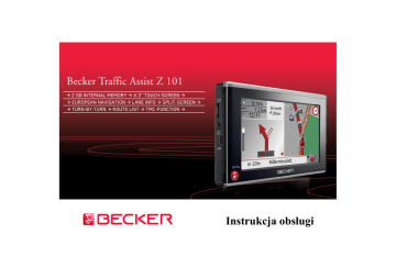 Instrukcja obsługi Spis treści >>> SPIS TREŚCI Spis treści Wskazówki dotyczace bezpieczeństwa Traffic Assist Użytkowanie >D > GB >F Nawigacja Rozpakowywanie zestawu Traffic Assist >I Sprawdzanie zawartości Reklamacje Sposób postępowania z opakowaniem >E >P Opis urządzenia Traffic Assist - urządzenie podstawowe Kabel zasilania z gniazda zapalniczki Akumulator Kabel połączeniowy USB Uchwyt Dane map Akcesoria Zasilacz Zewnętrzna antena GPS Słuchawki > NL > DK >S >N > FIN > TR Wskazówki dotyczące dokumentacji Quick Start Guide Instrukcja obsługi > GR Rejestracja Naprawa Emisje i utylizacja Przeglad elementów systemu Traffic Assist Konserwacja i czyszczenie > PL > CZ >H > SK 2 2 4 6 6 6 6 6 7 7 7 8 8 8 8 8 8 9 9 9 9 Deklaracja jakości akumulatora Deklaracja jakości wyświetlacza Uruchamianie Zasilanie Zasilanie przy użyciu akumulatorów Podłączanie do gniazda zapalniczki Podłączanie do gniazdka sieciowego Podłączanie napięcia zasilania Antena TMC Antena GPS Antena urządzenia Podłączanie zewnętrznej anteny Memory Card Wkładanie karty pamięci Wyjmowanie karty pamięci Uchwyt 9 Mocowanie uchwytu Mocowanie na przedniej szybie Regulowanie uchwytu Zakładanie systemu Traffic Assist Zdejmowanie urządzenia Traffic Assist 9 9 Włączanie i wyłączanie systemu Traffic Assist 10 10 10 11 14 Włączanie Wyłączanie Podstawowe informacje o ekranie dotykowym Obsługa Kalibracja 15 15 15 15 16 16 17 17 17 17 17 18 18 18 18 19 19 20 20 20 20 20 20 21 22 22 22 Podstawowe informacje na temat menu Wprowadzanie danych przy użyciu menu Wpisywanie znaków Akceptowanie propozycji Przewijanie list Znaki specjalne Wpisywanie liczb Przełączanie na pisownię wielkimi / małymi literami Usuwanie znaków Wpisywanie znaku spacji Klawisz Becker Kopiowanie plików Program instalacyjny Kopiowanie przy użyciu złącza USB Kopiowanie map Sposób postępowania w razie usterek Tryb nawigacji Co to jest nawigacja? Okno szybkiego dostępu Struktura okna szybkiego dostępu Menu wprowadzania celu i widok mapy Lista celów Stosowane ikony Obsługa okna szybkiego dostępu Uruchamianie z aktualnym celem Przewijanie pamięci celów Wyświetlanie lub edytowanie celu 22 22 23 23 23 24 24 24 25 25 25 25 25 26 26 26 27 27 28 28 28 28 29 29 29 29 29 SPIS TREŚCI Przejście do widoku mapy Wyświetlanie aktualnej pozycji Otwieranie menu wprowadzania celu Menu wprowadzania celu Struktura menu wprowadzania celu Adres Cel specjalny Ustawienia Menu wprowadzania celu: Adres Wybór kraju Wybór adresu i uruchamianie Anulowanie nawigacji Menu wprowadzania celu: Cel specjalny Cel specjalny: ...w okolicy Cel specjalny: W calym kraju Cel specjalny: W miejscowości Menu wprowadzania celu: Ustawienia Przycisk Inform./trasa Przycisk Opcje trasy Przycisk Prędkość, Przycisk Jasność Przycisk Energia Przycisk Glośność Przycisk Dźwięki Przycisk Format Przycisk Strefa czasowa Przycisk Język Przeglądanie Przycisk Informacje Przycisk Automat. wyłącz. Przycisk Kalibrację Przycisk Ustawienia fabrycz. 30 31 31 31 31 31 31 31 32 32 32 38 38 38 39 40 41 41 43 44 44 45 45 46 46 46 47 47 47 48 48 48 Co to jest nawigacja dynamiczna? Prezentacja komunikatów TMC na mapie Korzystanie z funkcji TMC Odczyt komunikatu Wyświetl daną ulicę na mapie Aktualizacja komunikatów Widok mapy Struktura widoku mapy Widok mapy bez naprowadzania na punkt docelowy Prowadzenie do celu przy widoku całej mapy Podzielony ekran przy prowadzeniu do celu Prowadzenie do celu za pomocą strzałek Obsługa widoku mapy Powtarzanie ostatniej zapowiedzi Zmiana głośności komunikatu Skalowanie mapy (pasek narzędzi) Widok mapy z paskiem narzędzi Przycisk opcji nawigacji Widok/edycja opisu drogi Przycisk opcji mapy Przycisk POI na trasie Przycisk TMC Przycisk Dzień / Noc Słownik terminów Hasła Dane techniczne ZAPAMIĘTAJ Deklaracja zgodności WE 49 49 50 50 51 51 51 Utylizacja urządzenia Utylizacja akumulatorów Obowiązek informacji w myśl rozporządzenia w sprawie akumulatorów i baterii (Batterieverordnung – BattV) Wyjmowanie akumulatora >>> 66 67 >D > GB >F 67 67 >I 51 >E 51 >P 52 > NL 52 53 54 54 54 54 55 55 56 57 58 59 59 60 62 64 65 65 > DK >S >N Dane i informacje zawarte w tym dokumencie mogą ulec zmianie bez powiadomienia. Żadna część tego dokumentu nie może być powielana ani przekazywana w jakimkolwiek celu bez pisemnego pozwolenia firmy HARMAN/BECKER Automotive Systems GmbH. Wszystkie dane techniczne, rysunki itd. są chronione prawem autorskim. © Copyright 2008, HARMAN/BECKER Automotive Systems GmbH Wszelkie prawa zastrzeżone. > FIN > TR > GR > PL > CZ >H > SK 3 >>> WSKAZÓWKI DOTYCZACE BEZPIECZEŃSTWA Wskazówki dotyczace bezpieczeństwa !Wskazówki dotyczące bezpieczeństwa >D • Urządzenie można obsługiwać tylko wtedy, gdy zezwala na to aktualna sytuacja w ruchu drogowym i gdy użytkownik jest całkowicie pewny, że nie naraża w ten sposób samego siebie, pasażerów ani pozostałych uczestników ruchu drogowego na zagrożenie, przeszkody lub utrudnienia. > GB >F >I • W każdym przypadku zastosowanie mają przepisy ruchu drogowego. Wprowadzanie danych miejsca docelowego może odbywać się wyłącznie podczas postoju pojazdu. >E • System nawigacyjny stanowi jedynie środek pomocniczy, dane/informacje mogą być w konkretnych przypadkach obarczone błędami. Kierowca musi w każdej sytuacji rozstrzygnąć samodzielnie, czy skorzysta z podanych informacji. Wyklucza się odpowiedzialność z tytułu błędnych wskazań systemu nawigacyjnego. Ze względu na zmieniające się znaki drogowe lub też rozbieżności danych może dojść do udzielenia nieprecyzyjnych lub błędnych instrukcji. Dlatego też należy zawsze zwracać uwagę na konkretne oznakowanie oraz regulowanie ruchu drogowego. System nawigacyjny nie może służyć zwłaszcza jako środek pomagający w orientacji w przypadku złej widoczności. >P > NL > DK >S >N • Urządzenie może być użytkowane wyłącznie zgodnie z przeznaczeniem. P