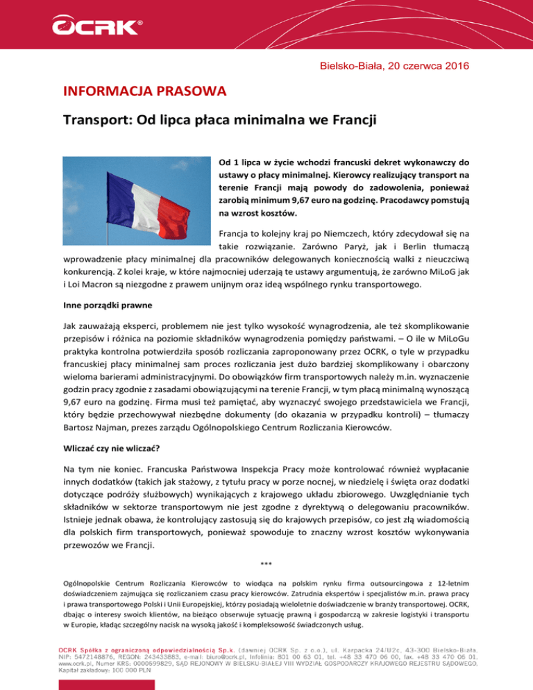 Bielsko-Biała, 20 czerwca 2016 INFORMACJA PRASOWA Transport: Od lipca płaca minimalna we Francji Od 1 lipca w życie wchodzi francuski dekret wykonawczy do ustawy o płacy minimalnej. Kierowcy realizujący transport na terenie Francji mają powody do zadowolenia, ponieważ zarobią minimum 9,67 euro na godzinę. Pracodawcy pomstują na wzrost kosztów. Francja to kolejny kraj po Niemczech, który zdecydował się na takie rozwiązanie. Zarówno Paryż, jak i Berlin tłumaczą wprowadzenie płacy minimalnej dla pracowników delegowanych koniecznością walki z nieuczciwą konkurencją. Z kolei kraje, w które najmocniej uderzają te ustawy argumentują, że zarówno MiLoG jak i Loi Macron są niezgodne z prawem unijnym oraz ideą wspólnego rynku transportowego. Inne porządki prawne Jak zauważają eksperci, problemem nie jest tylko wysokość wynagrodzenia, ale też skomplikowanie przepisów i różnica na poziomie składników wynagrodzenia pomiędzy państwami. – O ile w MiLoGu praktyka kontrolna potwierdziła sposób rozliczania zaproponowany przez OCRK, o tyle w przypadku francuskiej płacy minimalnej sam proces rozliczania jest dużo bardziej skomplikowany i obarczony wieloma barierami administracyjnymi. Do obowiązków firm transportowych należy m.in. wyznaczenie godzin pracy zgodnie z zasadami obowiązującymi na terenie Francji, w tym płacą minimalną wynoszącą 9,67 euro na godzinę. Firma musi też pamiętać, aby wyznaczyć swojego przedstawiciela we Francji, który będzie przechowywał niezbędne dokumenty (do okazania w przypadku kontroli) – tłumaczy Bartosz Najman, prezes zarządu Ogólnopolskiego Centrum Rozliczania Kierowców. Wliczać czy nie wliczać? Na tym nie koniec. Francuska Państwowa Inspekcja Pracy może kontrolować również wypłacanie innych dodatków (takich jak stażowy, z tytułu pracy w porze nocnej, w niedzielę i święta oraz dodatki dotyczące podróży służbowych) wynikających z krajowego układu zbiorowego. Uwzględnianie tych składników w sektorze transportowym nie jest zgodne z dyrektywą o delegowaniu pracowników. Istnieje jednak obawa, że kontrolujący zastosują się do krajowych przepisów, co jest złą wiadomością dla polskich firm transportowych, ponieważ spowoduje to znaczny wzrost kosztów wykonywania przewozów we Francji. *** Ogólnopolskie Centrum Rozliczania Kierowców to wiodąca na polskim rynku firma outsourcingowa z 12-letnim doświadczeniem zajmująca się rozliczaniem czasu pracy kierowców. Zatrudnia ekspertów i specjalistów m.in. prawa pracy i prawa transportowego Polski i Unii Europejskiej, którzy posiadają wieloletnie doświadczenie w branży transportowej. OCRK, dbając o interesy swoich klientów, na bieżąco obserwuje sytuację prawną i gospodarczą w zakresie logistyki i transportu w Europie, kładąc szczególny nacisk na wysoką jakość i kompleksowość świadczonych usług.