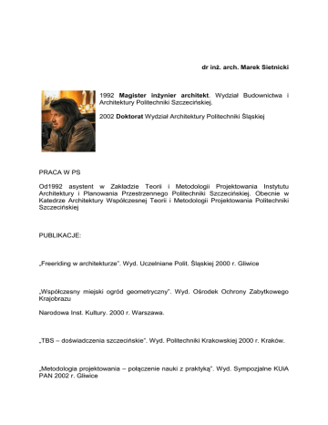 dr inż. arch. Marek Sietnicki 1992 Magister inżynier architekt. Wydział Budownictwa i Architektury Politechniki Szczecińskiej. 2002 Doktorat Wydział Architektury Politechniki Śląskiej PRACA W PS Od1992 asystent w Zakładzie Teorii i Metodologii Projektowania Instytutu Architektury i Planowania Przestrzennego Politechniki Szczecińskiej. Obecnie w Katedrze Architektury Współczesnej Teorii i Metodologii Projektowania Politechniki Szczecińskiej PUBLIKACJE: „Freeriding w architekturze”. Wyd. Uczelniane Polit. Śląskiej 2000 r. Gliwice „Współczesny miejski ogród geometryczny”. Wyd. Ośrodek Ochrony Zabytkowego Krajobrazu Narodowa Inst. Kultury. 2000 r. Warszawa. „TBS – doświadczenia szczecińskie”. Wyd. Politechniki Krakowskiej 2000 r. Kraków. „Metodologia projektowania – połączenie nauki z praktyką”. Wyd. Sympozjalne KUiA PAN 2002 r. Gliwice „Granice architektury – poza estetykę”. Wyd. Polit. Krakowskiej. 2003 r. Kraków „Dwa domy na krzyż”. Oficyna Wydawnicza Politechniki Wrocławskiej 2003 r. Wrocław Referat: „MIAST-CENTRUM-OBIEKT-MIASTO” MATERIAŁY KONFERENCYJNEIX MIĘDZYNARODOWEJ KONFERENCJI „MIASTO WMIEŚCIE” -Problemy kompozycji urbanistycznej” INSTYTUTU PROJEKTOWANIAURBANISTYCZNEGO WYDZIAŁU ARCHITEKTURY POLITECHNIKI KRAKOWSKIEJ. Kraków 14-15 maja 2004. CZASOPISMO TECHNICZNE seria ARCHITEKTURA. Wydawnictwo Politechniki Krakowskiej numer specjalny: 2-A/2004. (wspólnie z arch. M.Raczyńskim) Referat: „BUDYNEK APARTAMENTOWY W ŚWINOUJŚCIU – KATEGORIE PSYCHOPRZESTRZENNE” „XVI MIEDZYNARODOWE SEMINARIUM I WARSZTATYARCHITEKTONICZNE SZKOŁY NAUKOWEJ HABITAT 2003 –PSYCHOLOGIA ORGANIZACJIPRZESTRZENI ŚRODOWISKA MIESZKANIOWEGO” Wydz. Architektury Politechniki Wrocławskiej. Wrocław 24-28.11.2003. Oficyna Wydawnicza Politechniki Wrocławskiej. Wrocław 2004. (wspólnie z arch. M.Raczyńskim) „Poza estetykę, architektura współczesna jako wydarzanie heideggerowskim”. Wyd. Polit. Krakowskiej. 2004 r. Kraków w ujęciu PROJEKTY: Schronisko dla bezdomnych zwierząt w Stargardzie Szczecińskim marzec 2002.Miłosz Raczyński, Marek Sietnicki. REALIZACJA Budynek z lokalami wypoczynkowymi w Świnoujściu ul Konopnicka 4, sierpień 2003MELLON Architekci - Miłosz Raczyński, Marek Sietnicki. REALIZACJA KONKURSY: Konkurs na projekt Biblioteki Głównej Politechniki Szczecińskiej. Szczecin, grudzień 2000r. prof. arch. A.Szymski, arch. M.Sietnicki, arch.M.Raczyński. -WYRÓŻNIENIE Konkurs na projekt „Rozbudowy Sejmu wWarszawie”. Organizator: SARP (konkurs nr 912) Warszawa, czerwiec 2001prof. arch. A.Szymski, arch. M.Sietnicki, arch. M.Raczyński. Międzynarodowy Konkurs Architektoniczny “The Grand Egyptian Museum” organizowany pod patronatem UNESCO i UIA, sierpień 2002. - prof. arch.A.Szymski, arch. M.Sietnicki, arch. M.Raczyński. Konkurs urbanistyczno-architektoniczny nakoncepcję funkcjonalno-przestrzenną Śródmiejskiego Centrum w Olsztynie,(konkurs nr 926) maj 2003.–prof. arch. A.Szymski, arch. M.Sietnicki, arch. M.Raczyński, stud. arch. Jerzy Szparadowski WYRÓŻNIENIE Konkurs realizacyjny, otwarty, ogólnopolski,na opracowanie projektu koncepcyjnego przebudowy kina KALMAR naRegionalne Centrum Kultury w Kołobrzegu. - MELLON Architekci - Miłosz Raczyński, Marek Sietnicki. - I NAGRODA