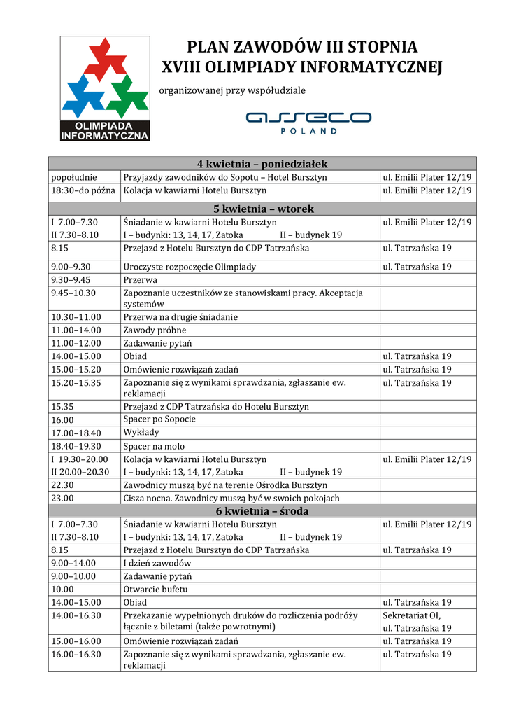 PLAN ZAWODÓW III STOPNIA XVIII OLIMPIADY INFORMATYCZNEJ organizowanej przy współudziale 4 kwietnia – poniedziałek popołudnie Przyjazdy zawodników do Sopotu – Hotel Bursztyn 18:30–do późna Kolacja w kawiarni Hotelu Bursztyn ul. Emilii Plater 12/19 ul. Emilii Plater 12/19 5 kwietnia – wtorek I 7.00–7.30 II 7.30–8.10 8.15 Śniadanie w kawiarni Hotelu Bursztyn I – budynki: 13, 14, 17, Zatoka II – budynek 19 Przejazd z Hotelu Bursztyn do CDP Tatrzańska ul. Emilii Plater 12/19 9.00–9.30 9.30–9.45 9.45–10.30 Uroczyste rozpoczęcie Olimpiady Przerwa Zapoznanie uczestników ze stanowiskami pracy. Akceptacja systemów Przerwa na drugie śniadanie Zawody próbne Zadawanie pytań Obiad Omówienie rozwiązań zadań Zapoznanie się z wynikami sprawdzania, zgłaszanie ew. reklamacji Przejazd z CDP Tatrzańska do Hotelu Bursztyn Spacer po Sopocie Wykłady Spacer na molo Kolacja w kawiarni Hotelu Bursztyn I – budynki: 13, 14, 17, Zatoka II – budynek 19 Zawodnicy muszą być na terenie Ośrodka Bursztyn Cisza nocna. Zawodnicy muszą być w swoich pokojach ul. Tatrzańska 19 10.30–11.00 11.00–14.00 11.00–12.00 14.00–15.00 15.00–15.20 15.20–15.35 15.35 16.00 17.00–18.40 18.40–19.30 I 19.30–20.00 II 20.00–20.30 22.30 23.00 ul. Tatrzańska 19 ul. Tatrzańska 19 ul. Tatrzańska 19 ul. Tatrzańska 19 ul. Emilii Plater 12/19 6 kwietnia – środa I 7.00–7.30 II 7.30–8.10 8.15 9.00–14.00 9.00–10.00 10.00 14.00–15.00 14.00–16.30 Śniadanie w kawiarni Hotelu Bursztyn I – budynki: 13, 14, 17, Zatoka II – budynek 19 Przejazd z Hotelu Bursztyn do CDP Tatrzańska I dzień zawodów Zadawanie pytań Otwarcie bufetu Obiad Przekazanie wypełnionych druków do rozliczenia podróży łącznie z biletami (także powrotnymi) 15.00–16.00 16.00–16.30 Omówienie rozwiązań zadań Zapoznanie się z wynikami sprawdzania, zgłaszanie ew. reklamacji ul. Emilii Plater 12/19 ul. Tatrzańska 19 ul. Tatrzańska 19 Sekretariat OI, ul. Tatrzańska 19 ul. Tatrzańska 19 ul. Tatrzańska 19 16.30 17.20 18.00–20.00 Przejazd z CDP Tatrzańska do Hotelu Bursztyn Wyjazd do Klubu U7 Klub U7 Gdańsk (bowling, bilard) I 20.30–21.00 II 21.00–21.30 22.30 23.00 Kolacja w kawiarni Hotelu Bursztyn I – budynki: 13, 14, 17, Zatoka II – budynek 19 Zawodnicy muszą być na terenie Ośrodka Bursztyn Cisza nocna. Zawodnicy muszą być w swoich pokojach 7 kwietnia – czwartek Śniadanie w kawiarni Hotelu Bursztyn I – budynki: 13, 14, 17, Zatoka II – budynek 19 Przejazd z Hotelu Bursztyn – CDP Tatrzańska II dzień zawodów Zadawanie pytań Otwarcie bufetu Obiad Rozliczanie podróży – zwrot kosztów I 7.00–7.30 II 7.30–8.10 8.15 9.00–14.00 9.00–10.00 10.00 14.00–15.00 14.00–16.30 15.00–16.00 16.00–16.30 16.30 I 18.00–18.25 II 18.25–18.50 18.50–21.30 22:00 23.00 Omówienie rozwiązań zadań Zapoznanie się z wynikami sprawdzania, zgłaszanie ew. reklamacji Przejazd z CDP Tatrzańska do Hotelu Bursztyn Kolacja w kawiarni Hotelu Bursztyn I – budynki: 13, 14, 17, Zatoka II – budynek 19 Multikino Sopot – film „Jestem Bogiem” Zawodnicy muszą być na terenie Ośrodka Bursztyn Cisza nocna. Zawodnicy muszą być w swoich pokojach Gdańsk, Plac Dominikański 7 ul. Emilii Plater 12/19 ul. Emilii Plater 12/19 ul. Tatrzańska 19 ul. Tatrzańska 19 Sekretariat OI, ul. Tatrzańska 19 ul. Tatrzańska 19 ul. Tatrzańska 19 ul. Emilii Plater 12/19 8 kwietnia – piątek I 7.30–8.00 II 8.00–8.30 8.30–18.00 I 19.00–19.30 II 19.30–20.00 22.00 23.00 Śniadanie w kawiarni Hotelu Bursztyn I – budynki: 13, 14, 17, Zatoka II – budynek 19 Wycieczka do Malborka Kolacja w kawiarni Hotelu Bursztyn I – budynki: 13, 14, 17, Zatoka II – budynek 19 Zawodnicy muszą być na terenie Ośrodka Bursztyn Cisza nocna. Zawodnicy muszą być w swoich pokojach ul. Emilii Plater 12/19 ul. Emilii Plater 12/19 9 kwietnia – sobota I 8.00–8.30 II 8.30–9.00 10.00 Śniadanie w kawiarni Hotelu Bursztyn I – budynki: 13, 14, 17, Zatoka II – budynek 19 Przejazd z Hotelu Bursztyn do siedziby Asseco Poland 11.00–12.30 Uroczystość zakończenia z udziałem zaproszonych gości 12.50 13.30 Obiad w restauracji Petit Paris Wyjazd pierwszego autokaru spod siedziby Asseco na Dworzec Gdynia Główna Wyjazd drugiego autokaru spod siedziby Asseco na Dworzec Gdynia Główna 14.10 ul. Emilii Plater 12/19 Gdynia, ul. Podolska 21 Gdynia, ul. Podolska 21 Gdynia, ul. Śląska 21