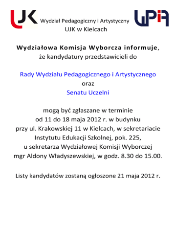 Wydział Pedagogiczny i Artystyczny UJK w Kielcach Wydziałowa Komisja Wyborcza informuje, że kandydatury przedstawicieli do Rady Wydziału Pedagogicznego i Artystycznego oraz Senatu Uczelni mogą być zgłaszane w terminie od 11 do 18 maja 2012 r. w budynku przy ul. Krakowskiej 11 w Kielcach, w sekretariacie Instytutu Edukacji Szkolnej, pok. 225, u sekretarza Wydziałowej Komisji Wyborczej mgr Aldony Władyszewskiej, w godz. 8.30 do 15.00. Listy kandydatów zostaną ogłoszone 21 maja 2012 r.