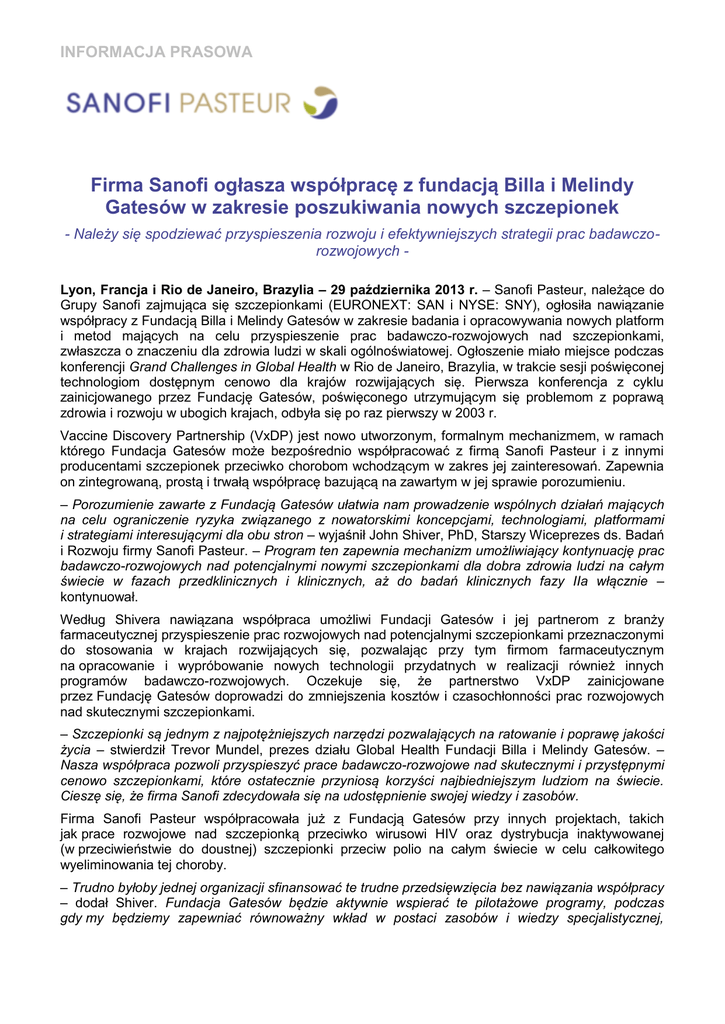 INFORMACJA PRASOWA Firma Sanofi ogłasza współpracę z fundacją Billa i Melindy Gatesów w zakresie poszukiwania nowych szczepionek - Należy się spodziewać przyspieszenia rozwoju i efektywniejszych strategii prac badawczorozwojowych Lyon, Francja i Rio de Janeiro, Brazylia – 29 października 2013 r. – Sanofi Pasteur, należące do Grupy Sanofi zajmująca się szczepionkami (EURONEXT: SAN i NYSE: SNY), ogłosiła nawiązanie współpracy z Fundacją Billa i Melindy Gatesów w zakresie badania i opracowywania nowych platform i metod mających na celu przyspieszenie prac badawczo-rozwojowych nad szczepionkami, zwłaszcza o znaczeniu dla zdrowia ludzi w skali ogólnoświatowej. Ogłoszenie miało miejsce podczas konferencji Grand Challenges in Global Health w Rio de Janeiro, Brazylia, w trakcie sesji poświęconej technologiom dostępnym cenowo dla krajów rozwijających się. Pierwsza konferencja z cyklu zainicjowanego przez Fundację Gatesów, poświęconego utrzymującym się problemom z poprawą zdrowia i rozwoju w ubogich krajach, odbyła się po raz pierwszy w 2003 r. Vaccine Discovery Partnership (VxDP) jest nowo utworzonym, formalnym mechanizmem, w ramach którego Fundacja Gatesów może bezpośrednio współpracować z firmą Sanofi Pasteur i z innymi producentami szczepionek przeciwko chorobom wchodzącym w zakres jej zainteresowań. Zapewnia on zintegrowaną, prostą i trwałą współpracę bazującą na zawartym w jej sprawie porozumieniu. – Porozumienie zawarte z Fundacją Gatesów ułatwia nam prowadzenie wspólnych działań mających na celu ograniczenie ryzyka związanego z nowatorskimi koncepcjami, technologiami, platformami i strategiami interesującymi dla obu stron – wyjaśnił John Shiver, PhD, Starszy Wiceprezes ds. Badań i Rozwoju firmy Sanofi Pasteur. – Program ten zapewnia mechanizm umożliwiający kontynuację prac badawczo-rozwojowych nad potencjalnymi nowymi szczepionkami dla dobra zdrowia ludzi na całym świecie w fazach przedklinicznych i klinicznych, aż do badań klinicznych fazy IIa włącznie – kontynuował. Według Shivera nawiązana współpraca umożliwi Fundacji Gatesów i jej partnerom z branży farmaceutycznej przyspieszenie prac rozwojowych nad potencjalnymi szczepionkami przeznaczonymi do stosowania w krajach rozwijających się, pozwalając przy tym firmom farmaceutycznym na opracowanie i wypróbowanie nowych technologii przydatnych w realizacji również innych programów badawczo-rozwojowych. Oczekuje się, że partnerstwo VxDP zainicjowane przez Fundację Gatesów doprowadzi do zmniejszenia kosztów i czasochłonności prac rozwojowych nad skutecznymi szczepionkami. – Szczepionki są jednym z najpotężniejszych narzędzi pozwalających na ratowanie i poprawę jakości życia – stwierdził Trevor Mundel, prezes działu Global Health Fundacji Billa i Melindy Gatesów. – Nasza współpraca pozwoli przyspieszyć prace badawczo-rozwojowe nad skutecznymi i przystępnymi cenowo szczepionkami, które ostatecznie przyniosą korzyści najbiedniejszym ludziom na świecie. Cieszę się, że firma Sanofi zdecydowała się na udostępnienie swojej wiedzy i zasobów. Firma Sanofi Pasteur współpracowała już z Fundacją Gatesów przy innych projektach, takich jak prace rozwojowe nad szczepionką przeciwko wirusowi HIV oraz dystrybucja inaktywowanej (w przeciwieństwie do doustnej) szczepionki przeciw polio na całym świecie w celu całkowitego wyeliminowania tej choroby. – Trudno byłoby jednej organizacji sfinansować te trudne przedsięwzięcia bez nawiązania współpracy – dodał Shiver. Fundacja Gatesów będzie aktywnie wspierać te pilotażowe programy, podczas gdy my będziemy zapewniać równoważny wkład w postaci zasobów i wiedzy specjalistycznej, a także będziemy pilnować, aby innowacyjne wyniki tych prac przyniosły korzyści tym ludziom, którzy ich najbardziej potrzebują, dzięki mechanizmom ich globalnego udostępniania. Informacje o Sanofi Grupa Sanofi jest międzynarodową firmą farmaceutyczną, zaangażowaną w odkrywanie, produkcję i dystrybucję leków, które mają poprawić stan zdrowia pacjentów na całym świecie. Firma jest notowana na giełdach w Paryżu (EURONEXT: SAN) oraz w Nowym Jorku (NYSE: SNY). Do Grupy Sanofi w Polsce należą: Sanofi-Aventis Sp. z o.o. – producent leków innowacyjnych i OTC (bez recepty), Sanofi Pasteur, największy na świecie producent szczepionek, Zentiva – lider produkcji leków generycznych w Europie Środkowo-Wschodniej, Nepentes Pharma, uznany w branży producent dermokosmetyków, Genzyme, producent leków stosowanych w chorobach rzadkich oraz Merial, światowy lider w branży weterynaryjnej. Jedna z 82 fabryk Grupy Sanofi na świecie, jest zlokalizowana w Rzeszowie. Grupa Sanofi w Polsce zatrudnia blisko 1000 pracowników. Według danych IMS Health Polska, Grupa zajmuje jedno z wiodących miejsc w krajowym rankingu największych firm farmaceutycznych. Dodatkowe informacje znajdują się na stronie www.sanofi.pl Stwierdzenia odnoszące się do przyszłości Niniejszy komunikat prasowy zawiera stwierdzenia odnoszące się do przyszłości w rozumieniu amerykańskiej ustawy o reformie postępowania sądowego w sprawach związanych z prywatnymi papierami wartościowymi z roku 1995 (Private Securities Litigation Reform) w aktualnie obowiązującej wersji. W myśl tej definicji, stwierdzenia odnoszące się do przyszłości nie stanowią faktów historycznych. Stwierdzenia te zawierają przewidywania i oszacowania wraz z założeniami będącymi podstawą do ich wysnuwania, a także obejmują stwierdzenia dotyczące planów, celów, zamiarów i oczekiwań związanych z przyszłymi wynikami finansowymi, zdarzeniami, działaniami, usługami, opracowywaniem produktów i możliwości, oraz stwierdzenia dotyczące przyszłych wyników. Stwierdzenia odnoszące się do przyszłości zazwyczaj zawierają czasowniki typu „spodziewać się”, „oczekiwać”, „uw