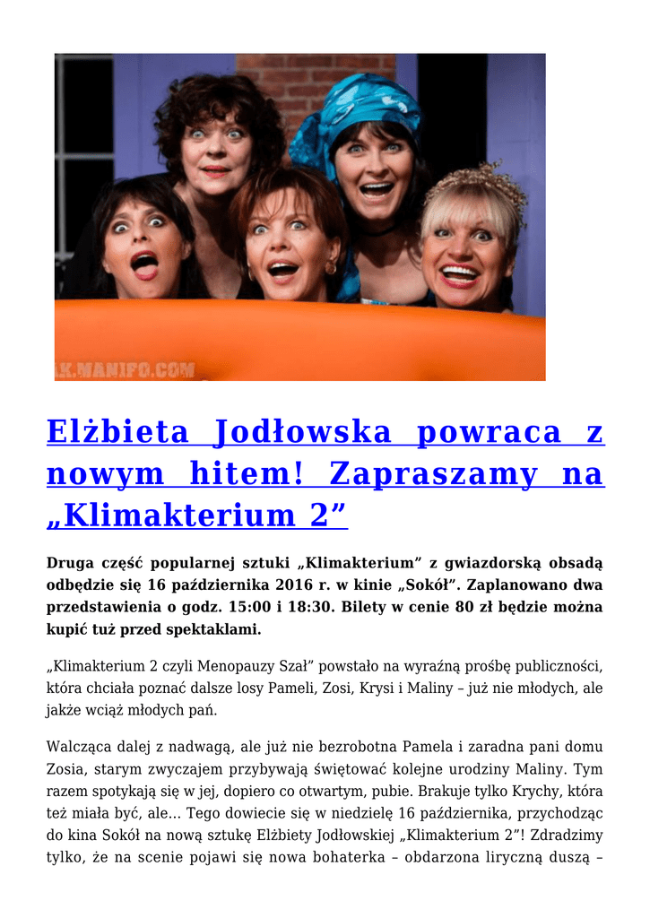 Elżbieta Jodłowska powraca z nowym hitem! Zapraszamy na „Klimakterium 2” Druga część popularnej sztuki „Klimakterium” z gwiazdorską obsadą odbędzie się 16 października 2016 r. w kinie „Sokół”. Zaplanowano dwa przedstawienia o godz. 15:00 i 18:30. Bilety w cenie 80 zł będzie można kupić tuż przed spektaklami. „Klimakterium 2 czyli Menopauzy Szał” powstało na wyraźną prośbę publiczności, która chciała poznać dalsze losy Pameli, Zosi, Krysi i Maliny – już nie młodych, ale jakże wciąż młodych pań. Walcząca dalej z nadwagą, ale już nie bezrobotna Pamela i zaradna pani domu Zosia, starym zwyczajem przybywają świętować kolejne urodziny Maliny. Tym razem spotykają się w jej, dopiero co otwartym, pubie. Brakuje tylko Krychy, która też miała być, ale… Tego dowiecie się w niedzielę 16 października, przychodząc do kina Sokół na nową sztukę Elżbiety Jodłowskiej „Klimakterium 2”! Zdradzimy tylko, że na scenie pojawi się nowa bohaterka – obdarzona liryczną duszą – Angela, która wraz z Maliną prowadzi interes. W ciągu 6 lat od premiery „Klimakterium” pokazywane było ponad 1800 razy. To dowód na to, jak niewyczerpanym tematem jest kobieta i jej problemy. W niedzielę zobaczymy znane już „cztery tygrysice w menopauzie”, które podnoszą głowę i realizują to, o co tak walczyły w pierwszej części. Udowadniają, że klimakterium to nie koniec świata, a dopiero początek nowego życia. Usłyszycie zupełnie nowe piosenki we wspaniałych aranżacjach, z zabawnymi tekstami, których nie można przestać nucić. Zobaczycie złożone układy choreograficzne, pełne ekspresji i energii, która z pewnością się wam udzieli. Wszystko za sprawą znanych już z „Klimakterium…i już!” aktorek, do grona których dołączą nowe artystki – jedna lepsza od drugiej i wszystkie zupełnie znakomite. Mówi się, że ten spektakl to prawdziwa terapia śmiechem – kojąca i skuteczna, która sprawia, że nabieramy dystansu do siebie, własnych zranień i lęków. Bo gdzie spotykają się tak różne kobiety, które tyle czasu się nie widziały i mają tak wiele sobie do powiedzenia, tam jest głośno, śmiesznie i zabawnie. Wszak „Menopauzy szał” ogarnia wszystkich, a zwłaszcza tych, którzy się tego zupełnie nie spodziewają! Autor: Elżbieta Jodłowska Reżyser: Elżbieta Jodłowska i Krzysztof Jaślar Producent: Tomasz Heller Obsada (występują zamiennie): Pamela: Elżbieta Jodłowska, Małgorzata Duda, Maria Winiarska Malina: Anna Korcz, Ewa Cichocka, Joanna Jeżewska, Elżbieta Jarosik, Katarzyna Kozak Zosia: Elżbieta Okupska, Grażyna Zielińska, Elżbieta Panas, Ludmiła Warzecha, Marzena Kipiel–Sztuka Angela: Małgorzata Gadecka, Renata Zarębska, Anna Wojton, Ewa Złotowska Bilety w cenie 80 zł do nabycia w kasie kina „Sokół”. Sprzedaż biletów rozpoczynamy od spektaklu na godzinę 15:00 Rezerwacje tel. 58/56-221-03 lub 607-752-124 Rezerwacje grupowe 24h/d codziennie tel. 668-156-310 Bilety dostępne również na portalach: www.kupbilecik.pl www.ebilet.pl www.biletyna.pl www.agencjadiabel.pl Zapraszamy