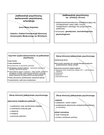 Jadłowstręt psychiczny, żarłoczność psychiczna, ortoreksja Anna Wiela-Hojeńska Jadłowstręt psychiczny łac. anorexia nervosa · zespół psychosomatyczny charakteryzujący się zmniejszeniem masy ciała i innymi następstwami celowego nie przyjmowania pokarmów · przyczyny: genetyczne, neurobiologiczne, Katedra i Zakład Farmakologii Klinicznej Uniwersytetu Medycznego we Wrocławiu Czynniki ryzyka zachorowania na jadłowstręt psychiczny · płeć żeńska · wiek młodzieńczy · przynależność do zachodniej cywilizacji · obciążający wywiad rodzinny – zaburzenia odżywiania, depresja, zaburzenia lękowe · nieprawidłowe relacje z rodzicami – słaby kontakt, nadmierne wymagania, konflikty, molestowanie seksualne, krytyczne komentarze na temat diety i wyglądu ze strony otoczenia, presja zawodowa lub społeczna na szczupłą sylwetkę · niska samoocena, perfekcjonizm, zaburzenia lękowe · wcześniactwo, mała masa urodzeniowa Obraz kliniczny jadłowstrętu psychicznego zaburzenia żołądkowo-jelitowe · wydłużony czas opróżniania żołądka · zwolnienie motoryki jelit · zaparcia · wzdęcia · poczucie pełności psychologiczne Obraz kliniczny jadłowstrętu psychicznego nietolerancja zimna skóra sucha, łuszcząca się, meszek (lanugo) na plecach, przedramionach, twarzy, obrzęki zaburzenia czynności układu krążenia · zaburzenia rytmu (wydłużenie odstępu QT) ® zawroty głowy, omdlenia · bradykardia · hipotensja · niewydolność serca Obraz kliniczny jadłowstrętu psychicznego mięśnie · osłabienie i zanik mięśni · zwiększenie aktywności acetylocholinesterazy w surowicy układ rozrodczy · brak miesiączki · zmiany zanikowe pochwy Obraz kliniczny jadłowstrętu psychicznego Obraz kliniczny jadłowstrętu psychicznego zmiany hematologiczne układ nerwowy · apatia · osłabienie koncentracji · depresja · drażliwość · niedokrwistość · neutropenia · małopłytkowość zmniejszenie stężenia we krwi · potasu, wapnia, magnezu, fosforanów, glukozy, białka Obraz kliniczny jadłowstrętu psychicznego zmiany kostne · bóle wskutek osteopenii i osteoporozy zaburzenia hormonalne dotyczące czynności podwzgórza i obwodowego metabolizmu hormonów Typy jadłowstrętu psychicznego według Podręcznika Statystyki i Diagnostyki Zaburzeń Psychicznych · ascetyczny – typ restrykcyjny lub ograniczający (restricting type) – bez napadów żarłoczności i bez dodatkowych metod mających na celu pozbycie się pokarmu · bulimiczny – żarłoczno-wydalający lub przeczyszczający (purging type) – z napadami żarłoczności i dodatkowymi metodami „regulowania masy ciała” Rozpoznanie jadłowstrętu psychicznego kryteria według American Psychiatric Association · dążenie do utrzymania masy ciała na dolnej granicy lub poniżej masy należnej (zmniejszenie masy ciała o 15% lub więcej) · silny lęk przed przyrostem masy ciała lub otyłością, nawet w sytuacji niedowagi · zaburzenia postrzegania własnej masy ciała i sylwetki · u kobiet w okresie popokwitaniowym nie wystąpienie przynajmniej 3 kolejnych cykli Terapia jadłowstrętu psychicznego zgodnie z hierarchią ważności · zabezpieczenie przed stanami zagrażającymi życiu (somatyczne powikłania, myśli i tendencje samobójcze) · unormowanie masy ciała · terapia mniej zagrażających ostrych powikłań somatycznych · przekazanie informacji o prawidłowych zachowaniach żywieniowych · praca nad deficytami w zakresie regulacji emocjonalnej, dysfunkcjonalnym myśleniem, konfliktami w zakresie relacji z osobami drugimi Jadłowstręt psychiczny - leczenie Skojarzona terapia psychiatryczna, internistyczna, żywieniowa Żarłoczność psychiczna łac. bulimia nervosa · zespół psychosomatyczny charakteryzujący się regularnymi epizodami niekontrolowanego spożywania dużych ilości pokarmów oraz stosowaniem metod zwalczania skutków obżarstwa Kryteria diagnostyczne żarłoczności psychicznej · przeciwdziałanie skutkom przyjętego pokarmu, tj. zwiększeniu masy ciała: wyzwalanie wymiotów, nadużywanie środków przeczyszczających, stosowanie środków zmniejszających łaknienie, hormonów tarczycy, preparatów moczopędnych oraz okresowych głodówek, nadmiernego wysiłku fizycznego · epizody żarłoczności i niewłaściwe zachowania kompensujące występują >2 razy w tygodniu przez 3 miesiące · postrzeganie siebie samego jako zbyt grubego, z natrętną obawą przed utyciem · olanzepina (atypowy neuroleptyk) - próby · fluoksetyna – łagodzi zaburzenia depresyjne, zmniejsza lęk przed nadmiernym przytyciem, zapobiega nawrotom choroby; nieskuteczna w fazie niedoboru masy ciała – zmniejsza łaknienie – inhibitor CYP2D6 · mianseryna, mirtazapina · cyproheptadyna – lek zwiększający łaknienie i powodujący przyrost masy ciała; działanie przeciwhistaminowe i serotoninergiczne Kryteria diagnostyczne żarłoczności psychicznej · napady żarłoczności 1) zjadanie w określonym czasie (np. 2 h) ilości pokarmu, która jest większa niż spożywana przez innych ludzi w podobnym czasie i okolicznościach; 2) uczucie braku kontroli nad nadmiernym spożywaniem pokarmu podczas takiego epizodu (niemożność zaprzestania jedzenia, brak kontroli rodzaju i ilości pokarmu) Kryteria diagnostyczne żarłoczności psychicznej Typ z wymiotami lub biegunkami prowokowanie wymiotów, nadużywanie leków przeczyszczających, moczopędnych Typ bez wymiotów i biegunek głodzenie, nadmierny wysiłek fizyczny Powikłania żarłoczności psychicznej odwodnienie zaburzenia równowagi elektrolitów: Powikłania żarłoczności psychicznej · uszkodzenia szkliwa zębów na skutek częstego kontaktu z kwasem żołądkowym · hipokaliemia, hipochloremia i zasadowica metaboliczna w następstwie wymiotów, hipomagnezemia i hipofosfatemia w następstwie nadużywania środków przeczyszczających zaburzenia rytmu serca i osłabienie mięśni · ubytki spowodowane bulimi