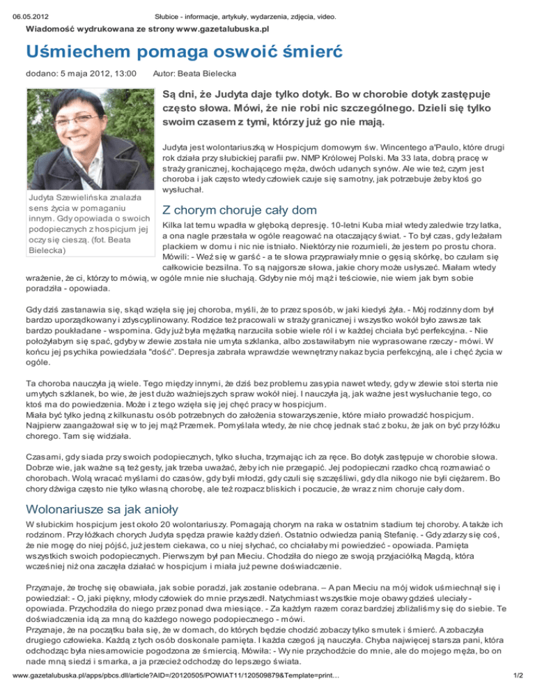 06.05.2012 Słubice - informacje, artykuły, wydarzenia, zdjęcia, video. Wiadomość wydrukowana ze strony www.gazetalubuska.pl Uśmiechem pomaga oswoić śmierć dodano: 5 maja 2012, 13:00 Autor: Beata Bielecka Są dni, że Judyta daje tylko dotyk. Bo w chorobie dotyk zastępuje często słowa. Mówi, że nie robi nic szczególnego. Dzieli się tylko swoim czasem z tymi, którzy już go nie mają. Judyta Szewielińska znalazła sens życia w pomaganiu innym. Gdy opowiada o swoich podopiecznych z hospicjum jej oczy się cieszą. (fot. Beata Bielecka) Judyta jest wolontariuszką w Hospicjum domowym św. Wincentego a'Paulo, które drugi rok działa przy słubickiej parafii pw. NMP Królowej Polski. Ma 33 lata, dobrą pracę w straży granicznej, kochającego męża, dwóch udanych synów. Ale wie też, czym jest choroba i jak często wtedy człowiek czuje się samotny, jak potrzebuje żeby ktoś go wysłuchał. Z chorym choruje cały dom Kilka lat temu wpadła w głęboką depresję. 10-letni Kuba miał wtedy zaledwie trzy latka, a ona nagle przestała w ogóle reagować na otaczający świat. - To był czas, gdy leżałam plackiem w domu i nic nie istniało. Niektórzy nie rozumieli, że jestem po prostu chora. Mówili: - Weź się w garść - a te słowa przyprawiały mnie o gęsią skórkę, bo czułam się całkowicie bezsilna. To są najgorsze słowa, jakie chory może usłyszeć. Miałam wtedy wrażenie, że ci, którzy to mówią, w ogóle mnie nie słuchają. Gdyby nie mój mąż i teściowie, nie wiem jak bym sobie poradziła - opowiada. Gdy dziś zastanawia się, skąd wzięła się jej choroba, myśli, że to przez sposób, w jaki kiedyś żyła. - Mój rodzinny dom był bardzo uporządkowany i zdyscyplinowany. Rodzice też pracowali w straży granicznej i wszystko wokół było zawsze tak bardzo poukładane - wspomina. Gdy już była mężatką narzuciła sobie wiele ról i w każdej chciała być perfekcyjna. - Nie położyłabym się spać, gdyby w zlewie została nie umyta szklanka, albo zostawiłabym nie wyprasowane rzeczy - mówi. W końcu jej psychika powiedziała "dość”. Depresja zabrała wprawdzie wewnętrzny nakaz bycia perfekcyjną, ale i chęć życia w ogóle. Ta choroba nauczyła ją wiele. Tego między innymi, że dziś bez problemu zasypia nawet wtedy, gdy w zlewie stoi sterta nie umytych szklanek, bo wie, że jest dużo ważniejszych spraw wokół niej. I nauczyła ją, jak ważne jest wysłuchanie tego, co ktoś ma do powiedzenia. Może i z tego wzięła się jej chęć pracy w hospicjum. Miała być tylko jedną z kilkunastu osób potrzebnych do założenia stowarzyszenie, które miało prowadzić hospicjum. Najpierw zaangażował się w to jej mąż Przemek. Pomyślała wtedy, że nie chcę jednak stać z boku, że jak on być przy łóżku chorego. Tam się widziała. Czasami, gdy siada przy swoich podopiecznych, tylko słucha, trzymając ich za ręce. Bo dotyk zastępuje w chorobie słowa. Dobrze wie, jak ważne są też gesty, jak trzeba uważać, żeby ich nie przegapić. Jej podopieczni rzadko chcą rozmawiać o chorobach. Wolą wracać myślami do czasów, gdy byli młodzi, gdy czuli się szczęśliwi, gdy dla nikogo nie byli ciężarem. Bo chory dźwiga często nie tylko własną chorobę, ale też rozpacz bliskich i poczucie, że wraz z nim choruje cały dom. Wolonariusze sa jak anioły W słubickim hospicjum jest około 20 wolontariuszy. Pomagają chorym na raka w ostatnim stadium tej choroby. A także ich rodzinom. Przy łóżkach chorych Judyta spędza prawie każdy dzień. Ostatnio odwiedza panią Stefanię. - Gdy zdarzy się coś, że nie mogę do niej pójść, już jestem ciekawa, co u niej słychać, co chciałaby mi powiedzieć - opowiada. Pamięta wszystkich swoich podopiecznych. Pierwszym był pan Mieciu. Chodziła do niego ze swoją przyjaciółką Magdą, która wcześniej niż ona zaczęła działać w hospicjum i miała już pewne doświadczenie. Przyznaje, że trochę się obawiała, jak sobie poradzi, jak zostanie odebrana. – A pan Mieciu na mój widok uśmiechnął się i powiedział: - O, jaki piękny, młody człowiek do mnie przyszedł. Natychmiast wszystkie moje obawy gdzieś uleciały opowiada. Przychodziła do niego przez ponad dwa miesiące. - Za każdym razem coraz bardziej zbliżaliśmy się do siebie. Te doświadczenia idą za mną do każdego nowego podopiecznego - mówi. Przyznaje, że na początku bała się, że w domach, do których będzie chodzić zobaczy tylko smutek i śmierć. A zobaczyła drugiego człowieka. Każdą z tych osób doskonale pamięta. I każda czegoś ją nauczyła. Chyba najwięcej starsza pani, która odchodząc była niesamowicie pogodzona ze śmiercią. Mówiła: - Wy nie przychodźcie do mnie, ale do mojego męża, bo on nade mną siedzi i smarka, a ja przecież odchodzę do lepszego świata. www.gazetalubuska.pl/apps/pbcs.dll/article?AID=/20120505/POWIAT11/120509879&Template=print… 1/2 06.05.2012 Słubice - informacje, artykuły, wydarzenia, zdjęcia, video. - Była w tym odchodzeniu niewiarygodnie silna. To było bardzo mocne doświadczenie - mówi Judyta. Przyznaje, że widząc radość w oczach swoich podopiecznych czuje, że rosną jej skrzydła i dostaje niesamowitego powera do pracy. Ale nie wie, jakby się poczuła, gdyby przyszło jej być przy śmierci swojego podopiecznego. - Nigdy to mi się jeszcze nie zdarzyło. Może Bóg uznał, że nie jestem jeszcze na to gotowa? - zastanawia się. Kiedyś mąż Judyty idąc do chorego chciał zabrać gitarę i radził się jej, co o tym myśli. - Daj sobie spokój. Przecież to cierpiący człowiek i jeszcze twojego plumkania ma słuchać?! - usłyszał wtedy od niej. Przemek miał nadzieję, że może w ten sposób oderwie go chociaż na chwilę od myślenia o chorobie. - I miał rację - wspomina Judyta. Starszy pan nie tylko słuchał piosenek, które grał mu jej mąż, ale nawet mruczał je sobie pod nosem, a czasami przy nich 