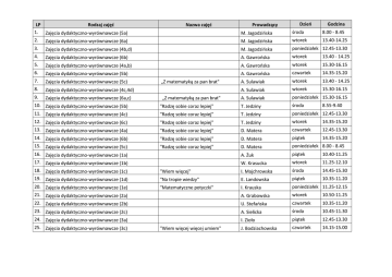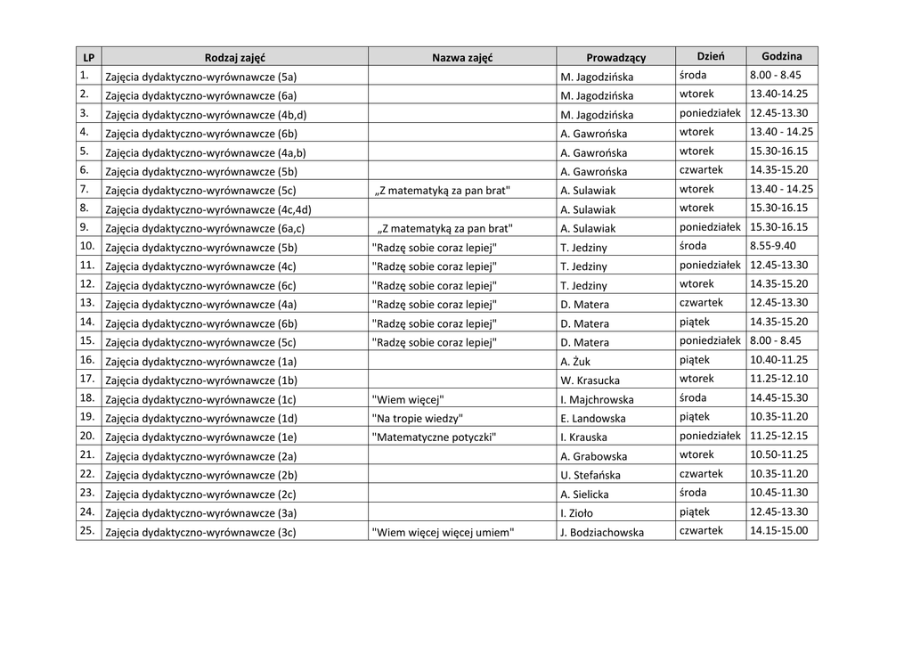 LP Rodzaj zajęć 1. Zajęcia dydaktyczno-wyrównawcze (5a) 2. Zajęcia dydaktyczno-wyrównawcze (6a) Nazwa zajęć Prowadzący Dzień Godzina M. Jagodzińska środa 8.00 - 8.45 M. Jagodzińska wtorek 13.40-14.25 3. Zajęcia dydaktyczno-wyrównawcze (4b,d) M. Jagodzińska poniedziałek 12.45-13.30 4. Zajęcia dydaktyczno-wyrównawcze (6b) A. Gawrońska wtorek 13.40 - 14.25 5. Zajęcia dydaktyczno-wyrównawcze (4a,b) A. Gawrońska wtorek 15.30-16.15 6. Zajęcia dydaktyczno-wyrównawcze (5b) A. Gawrońska czwartek 14.35-15.20 7. Zajęcia dydaktyczno-wyrównawcze (5c) A. Sulawiak wtorek 13.40 - 14.25 8. Zajęcia dydaktyczno-wyrównawcze (4c,4d) A. Sulawiak wtorek 15.30-16.15 9. Zajęcia dydaktyczno-wyrównawcze (6a,c) A. Sulawiak poniedziałek 15.30-16.15 „Z matematyką za pan brat" „Z matematyką za pan brat" 10. Zajęcia dydaktyczno-wyrównawcze (5b) 11. Zajęcia dydaktyczno-wyrównawcze (4c) "Radzę sobie coraz lepiej" T. Jedziny środa "Radzę sobie coraz lepiej" T. Jedziny poniedziałek 12.45-13.30 12. Zajęcia dydaktyczno-wyrównawcze (6c) 13. Zajęcia dydaktyczno-wyrównawcze (4a) "Radzę sobie coraz lepiej" T. Jedziny wtorek 14.35-15.20 "Radzę sobie coraz lepiej" D. Matera czwartek 12.45-13.30 14. Zajęcia dydaktyczno-wyrównawcze (6b) 15. Zajęcia dydaktyczno-wyrównawcze (5c) "Radzę sobie coraz lepiej" D. Matera piątek 14.35-15.20 "Radzę sobie coraz lepiej" D. Matera poniedziałek 8.00 - 8.45 A. Żuk piątek 10.40-11.25 W. Krasucka wtorek 11.25-12.10 16. Zajęcia dydaktyczno-wyrównawcze (1a) 17. Zajęcia dydaktyczno-wyrównawcze (1b) 8.55-9.40 18. Zajęcia dydaktyczno-wyrównawcze (1c) 19. Zajęcia dydaktyczno-wyrównawcze (1d) "Wiem więcej" I. Majchrowska środa 14.45-15.30 "Na tropie wiedzy" E. Landowska piątek 10.35-11.20 20. Zajęcia dydaktyczno-wyrównawcze (1e) 21. Zajęcia dydaktyczno-wyrównawcze (2a) "Matematyczne potyczki" I. Krauska poniedziałek 11.25-12.15 A. Grabowska wtorek 10.50-11.25 22. Zajęcia dydaktyczno-wyrównawcze (2b) 23. Zajęcia dydaktyczno-wyrównawcze (2c) U. Stefańska czwartek 10.35-11.20 A. Sielicka środa 10.45-11.30 24. Zajęcia dydaktyczno-wyrównawcze (3a) 25. Zajęcia dydaktyczno-wyrównawcze (3c) I. Zioło piątek 12.45-13.30 J. Bodziachowska czwartek 14.15-15.00 "Wiem więcej więcej umiem"