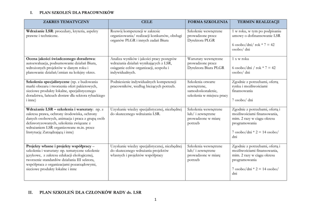 II. PLAN SZKOLEŃ DLA CZŁONKÓW RADY ds. LSR