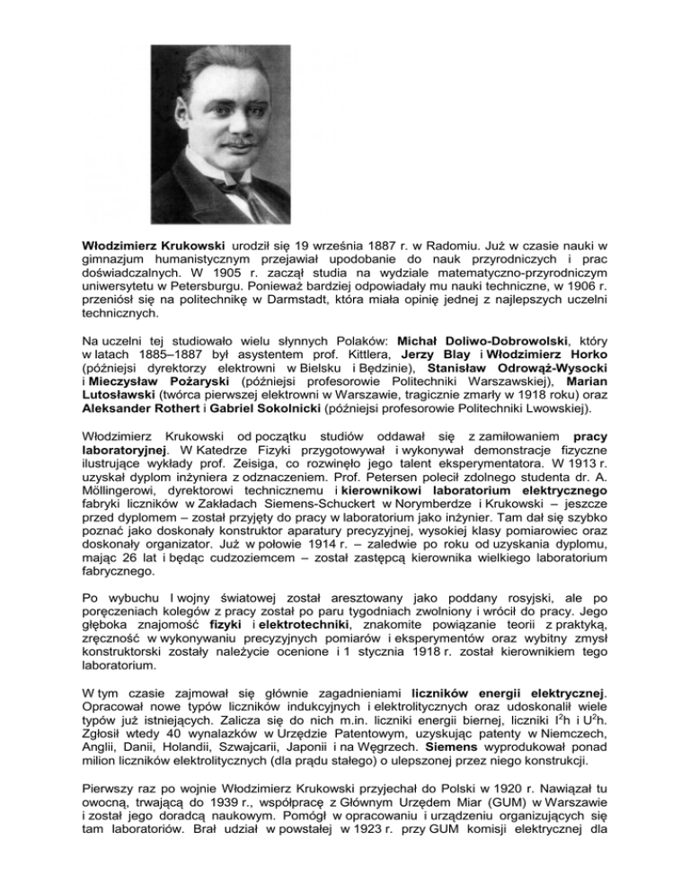 Włodzimierz Krukowski urodził się 19 września 1887 r. w Radomiu. Już w czasie nauki w gimnazjum humanistycznym przejawiał upodobanie do nauk przyrodniczych i prac doświadczalnych. W 1905 r. zaczął studia na wydziale matematyczno-przyrodniczym uniwersytetu w Petersburgu. Ponieważ bardziej odpowiadały mu nauki techniczne, w 1906 r. przeniósł się na politechnikę w Darmstadt, która miała opinię jednej z najlepszych uczelni technicznych. Na uczelni tej studiowało wielu słynnych Polaków: Michał Doliwo-Dobrowolski, który w latach 1885–1887 był asystentem prof. Kittlera, Jerzy Blay i Włodzimierz Horko (późniejsi dyrektorzy elektrowni w Bielsku i Będzinie), Stanisław Odrowąż-Wysocki i Mieczysław Pożaryski (późniejsi profesorowie Politechniki Warszawskiej), Marian Lutosławski (twórca pierwszej elektrowni w Warszawie, tragicznie zmarły w 1918 roku) oraz Aleksander Rothert i Gabriel Sokolnicki (późniejsi profesorowie Politechniki Lwowskiej). Włodzimierz Krukowski od początku studiów oddawał się z zamiłowaniem pracy laboratoryjnej. W Katedrze Fizyki przygotowywał i wykonywał demonstracje fizyczne ilustrujące wykłady prof. Zeisiga, co rozwinęło jego talent eksperymentatora. W 1913 r. uzyskał dyplom inżyniera z odznaczeniem. Prof. Petersen polecił zdolnego studenta dr. A. Möllingerowi, dyrektorowi technicznemu i kierownikowi laboratorium elektrycznego fabryki liczników w Zakładach Siemens-Schuckert w Norymberdze i Krukowski – jeszcze przed dyplomem – został przyjęty do pracy w laboratorium jako inżynier. Tam dał się szybko poznać jako doskonały konstruktor aparatury precyzyjnej, wysokiej klasy pomiarowiec oraz doskonały organizator. Już w połowie 1914 r. – zaledwie po roku od uzyskania dyplomu, mając 26 lat i będąc cudzoziemcem – został zastępcą kierownika wielkiego laboratorium fabrycznego. Po wybuchu I wojny światowej został aresztowany jako poddany rosyjski, ale po poręczeniach kolegów z pracy został po paru tygodniach zwolniony i wrócił do pracy. Jego głęboka znajomość fizyki i elektrotechniki, znakomite powiązanie teorii z praktyką, zręczność w wykonywaniu precyzyjnych pomiarów i eksperymentów oraz wybitny zmysł konstruktorski zostały należycie ocenione i 1 stycznia 1918 r. został kierownikiem tego laboratorium. W tym czasie zajmował się głównie zagadnieniami liczników energii elektrycznej. Opracował nowe typów liczników indukcyjnych i elektrolitycznych oraz udoskonalił wiele typów już istniejących. Zalicza się do nich m.in. liczniki energii biernej, liczniki I2h i U2h. Zgłosił wtedy 40 wynalazków w Urzędzie Patentowym, uzyskując patenty w Niemczech, Anglii, Danii, Holandii, Szwajcarii, Japonii i na Węgrzech. Siemens wyprodukował ponad milion liczników elektrolitycznych (dla prądu stałego) o ulepszonej przez niego konstrukcji. Pierwszy raz po wojnie Włodzimierz Krukowski przyjechał do Polski w 1920 r. Nawiązał tu owocną, trwającą do 1939 r., współpracę z Głównym Urzędem Miar (GUM) w Warszawie i został jego doradcą naukowym. Pomógł w opracowaniu i urządzeniu organizujących się tam laboratoriów. Brał udział w powstałej w 1923 r. przy GUM komisji elektrycznej dla opiniowania przepisów o miernikach elektrycznych i typach narzędzi mierniczych zgłaszanych do legalizacji. W 1926 r. przeniósł się do Warszawy na stanowisko kierownika biura technicznego Polskich Zakładów Siemensa. W roku 1930 został powołany na stanowisko profesora zwyczajnego i kierownika Katedry Pomiarów Elektrycznych. Zmodernizował i rozbudował laboratorium oraz zorganizował przy nim, na zlecenie GUM, Pracownię Precyzyjnych Pomiarów Elektrycznych. Jego praca naukowo-techniczna dotyczyła wtedy głównie dziedziny wzorców elektrycznych i pomiarów precyzyjnych. Zajmował się opracowaniem metod porównania wzorców oporu i napięcia, ich prawidłowego przechowywania i transportu oraz produkcji wzorców napięcia (m.in. ogniw normalnych). Wiele miejsca poświęcił wtedy zagadnieniu dokładności pomiarów i uwzględnienia uchybów. W Stowarzyszeniu Elektryków Polskich (SEP), do którego należał od roku 1926, pełnił wiele odpowiedzialnych funkcji. Od 1929 r. był członkiem Komisji Organizacyjnej Znaku Przepisowego SEP, w latach 1934–1937 członkiem Zarządu Głównego SEP, w latach 1935– 1937 – wiceprezesem Oddziału Lwowskiego. W latach 1934–1939 był członkiem Centralnej Komisji Normalizacji Elektrotechnicznej (powołanym personalnie) i członkiem jej Komitetu Redakcyjnego, w latach 1932–1939 – członkiem Komisji I Definicji i Symboli oraz Podkomisji Wielkości i Jednostek, w latach 1934–1939 – przewodniczącym takiej Podkomisji we Lwowie, w latach 1933–1939 członkiem Komisji XIII Przyrządów Pomiarowych w Warszawie i przewodniczącym we Lwowie. Zbierał stare książki, przede wszystkim matematyczne, fizyczne, techniczne. Był tolerancyjny wobec ludzi i ich poglądów, ale zdecydowanie przeciwny ekscesom grup studenckich na tle rasowym. Nacjonalizm i rasizm nie tylko były mu obce, ale uważał, że hamują rozwój ludzkości. W jego katedrze pracowali zarówno Polacy, jak i Żydzi i Ukraińcy. 30 czerwca 1941 r. Lwów został zajęty przez Niemców. Razem z Wehrmachtem wkroczyły jednostki polowego gestapo. W nocy z 3 na 4 lipca 1941 r. aresztowano 47 osób: profesorów Politechniki i Uniwersytetu wraz ze wszystkimi znajdującymi się w mieszkaniu osobami w wieku powyżej 18 lat, szczególnie synami. Z tej liczby, po brutalnym przesłuchaniu, tej samej nocy na Wzgórzach Wuleckich (w pobliżu II Domu Technika) rozstrzelano 40 osób. Wśród nich było 7 profesorów Politechniki Lwowskiej, kierowników katedr, między innymi Włodzimierz Krukowski, lat 53 (Katedra Pomiarów Elektrycznych). Mord utrzymywano w tajemnicy zarówno przed obcymi, jak i swoimi. Gestapo starało się zatrzeć wszelkie ślady zbrodni. W 1943 r. zwłoki zamordowanych zo