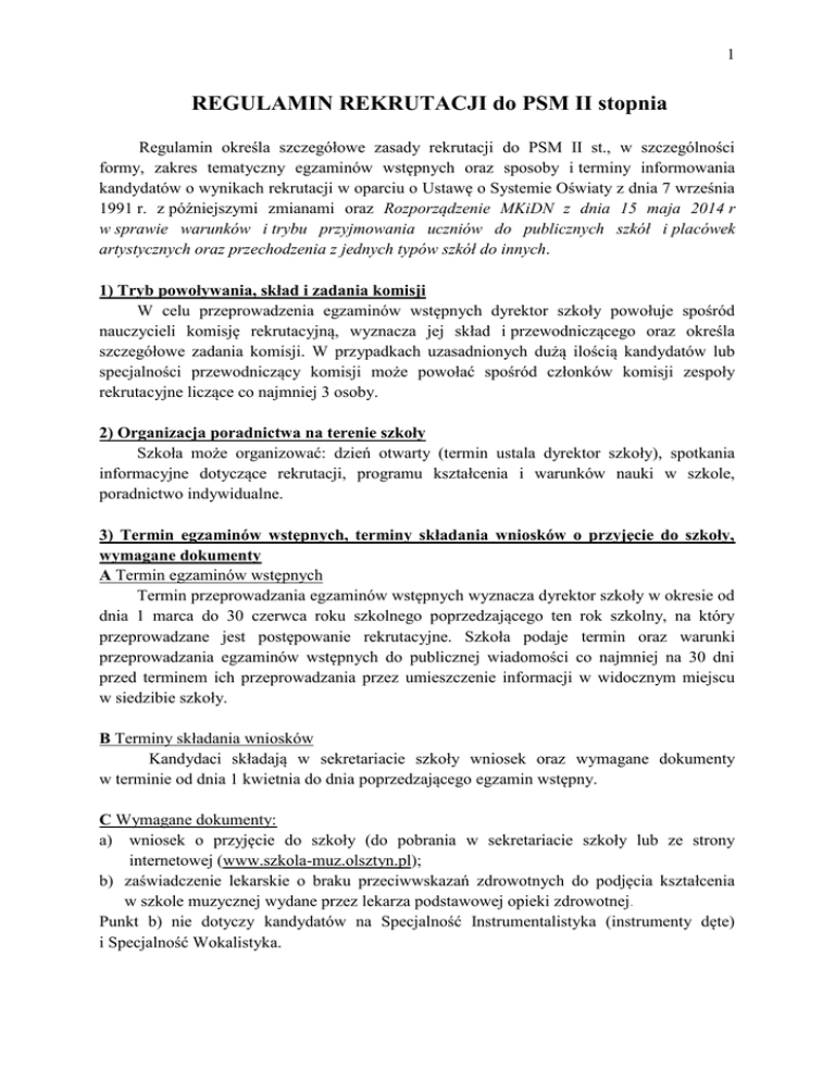 1 REGULAMIN REKRUTACJI do PSM II stopnia Regulamin określa szczegółowe zasady rekrutacji do PSM II st., w szczególności formy, zakres tematyczny egzaminów wstępnych oraz sposoby i terminy informowania kandydatów o wynikach rekrutacji w oparciu o Ustawę o Systemie Oświaty z dnia 7 września 1991 r. z późniejszymi zmianami oraz Rozporządzenie MKiDN z dnia 15 maja 2014 r w sprawie warunków i trybu przyjmowania uczniów do publicznych szkół i placówek artystycznych oraz przechodzenia z jednych typów szkół do innych. 1) Tryb powoływania, skład i zadania komisji W celu przeprowadzenia egzaminów wstępnych dyrektor szkoły powołuje spośród nauczycieli komisję rekrutacyjną, wyznacza jej skład i przewodniczącego oraz określa szczegółowe zadania komisji. W przypadkach uzasadnionych dużą ilością kandydatów lub specjalności przewodniczący komisji może powołać spośród członków komisji zespoły rekrutacyjne liczące co najmniej 3 osoby. 2) Organizacja poradnictwa na terenie szkoły Szkoła może organizować: dzień otwarty (termin ustala dyrektor szkoły), spotkania informacyjne dotyczące rekrutacji, programu kształcenia i warunków nauki w szkole, poradnictwo indywidualne. 3) Termin egzaminów wstępnych, terminy składania wniosków o przyjęcie do szkoły, wymagane dokumenty A Termin egzaminów wstępnych Termin przeprowadzania egzaminów wstępnych wyznacza dyrektor szkoły w okresie od dnia 1 marca do 30 czerwca roku szkolnego poprzedzającego ten rok szkolny, na który przeprowadzane jest postępowanie rekrutacyjne. Szkoła podaje termin oraz warunki przeprowadzania egzaminów wstępnych do publicznej wiadomości co najmniej na 30 dni przed terminem ich przeprowadzania przez umieszczenie informacji w widocznym miejscu w siedzibie szkoły. B Terminy składania wniosków Kandydaci składają w sekretariacie szkoły wniosek oraz wymagane dokumenty w terminie od dnia 1 kwietnia do dnia poprzedzającego egzamin wstępny. C Wymagane dokumenty: a) wniosek o przyjęcie do szkoły (do pobrania w sekretariacie szkoły lub ze strony internetowej (www.szkola-muz.olsztyn.pl); b) zaświadczenie lekarskie o braku przeciwwskazań zdrowotnych do podjęcia kształcenia w szkole muzycznej wydane przez lekarza podstawowej opieki zdrowotnej. Punkt b) nie dotyczy kandydatów na Specjalność Instrumentalistyka (instrumenty dęte) i Specjalność Wokalistyka. 2 c) w przypadku kandydatów na Specjalność Instrumentalistyka (instrumenty dęte) zaświadczenie od lekarza specjalisty w zakresie pulmonologii o braku przeciwwskazań zdrowotnych do podjęcia kształcenia w zawodzie muzyk-instrumentalista (instrumenty dęte); d) w przypadku kandydatów na Specjalność Wokalistyka zaświadczenie od lekarza specjalisty w zakresie audiologii i foniatrii o braku przeciwwskazań zdrowotnych do podjęcia kształcenia w zawodzie muzyk-wokalista. D Dodatkowe dokumenty e) dokumenty potwierdzające spełnianie przez kandydata następujących kryteriów (branych pod uwagę w drugim etapie rekrutacji): oświadczenie o wielodzietności rodziny kandydata, orzeczenie o niepełnosprawności lub o stopniu niepełnosprawności lub orzeczenie równoważne w rozumieniu przepisów ustawy z dnia 27 sierpnia 1997 r. o rehabilitacji zawodowej i społecznej oraz zatrudnianiu osób niepełnosprawnych (Dz. U. z 2011 r. Nr 127, poz. 721, z późniejszymi zmianami), prawomocny wyrok sądu rodzinnego orzekający rozwód lub separację lub akt zgonu oraz oświadczenie o samotnym wychowywaniu dziecka oraz niewychowywaniu żadnego dziecka wspólnie z jego rodzicem, dokument poświadczający objęcie dziecka pieczą zastępczą zgodnie z ustawą z dnia 9 czerwca 2011 r. o wspieraniu rodziny i systemie pieczy zastępczej (Dz. U. z 2013 r. poz. 135, z późniejszymi zmianami). Dokumenty, o których mowa w punkcie e) są składane w oryginale, notarialnie poświadczonej kopii albo w postaci urzędowo poświadczonego zgodnie z art. 76a § 1 Kodeksu Postępowania Administracyjnego odpisu lub wyciągu z dokumentu lub w postaci kopii poświadczonej za zgodność z oryginałem przez rodzica kandydata lub pełnoletniego kandydata. Oświadczenia, o których mowa w punkcie e) składa się pod rygorem odpowiedzialności karnej za składanie fałszywych zeznań. Składający oświadczenie jest obowiązany do zawarcia w nim klauzuli następującej treści: „Jestem świadomy odpowiedzialności karnej za złożenie fałszywego oświadczenia.” Klauzula ta zastępuje pouczenie organu o odpowiedzialności karnej za składanie fałszywych zeznań. Przewodniczący komisji rekrutacyjnej może żądać dokumentów potwierdzających okoliczności zawarte w oświadczeniach, o których mowa w punkcie e), w terminie wyznaczonym przez przewodniczącego, lub może zwrócić się do wójta (burmistrza, prezydenta miasta) właściwego ze względu na miejsce zamieszkania kandydata o potwierdzenie tych okoliczności. Wójt (burmistrz, prezydent miasta) potwierdza te okoliczności w terminie 14 dni. 4) Ubieganie się o przyjęcie do klasy wyższej niż pierwsza, przyjęcie do szkoły w trakcie roku szkolnego oraz przejście ucznia z innej szkoły W przypadku ubiegania się o przyjęcie do klasy programowo wyższej niż pierwsza, o przyjęcie do szkoły w trakcie roku szkolnego oraz przejście z innej szkoły, przeprowadza 3 się egzamin kwalifikacyjny, który ma na celu sprawdzenie, czy predyspozycje i poziom umiejętności kandydata odpowiadają programowi klasy, do której kandydat ma być przyjęty. A Wymagane dokumenty: wniosek o przyjęcie do szkoły (do pobrania w sekretariacie szkoły lub ze strony internetowej (www.szkola-muz.olsztyn.pl), zaświadczenie lekarskie jak w punkcie 3) C b), c) i d), świadectwo z ostatniej ukończonej klasy, jeśli kandydat chce kontynuować naukę w szkole muzycznej, zaświadczenie o byciu uczniem innej szkoły muzycznej wraz z ocenami z I semestru nauki, jeśli kandydat przechodzi z innej szkoły po 