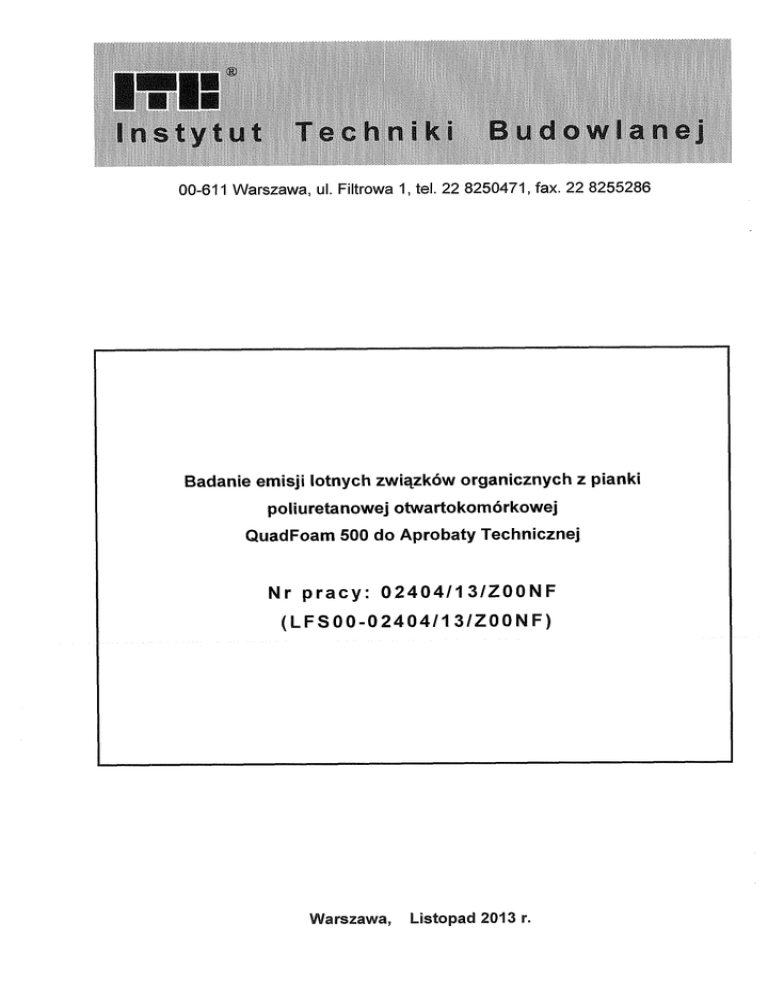 00-611 Warszawa, ul. Filtrowa 1, tel. 22 8250471, fax. 22 8255286 Badanie emisji lotnych związków organicznych z pianki poliuretanowej otwartokomórkowej OuadFoam 500 do Aprobaty Technicznej Nr pracy: 02404/1 3 /Z 0 0 N F ( LFS 00- 0 2404/ 1 3 / Z 0 0 N F ) Warszawa, Listopad 2013 r. INSTYTUT TECHNIKI BUDOWLANEJ ZAKŁAD FIZYKI CIEPLNEJ, INSTALACJI SANITARNYCH i ŚRODOWISKA Pracownia Ochrony Środowiska LICZBA STRON 4 STRONA 1 00-611 W arszawa, ul. Filtrowa 1, tel. (022) 825 92 29, faks (022) 57 96 486, e-mail: fizyka-srodowisko@ itb.pl Spis treści 1. Podstawa formalna wykonania pracy 2 2. Cel i zakres pracy 2 3. Próbka wyrobu do badań 2 4. Metodyka badania 3 5. Wynik badania wyrobu 3 6. Opinia 4 Załączniki: Raport z badania nr LFSOO-2404/13/ZOONF INSTYTUT TECHNIKI BUDOWLANEJ ZAKŁAD FIZYKI CIEPLNEJ, INSTALACJI SANITARNYCH i ŚRODOWISKA Pracownia Ochrony Środowiska LICZBA STRON STRONA 4 2 00-611 W arszawa, ul. Filtrowa 1, tel. (022) 825 92 29, faks (022) 57 96 486, e-mail: fizvka-srodowisko@ itb.pl 1. Podstawa formalna wykonania pracy Podstawą formalną wykonania pracy był wniosek o przeprowadzenie badań laboratoryjnych z dnia 17 października 2013 złożony przez firmę Purtech Poland Sp. J. ul. M. Fornalskiej 29, 43-602 Jaworzno na wykonanie badania emisji lotnych związków organicznych z otwartokomórkowej pianki poliuretanowej OuadFoam® 500. Warunki realizacji pracy określa umowa nr 2404/13/Z00NF na wykonanie pracy pt. „Badanie emisji lotnych związków organicznych z pianki poliuretanowej otwartokomórkowej OuadFoam 500 do Aprobaty Technicznej”. 2. Cel i zakres pracy Celem pracy była ocena emisji lotnych związków organicznych z pianki poliuretanowej OuadFoam® 500 zgodnie z wymaganiami Ustaleń Aprobacyjnych ITB GW VIII.21/2011 dotyczących wydzielania niebezpiecznych substancji z wyrobów budowlanych. Zakres pracy obejmował zbadanie emisji lotnych związków organicznych (rozpuszczalników, monomerów nienasyconych oraz izocyjanianów) z pianki poliuretanowej OuadFoam® 500, ze szczególnym uwzględnieniem związków uznanych za szkodliwe dla zdrowia według zarządzenia Ministra Zdrowia i Opieki Społecznej z dnia 12.03.1996 r. w sprawie dopuszczalnych stężeń i natężeń czynników szkodliwych dla zdrowia wydzielanych przez materiały budowlane, urządzenia i elementy wyposażenia w pomieszczeniach przeznaczonych na pobyt ludzi (Monitor Polski z 1996 r. Nr 19, poz.231).3 3. Próbka wyrobu do badań Do badań laboratoryjnych Zleceniodawca w dniu 23 października 2012 r. dostarczył piankę poliuretanową OuadFoam® 500 o powierzchni jednej próbki 0,3 m x 0,6 m i średniej grubości 15 cm. Próbki zostały przygotowane przez Zleceniodawcę w dniu 17 października 2013 r.. Badaniu emisji lotnych związków organicznych poddano dwie próbki pianki o powierzchni 0,18 m2 każda. INSTYTUT TECHNIKI BUDOWLANEJ ZAKŁAD FIZYKI CIEPLNEJ, INSTALACJI SANITARNYCH i ŚRODOWISKA Pracownia Ochrony Środowiska LICZBA STRON STRONA 4 3 00-611 W arszawa, ul. Filtrowa 1, tel. (022) 825 92 29, faks (022) 57 96 486, e-mail: fizyka-srodowlsko@ itb.pl 4. Metodyka badania Próbki pianki poliuretanowej QuadFoam® 500, po ich rozpakowaniu wstawiono do komór laboratoryjnych. Komory były stalowe, objętości 0,1 m3, wentylowane z szybkością 0,05 m3/h. Temperatura w komorach była równa 23 + 2 °C, względna wilgotność powietrza 50 + 5 %. Nasycenie komór 1,8 m2/m3, co zgodnie z normą PN-EN ISO 16000-9:2009 odpowiada zastosowaniu pianki na powierzchni wszystkich ścian i stropie pomieszczenia modelowego. Pobór prób zanieczyszczeń powietrza z komór prowadzono zgodnie z normą PN-EN ISO 16000-9:2009 „Powietrze wnętrz - Część 9: Oznaczanie emisji lotnych związków organicznych z wyrobów budowlanych i wyposażenia - Badanie emisji metodą komorową”. Poboru powietrza dokonano po trzech dniach od umieszczenia próbek w zamkniętych, wentylowanych komorach. Próby zanieczyszczeń powietrza badano zgodnie z: PB LS-002/5/12-2011 Oznaczanie par rozpuszczalników i monomerów nienasyconych w powietrzu metodą chromatografii gazowej z wzbogaceniem próbki” . Identyfikację jakościową związków występujących w powietrzu komór prowadzono przy pomocy zestawu GC/MS Clarus 500. ISO 16000-6:2011 Determination of volatile organic compounds in indoor and test chamber air by active sampling on Tenax TA sorbent, thermal desorption and gas chromatography using MS/FID. PB LS-012/2/09-2004 Oznaczenie izocjanianów w powietrzu metodą chromatografii cieczowej w postaci pochodnych 1-(2-pirdylopierazyny). 5. Wynik badania wyrobu Wyniki badań przedstawiono w raporcie z badania nr LFS00-2404/13/Z00NF stanowiącym załącznik do opracowania. W powietrzu komór, w których znajdowały się próbki pianki poliuretanowej QuadFoam® 500 stwierdzono występowanie par trimetylosilanolu, heksametylosilanolu, oktametylosilanolu, limonenu oraz esteru 2-(dimetyloamino)etylowego kwasu karbaminowego, których średnie stężenie, po 3 dniach sezonowania wynosiło dla: trimetylosilanolu 152 ng/m3, heksametylosilanolu 57 ng/m3, oktametylosilanolu 6 (ig/m3, limonenu 51 |ig/m3 oraz esteru 2-(dimetyloamino)etylowego kwasu karbaminowego 55 \iglm3. INSTYTUT TECHNIKI BUDOWLANEJ ZAKŁAD FIZYKI CIEPLNEJ, INSTALACJI SANITARNYCH i ŚRODOWISKA Pracownia Ochrony Środowiska LICZBA STRON STRONA 4 4 00-611 W arszawa, ul. Filtrowa 1, tel. (022) 825 92 29, faks (022) 57 96 486, e-mail: fizvka-srodowisko@ itb.pl Nie stwierdzono emisji par 4,4’-diizocyjanianu difenylometanu (wynik poniżej oznaczalności). Zarządzeniem Ministra Zdrowia i Opieki Społecznej z dnia 12.03.1996 r. w sprawie dopuszczalnych stężeń i natężeń czynników szkodliwych dla zdrowia, wydzielanych przez materiały budowlane, urządzenia i elementy wyposażenia w pomieszczeniach przeznaczonych na pobyt ludzi (Monitor Polski nr 19 rok 1996, poz. 231) pomieszczenia dzielą się na: - kategorii A - mieszkalne, przeznaczone na stały pobyt chory