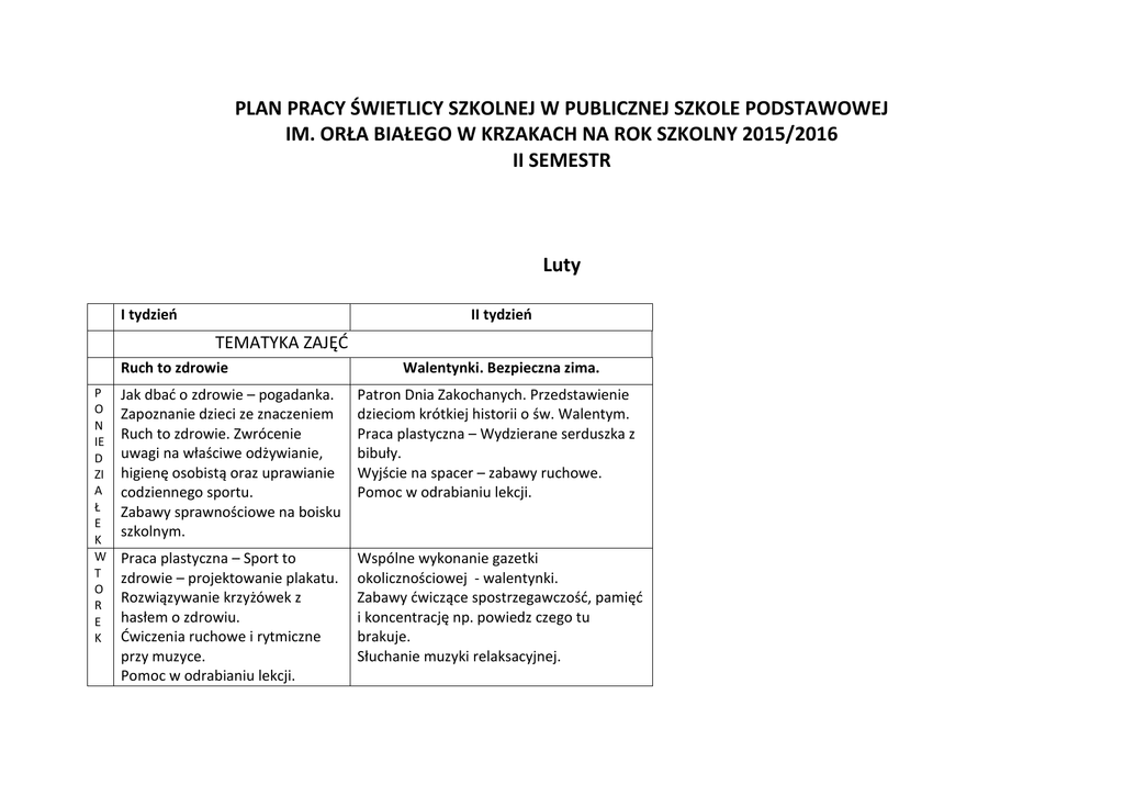 PLAN PRACY ŚWIETLICY SZKOLNEJ W PUBLICZNEJ SZKOLE PODSTAWOWEJ IM. ORŁA BIAŁEGO W KRZAKACH NA ROK SZKOLNY 2015/2016 II SEMESTR Luty I tydzień II tydzień TEMATYKA ZAJĘĆ Ruch to zdrowie P O N IE D ZI A Ł E K W T O R E K Walentynki. Bezpieczna zima. Jak dbać o zdrowie – pogadanka. Zapoznanie dzieci ze znaczeniem Ruch to zdrowie. Zwrócenie uwagi na właściwe odżywianie, higienę osobistą oraz uprawianie codziennego sportu. Zabawy sprawnościowe na boisku szkolnym. Patron Dnia Zakochanych. Przedstawienie dzieciom krótkiej historii o św. Walentym. Praca plastyczna – Wydzierane serduszka z bibuły. Wyjście na spacer – zabawy ruchowe. Pomoc w odrabianiu lekcji. Praca plastyczna – Sport to zdrowie – projektowanie plakatu. Rozwiązywanie krzyżówek z hasłem o zdrowiu. Ćwiczenia ruchowe i rytmiczne przy muzyce. Pomoc w odrabianiu lekcji. Wspólne wykonanie gazetki okolicznościowej - walentynki. Zabawy ćwiczące spostrzegawczość, pamięć i koncentrację np. powiedz czego tu brakuje. Słuchanie muzyki relaksacyjnej. Ś R O D A Czytanie ciekawostek o osiągnięciach Polaków w różnych dziedzinach sportu – prasa. Praca plastyczna – Moja ulubiona dziedzina sportu – farby. Zabawy ruchowe na świeżym powietrzu. C Układanie tematycznych Z rozsypanek wyrazowych z hasłem W o sportach zimowych. A R Praca plastyczna – Na sankach, na T nartach, na łyżwach – E wydzieranka. K Zabawy sprawnościowe na boisku szkolnym. PI Projekcja bajek dla dzieci. Ą Praca plastyczna – wykonanie T ilustracji do obejrzanej bajki. E K Zabawy ruchowe przy muzyce. Jak w naszej szkole obchodzone są Walentynki? - luźne wypowiedzi dzieci. Przygotowanie niespodzianki dla kolegi, koleżanki – praca plastyczna – kartka Serduszko. Zabawy ruchowe, gry planszowe. Zapoznanie dzieci z różnymi sposobami spędzania czasu wolnego. Rozmowy na temat zasad bezpieczeństwa podczas zabaw zimowych. Praca plastyczna – Zimowe zabawy na śniegu – prac pasta do zębów. Zabawy ruchowe przy muzyce. Dobre rady i przestrogi na ferie – pogadanka. Prace porządkowe w świetlicy. Zajęcia w pracowni klocków lego. marzec I tydzień II tydzień III tydzień IV tydzień V tydzień TEMATYKA ZAJĘĆ Wspomnienia po feriach. Zgubne nałogi. P Rozmowa dziećmi na temat O minionych ferii. N Wykonanie pracy IE D plastycznej na ten temat. ZI Gry planszowe, zabawy A ruchowe przy muzyce. L Przegląd prasy dziecięcej – E głośne czytanie ciekawych K artykułów. W Uwiadomienie dzieciom T skutków palenia O papierosów, picia alkoholu i R E brania narkotyków. K Plakat – Zgubne nałogi – praca w grupach. Gry i zabawy stolikowe. Ś Zapoznanie dzieci z innymi R uzależnieniami np. od O komputera, TV. D skutków zbyt A Poznanie długiego korzystania z mediów – przykłady. Kolorowanie obrazków o Kobietki małe i duże Rozmowa na temat tego święta i powodów jego obchodzenia. Wykonanie gazetki okolicznościowej – Dzień Kobiet. Zabawy ruchowe na świeżym powietrzu. Zawody wykonywane przez kobiety – rozmowa kierowana. Kwiatek dla pani – wycinanka witrażowa. Pomoc w odrabianiu pracy domowej. Gry planszowe. Podkreślenie roli kobiety w życiu i codziennej pracy – pogadanka. Wykonanie kompozycji kwiatowej z bibuły – praca plastyczna. Gry i zabawy stolikowe. Pierwsze podmuchy wiosny Tradycje i obrzędy świąteczne Obserwacja i określenie zmian w Zapoznanie dzieci z przyrodzie związanych z wiosną tradycjami i obrzędami – spacer po okolicy. wielkanocnymi. Wiosenne kwiaty – malowanie Wspólne wykonanie gazetki farbami okolicznościowej Wielkanoc. Gry i zabawy ruchowe. Zabawy ruchowe przy muzyce. Święta, święta i po świętach Poniedziałek Wielkanocny Czytanie wiersza J. Brzechwy Przyjście wiosny z podziałem na role. Wiosenne kwiaty z kolorowej bibuły – praca plastyczna. Gry planszowe, układanie puzzli. Redagowanie i pisanie życzeń świątecznych. Wykonanie karty świątecznej – praca plastyczna. Pomoc w odrabianiu lekcji. Dzień wolny od zajęć Wiosenne porządki. Poznanie narzędzi ogrodniczych i ich zastosowania. Przebiśnieg – malowanie farbami – praca plastyczna. Zabawa w kalambury – przedstawianie treści zadania Święconka, śmigus – dyngus, pisanki i inne zwyczaje dyskusja na temat kultywowania tradycji w naszych domach. Stół wielkanocny lub śmigus – dyngus – praca plastyczna Dzielenie się wspomnieniami ze Świąt Wielkanocnych – swobodne wypowiedzi dzieci. Kolorowanie malowanek. Słuchanie ulubionej muzyki. Zabawy na koncentrację i różnej tematyce. Słuchanie piosenek dla dzieci. C Jak poszczególne Z uzależnienia wpływają na W zdrowie i naukę dzieci? – A R pogadanka. T Zawody w rzędach na sali E gimnastycznej lub na K dworze – współzawodnictwo w grupie. Pomoc w odrabianiu prac domowych. Gry i zabawy stolikowe. PI Ą T E K Wideoteka młodego człowieka – projekcja bajek dla dzieci. Praca plastyczna – wykonanie ilustracji do obejrzanej bajki. Zabawy ruchowe przy muzyce. Sylwetki sławnych kobiet w literaturze sztuce, nauce, sporcie – pogadanka. Tulipany – praca plastyczna techniką orgiami. Zabawy ruchowe na boisku szkolnym. Zasady dobrego zachowania wobec kobiety – rozmowa kierowana. Moja mama pracuje w …zabawa sytuacyjna. Rozwiązywanie krzyżówek o zawodach kobiet. Nasza Pani - portret ruchem i mimiką. Pomoc w odrabianiu pracy domowej. Praca w polu i ogrodzie – rozmowa kierowana. Praca plastyczna pastelami – Wierzbowe kotki. Zabawy ruchowe na boisku szkolnym. kredkami. Gry i zabawy stolikowe. pamięć. Wielki Czwartek Dzień spokoju i relaksu – rozmowa kierowana. Słuchanie muzyki relaksującej. Wypisywanie przyczyn hałasu na świetlicy szkolnej. Przepis na ciszę – pomysły na ciszę w świetlicy – praca w grupach. Zabawy ruchowe. Wyjście na spacer. Zajęcia w pracowni klocków lego. Wielki Piątek Projekcja bajek i filmów dla dzieci. Wykonanie ilustracji do oglądanej bajki. Zabawy przy muzyce. kwiecie
