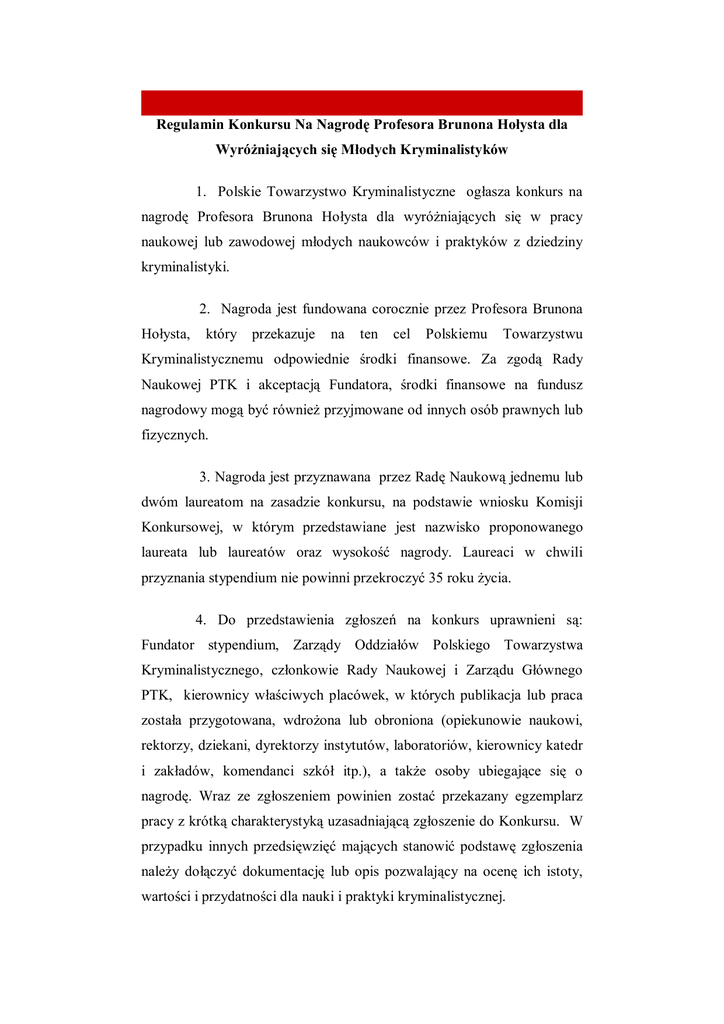 Regulamin Konkursu Na Nagrodę Profesora Brunona Hołysta dla Wyróżniających się Młodych Kryminalistyków 1. Polskie Towarzystwo Kryminalistyczne ogłasza konkurs na nagrodę Profesora Brunona Hołysta dla wyróżniających się w pracy naukowej lub zawodowej młodych naukowców i praktyków z dziedziny kryminalistyki. 2. Nagroda jest fundowana corocznie przez Profesora Brunona Hołysta, który przekazuje na ten cel Polskiemu Towarzystwu Kryminalistycznemu odpowiednie środki finansowe. Za zgodą Rady Naukowej PTK i akceptacją Fundatora, środki finansowe na fundusz nagrodowy mogą być również przyjmowane od innych osób prawnych lub fizycznych. 3. Nagroda jest przyznawana przez Radę Naukową jednemu lub dwóm laureatom na zasadzie konkursu, na podstawie wniosku Komisji Konkursowej, w którym przedstawiane jest nazwisko proponowanego laureata lub laureatów oraz wysokość nagrody. Laureaci w chwili przyznania stypendium nie powinni przekroczyć 35 roku życia. 4. Do przedstawienia zgłoszeń na konkurs uprawnieni są: Fundator stypendium, Zarządy Oddziałów Polskiego Towarzystwa Kryminalistycznego, członkowie Rady Naukowej i Zarządu Głównego PTK, kierownicy właściwych placówek, w których publikacja lub praca została przygotowana, wdrożona lub obroniona (opiekunowie naukowi, rektorzy, dziekani, dyrektorzy instytutów, laboratoriów, kierownicy katedr i zakładów, komendanci szkół itp.), a także osoby ubiegające się o nagrodę. Wraz ze zgłoszeniem powinien zostać przekazany egzemplarz pracy z krótką charakterystyką uzasadniającą zgłoszenie do Konkursu. W przypadku innych przedsięwzięć mających stanowić podstawę zgłoszenia należy dołączyć dokumentację lub opis pozwalający na ocenę ich istoty, wartości i przydatności dla nauki i praktyki kryminalistycznej. 5. Komisja Konkursowa składa się z pięciu osób, cieszących się uznaniem i autorytetem w polskim środowisku kryminalistycznym. Jednym z członków Komisji powinien być przewodniczący lub wiceprzewodniczący Rady Naukowej PTK. Komisję Konkursową powołuje na dwuletnią kadencję Rada Naukowa PTK, wyznaczając jej przewodniczącego. 6. Nagrodę otrzyma osoba lub osoby, których dorobek naukowy lub zawodowy Komisja Konkursowa uzna za wybitny, wyróżniający się spośród dorobku osób zgłoszonych do Konkursu. obejmować pracę doktorską lub Dorobek ten może inne opracowanie o tematyce kryminalistycznej bądź też znaczące osiągnięcie praktyczne polegające m.in. na opracowaniu kryminalistycznych, innowacyjnego lub rozwinięciu wprowadzeniu rozwiązania do nowej praktyki technicznego metody badań kryminalistycznej lub organizacyjnego, zrealizowaniu projektu naukowego o priorytetowym znaczeniu dla nauki i praktyki kryminalistycznej. Uwzględniane w konkursie publikacje lub inne prace powinny być przygotowywane lub realizowane w okresie poprzedzającym przyznanie nagrody. 7. Przyznane nagrody są wypłacane jest jednorazowo w ramach środków przekazanych na ten cel przez Fundatora. Laureat lub laureaci otrzymują także dyplomy okolicznościowe. 8. Zgłoszenie wniosku Radzie Naukowej przez Komisję Konkursową, o którym jest mowa w p. 3, powinno nastąpić nie później niż do dnia 15 września każdego roku, w którym przyznawana jest nagroda.. Uchwała Rady Naukowej o przyznaniu nagrody powinna być podjęta najpóźniej do dnia 15 października tego roku. Posiedzenie Rady Naukowej PTK zwołuje jej Przewodniczący. Rada Naukowa podejmuje uchwałę w głosowaniu, większością głosów. W razie równej liczby głosów rozstrzygający jest głos prowadzącego obrady. 9. Dyplom przyznający nagrodę wręczany jest uroczyście w obecności Fundatora lub jego przedstawiciela, Prezesa Polskiego Towarzystwa Kryminalistycznego, członków Rady Naukowej oraz zaproszonych gości. 10. W przypadku nie przyznania nagrody w danym roku środki zwiększają fundusz nagrodowy w następnych latach. 11. Prace nadesłane na Konkurs są archiwizowane w bibliotece PTK i nie są zwracane autorom. Prace te mogą być wykorzystywane w działalności statutowej PTK, jeżeli ich autor nie wniesie zastrzeżenia. 12. W sprawach nie uregulowanych w niniejszym regulaminie lub wymagających zmian decyzje podejmuje Rada Naukowa, a w razie braku jej kompetencji Zarząd Główny lub inny organ władzy PTK, zgodnie ze statutem. Zarząd Główny i Rada Naukowa Polskiego Towarzystwa Kryminalistycznego