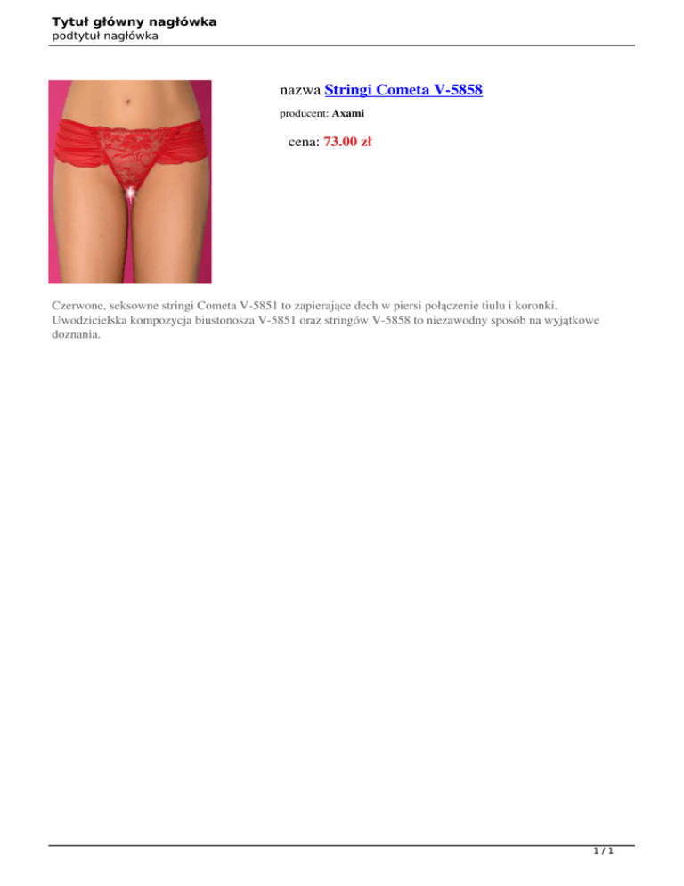 Tytuł główny nagłówka podtytuł nagłówka nazwa Stringi Cometa V-5858 producent: Axami cena: 73.00 zł Czerwone, seksowne stringi Cometa V-5851 to zapierające dech w piersi połączenie tiulu i koronki. Uwodzicielska kompozycja biustonosza V-5851 oraz stringów V-5858 to niezawodny sposób na wyjątkowe doznania. 1/1