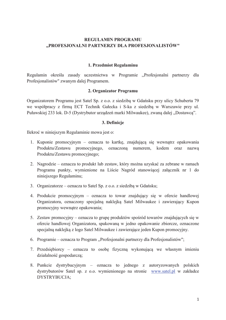 REGULAMIN PROGRAMU ,,PROFESJONALNI PARTNERZY DLA PROFESJONALISTÓW" 1. Przedmiot Regulaminu Regulamin określa zasady uczestnictwa w Programie ,,Profesjonalni partnerzy dla Profesjonalistów" zwanym dalej Programem. 2. Organizator Programu Organizatorem Programu jest Satel Sp. z o.o. z siedzibą w Gdańsku przy ulicy Schuberta 79 we współpracy z firmą ECT Technik Gałecka i S-ka z siedzibą w Warszawie przy ul. Puławskiej 233 lok. D-5 (Dystrybutor urządzeń marki Milwaukee), zwaną dalej „Dostawcą”. 3. Definicje Ilekroć w niniejszym Regulaminie mowa jest o: 1. Kuponie promocyjnym – oznacza to kartkę, znajdującą się wewnątrz opakowania Produktu/Zestawu promocyjnego, oznaczoną numerem, kodem oraz nazwą Produktu/Zestawu promocyjnego; 2. Nagrodzie – oznacza to produkt lub zestaw, który można uzyskać za zebrane w ramach Programu punkty, wymienione na Liście Nagród stanowiącej załącznik nr 1 do niniejszego Regulaminu; 3. Organizatorze – oznacza to Satel Sp. z o.o. z siedzibą w Gdańsku; 4. Produkcie promocyjnym – oznacza to towar znajdujący się w ofercie handlowej Organizatora, oznaczony specjalną naklejką Satel Milwaukee i zawierający Kupon promocyjny wewnątrz opakowania; 5. Zestaw promocyjny – oznacza to grupę produktów spośród towarów znajdujących się w ofercie handlowej Organizatora, spakowaną w jedno opakowanie zbiorcze, oznaczone specjalną naklejką z logo Satel Milwaukee i zawierające jeden Kupon promocyjny. 6. Programie – oznacza to Program ,,Profesjonalni partnerzy dla Profesjonalistów"; 7. Przedsiębiorcy – oznacza to osobę fizyczną wykonującą we własnym imieniu działalność gospodarczą; 8. Punkcie dystrybucyjnym – oznacza to jednego z autoryzowanych polskich dystrybutorów Satel sp. z o.o. wymienionego na stronie www.satel.pl w zakładce DYSTRYBUCJA; 1 9. Punkcie redystrybucyjnym – oznacza firmę zaopatrującą się u jednego z polskich autoryzowanych dystrybutorów, z którą Satel sp. z o.o. nie ma podpisanej umowy o współpracy; 10. Punkty uznane – oznacza to punkty uzyskane po prawidłowym wpisaniu danych z Kuponu promocyjnego na stronie Programu na koncie Uczestnika; 11. Regulaminie – oznacza to niniejszy Regulamin; 12. Uczestniku – oznacza to przedsiębiorcę, który spełnił warunki uczestnictwa w Programie zgodnie z pkt. 7.2 Regulaminu. 13. Formularzu – oznacza to elektroniczną kartę zgłoszeniową z danymi osobowymi Uczestnika znajdujący się na stronie www.satel.pl/profesjonalni. 4. Produkty/Zestawy Promocyjne biorące udział w Programie Programem objęte są wyłącznie Produkty/Zestawy promocyjne, których lista stanowi załącznik nr 2. 5. Czas trwania Programu 1. Program trwa od 01.09.2011r. do 29.02.2012 r. 2. O ewentualnym przedłużeniu lub skróceniu czasu trwania Programu Organizator powiadomi Uczestników przez ogłoszenie takiej informacji na stronie www.satel.pl/profesjonalni i na wskazany w Formularzu adres e-mail. 6. Miejsce przeprowadzenia Programu 1. Program zostanie przeprowadzony na terenie kraju. 2. Lista Autoryzowanych Dystrybutorów dostępna jest na stronie www.satel.pl w zakładce DYSTRYBUCJA. 7. Uczestnicy Programu 1. Uczestnikami Programu są przedsiębiorcy dokonujący zakupów dystrybucyjnych Organizatora i w punktach redystrybucyjnych. w punktach 2. Warunkiem uczestnictwa w Programie jest: a. zarejestrowanie się na stronie www.satel.pl/profesjonalni poprzez wypełnienie Formularza dostępnego na tej stronie (po wypełnieniu Formularza Uczestnik otrzyma login i hasło do indywidualnego konta na wskazany w Formularzu adres e-mail), b. wydrukowanie i wypełnienie „Oświadczenia Uczestnika Programu”, w tym dokonanie akceptacji Regulaminu, wyrażenie zgody na przetwarzanie danych osobowych przez Organizatora w celach związanych z realizacją niniejszego Programu oraz podpisanie tego oświadczenia. Podpisane oświadczenie należy 2 następnie przesłać: faksem na numer (58 320 94 01) lub zeskanowane na adres mailowy - [email protected]; c. dokonanie zakupu Produktu/Zestawu Promocyjnego w Dystrybucyjnym Organizatora bądź w Punkcie Redystrybucyjnym; Punkcie d. zalogowanie się na stworzonym koncie, wprowadzenie numeru kuponu promocyjnego i numeru MNI Produktu/Zestawu Promocyjnego. 3. Udział w Programie i podanie związanych z udziałem w nim danych osobowych są całkowicie dobrowolne. Dane osobowe Uczestników przetwarzane będą wyłącznie na potrzeby prowadzenia Programu. 8. Zasady naliczania Punktów 1. Punkty za zakupione przez Uczestnika Produkty/Zestawy Promocyjne naliczane są automatycznie, podczas rejestracji Produktu/Zestawu Promocyjnego na koncie Uczestnika Programu. Rejestracja odbywa się poprzez wpisanie numeru Kuponu promocyjnego i numeru MNI Produktu/Zestawu promocyjnego. 2. Punkty przyznawane są zgodnie z tabelą Produktów/Zestawów Promocyjnych stanowiącą załącznik nr 2 do niniejszego Regulaminu. Aktualna punktacja znajduje się na stronie www.satel.pl/profesjonalni w zakładce PRODUKTY/ZESTAWY PROMOCYJNE. 3. Organizator Programu zastrzega sobie możliwość zmiany w trakcie trwania Programu ilości punktów przydzielonych do danego Produktu/Zestawu Promocyjnego oraz dodanie lub usunięcie danego Produktu/Zestawu Promocyjnego z listy Produktów/Zestawów Promocyjnych biorących udział w Programie. 4. Zebrane punkty przez każdego Uczestnika Programu podlegają sumowaniu w okresie trwania Programu. 5. Produkt/Zestaw Promocyjny biorący udział w Programie podlega zwrotowi tylko i wyłącznie w nienaruszonym oryginalnym opakowaniu i z oryginalnymi plombami w postaci naklejek z logo Satel Milwaukee. W przypadku zwrotu Produktów/Zestawów Promocyjnych zabronione jest wyjmowanie Kuponów promocyjnych z opakowania Produktu promocyjnego, jak i z opakowania zbiorczego Zestawu promocyjnego. 9. Zasady przyznawania nagród 1. Uczestnicy Programu w dowolnym momencie mogą zgłosić chęć wymiany punktów na Nagrodę/y z Listy Nagród. Wartość