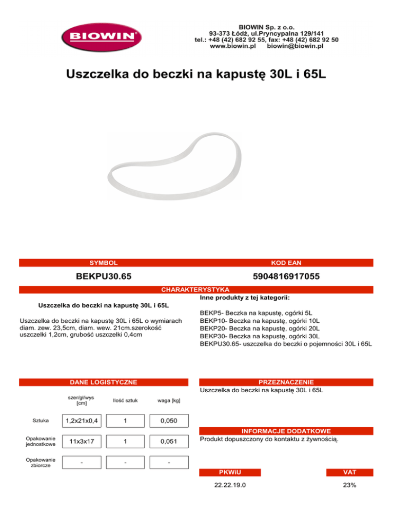 Uszczelka do beczki na kapustę 30L i 65L SYMBOL KOD EAN BEKPU30.65 5904816917055 CHARAKTERYSTYKA Inne produkty z tej kategorii: Uszczelka do beczki na kapustę 30L i 65L BEKP5- Beczka na kapustę, ogórki 5L BEKP10- Beczka na kapustę, ogórki 10L Uszczelka do beczki na kapustę 30L i 65L o wymiarach diam. zew. 23,5cm, diam. wew. 21cm.szerokość BEKP20- Beczka na kapustę, ogórki 20L uszczelki 1,2cm, grubość uszczelki 0,4cm BEKP30- Beczka na kapustę, ogórki 30L BEKPU30.65- uszczelka do beczki o pojemności 30L i 65L DANE LOGISTYCZNE Sztuka PRZEZNACZENIE Uszczelka do beczki na kapustę 30L i 65L szer/gł/wys [cm] Ilość sztuk waga [kg] 1,2x21x0,4 1 0,050 Opakowanie jednostkowe 11x3x17 1 0,051 Opakowanie zbiorcze - - - INFORMACJE DODATKOWE Produkt dopuszczony do kontaktu z żywnością. PKWiU VAT 22.22.19.0 23%