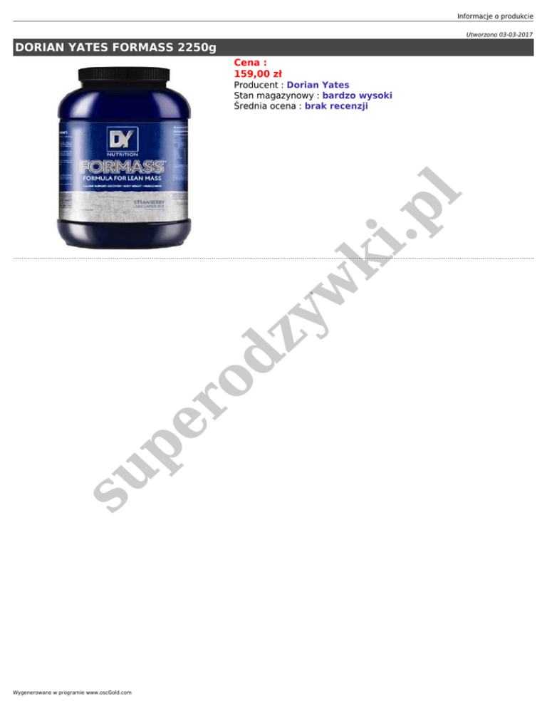 Informacje o produkcie Utworzono 03-03-2017 DORIAN YATES FORMASS 2250g Cena : 159,00 zł ki .p l Producent : Dorian Yates Stan magazynowy : bardzo wysoki Średnia ocena : brak recenzji ro dz y w Legendarna odżywka węglowodanowo-białkowa (gainer) tylko dla prawdziwych kulturystów! Powoduje mega przyrost masy mięśniowej, gwarantuje szybką regenerację po treningu siłowym.Formula for Lean Mass. Opis i charakterystyka legendarnej odżywki węglowodanowo - białkowej (gainera) Formass renomowanej firmy Dorian Yates Nutrition su pe Rewelacyjna odżywka węglowodanowo-białkowa Dorian Yates Formass to idealna odżywka typu gainer dla sportowców, którzy mają zwiększone zapotrzebowanie na wysokiej jakości białko oraz węglowodany. Najlepszej jakości odżywka masowa, która jest pełnowartościowym białkiem stosowanym w celu zdobycia i zachowania masy ciała oraz po treningu - w celu lepszej i szybkiej regeneracji. Dobra odżywka węglowodanowo - energetyczna Formass została stworzona - tak samo jak wszystkie inne produkty Dorian Yates Nutrition - przez panel naukowy Doriana Yetes, na który składają się naukowcy, dietetycy i konsultanci techniczni. Dorian Yates nadzorował cały proces powstawania produktu, aby upewnić się, że Formass pomoże uzyskać jak najwięcej beztłuszczowej (suchej) masy ciała. Dlatego też w masówce zostały użyte najwyższej jakości składniki matrix 6 frakcji białek, węglowodany złożone, olej MCT, błonnik oraz enzymy trawienne. Wygenerowano w programie www.oscGold.com Zalety mega hardcore odżywki węglowodanowo-białkowej Formass od Dorian Yates Nutrition: .p l idealna odżywka do budowania beztłuszczowej masy mięśniowej, idealna odżywka potreningowa, gwarantuje szybką i efektywną regenerację potreningową ki wykazuje działanie anaboliczne oraz antykataboliczne, w wspomaga wzrost nie tylko masy, ale także siły mięśni, ro dz y w składzie zawiera najlepszej jakości matrix różnych białek o różnym czasie wchłaniania Tempro TM oraz kompleks najlepszych węglowodanów złożonych, pe rewelacyjne smaki! su Najlepsza odżywka do budowy beztłuszczowej, suchej masy mięśniowej to stosunkowo tania odżywka Dorian Yates Nutrition - Formass W trakcie cyklu masowego lub siłowo - masowego pożądany jest przez większość sportowców przyrost masy mięśniowej, przy jednoczesnej utracie tkanki tłuszczowej. I właśnie taki jest rewelacyjnie pyszny gainer Formass - powoduje budowę suchej, beztłuszczowej masy mięśniowej. Dorian Yates Formass to odżywka masowa, która stymuluje syntezę obu białek mięśniowych i glikogenu. Jest to o tyle ważne, że ciężki i długi trening może obniżyć poziom glikogenu mięśniowego nawet o 30-40%, a niski poziom glikogenu w mięśniach tylko może zaszkodzić - niski poziom glikogenu powoduje Informacje o produkcie mniejszą efektywność pracy, a może nawet zahamować wzrost mięśni. Dlatego też ważne jest, aby po treningu organizm miał dostarczoną odpowiednią ilość węglowodanów. ro dz y w ki .p l Bardzo dobra, a przy tym stosunkowo tania odżywka węglowodanowo - białkowa Formass legendarnej firmy Dorian Yates Nutrition zawiera najwyższej jakości mieszankę białek TEMPRO™ - matrix białek przetworzonych w niskiej temperaturze, aby ich jakość była jak najlepsza. Ponadto, w skład mega silnego i skutecznego gainera wchodzą najlepszej jakości węglowodany złożone wysokocząteczkowej, długołańcuchowej woskowej skrobi kukurydzianej (waxy maize). Węglowodany zawarte w najlepszej odżywce węglowodanowo - białkowej Formass DY to kompleks węglowodanów o różnym tempie wchłaniania oraz o niskim indeksie glikemicznym. W efekcie węglowodany z gainera Formass uwalniają się natychmiastowo, jednostajnie i długotrwale. Idealnie uzupełniają zapasy glikogenu utraconego podczas ciężkiego treningu. su pe Białka zastosowane w najskuteczniejszej odżywce węglowodanowo-białkowej Formass: kazeina micelarna izolat białka serwatkowego (WPI) koncentrat białka serwatki (WPC) albumina jaj peptydy glutaminy hydrolizat białka serwatkowego Wygenerowano w programie www.oscGold.com mikrocząsteczkowe WPC w ki .p l Rewelacyjna odżywka węglowodanowo-białkowa FORMASS - była wielokrotnie testowana przez Doriana i przez jego zespół naukowy. Dzięki temu można śmiało stwierdzić, że Formass to najlepsza odżywka masowa dla sportowców stosowana w celu budowania beztłuszczowej (suchej) masy mięśniowej. W dodatku gainer Formass występuje w mega pysznych wariantach smakowych. ro dz y Zastosowanie oraz dla kogo dedykowana jest odżywka węglowodanowo-białkowa Formass su pe Doskonała mieszanka białek oraz węglowodanów w odżywce masowej Formass Dorian Yates Nutrition to połączenie gwarantujące trwały i długi wzrost anabolizmu, prowadzący do wzrostu beztłuszczowej masy mięśniowej, szybszej regeneracji potreningowej oraz lepsze wyniki. Rewelacyjna odżywka węglowodanowo- białkowa (gainer) od Dorian Yates Nutrition Formass przeznaczona jest dla wszystkich profesjonalnych sportowców dyscyplin siłowych, takich jak kulturystyka czy fitness. Najlepsza i najskuteczniejsza odżywka węglowodanowo-białkowa Formass dzięki zawartości białka oraz węglowodanów złożonych to doskonała odżywka dla sportowców dyscyplin wytrzymałościowych, takich jak kolarstwo lub biegi. ki Sposób użycia: .p l Informacje o produkcie su pe ro dz y w Spożywać co najmniej dwa razy dziennie. Najlepiej stosować ok. 2 godzin przed treningiem, a także jako posiłek potreningowy. Wygenerowano w programie www.oscGold.com