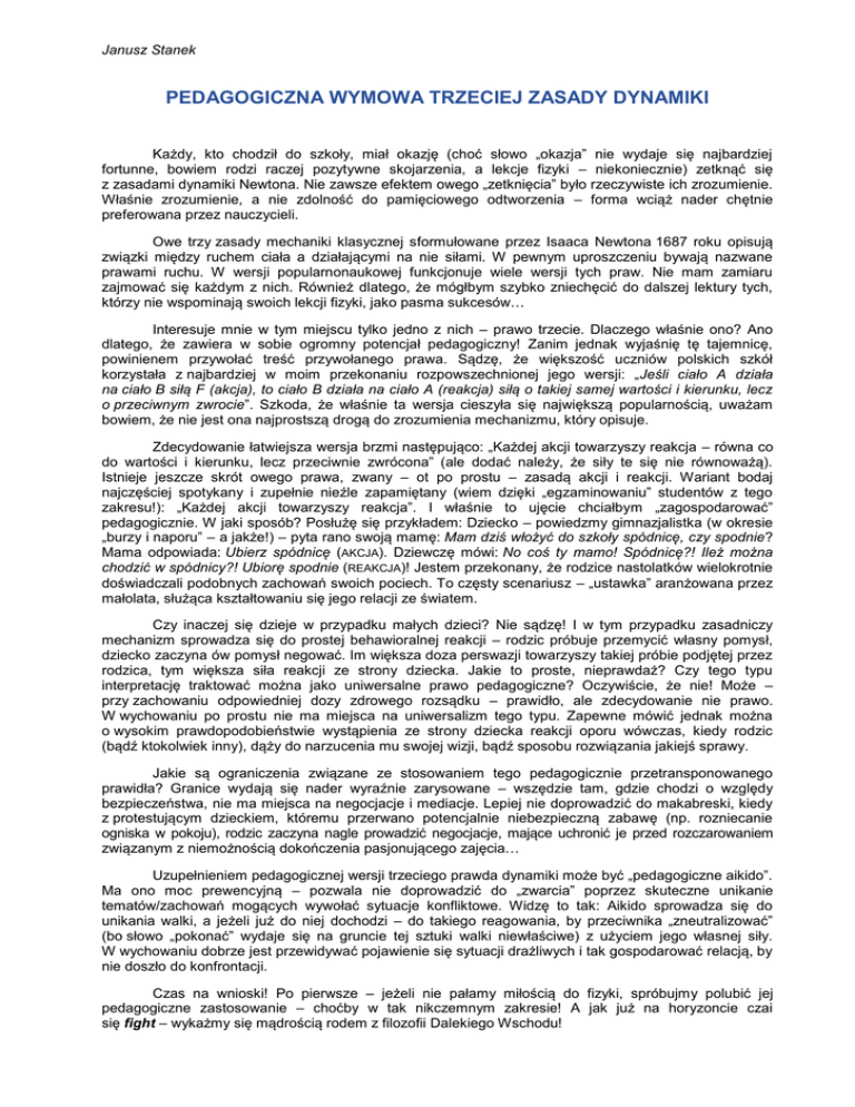 Janusz Stanek PEDAGOGICZNA WYMOWA TRZECIEJ ZASADY DYNAMIKI Każdy, kto chodził do szkoły, miał okazję (choć słowo „okazja” nie wydaje się najbardziej fortunne, bowiem rodzi raczej pozytywne skojarzenia, a lekcje fizyki – niekoniecznie) zetknąć się z zasadami dynamiki Newtona. Nie zawsze efektem owego „zetknięcia” było rzeczywiste ich zrozumienie. Właśnie zrozumienie, a nie zdolność do pamięciowego odtworzenia – forma wciąż nader chętnie preferowana przez nauczycieli. Owe trzy zasady mechaniki klasycznej sformułowane przez Isaaca Newtona 1687 roku opisują związki między ruchem ciała a działającymi na nie siłami. W pewnym uproszczeniu bywają nazwane prawami ruchu. W wersji popularnonaukowej funkcjonuje wiele wersji tych praw. Nie mam zamiaru zajmować się każdym z nich. Również dlatego, że mógłbym szybko zniechęcić do dalszej lektury tych, którzy nie wspominają swoich lekcji fizyki, jako pasma sukcesów… Interesuje mnie w tym miejscu tylko jedno z nich – prawo trzecie. Dlaczego właśnie ono? Ano dlatego, że zawiera w sobie ogromny potencjał pedagogiczny! Zanim jednak wyjaśnię tę tajemnicę, powinienem przywołać treść przywołanego prawa. Sądzę, że większość uczniów polskich szkół korzystała z najbardziej w moim przekonaniu rozpowszechnionej jego wersji: „Jeśli ciało A działa na ciało B siłą F (akcja), to ciało B działa na ciało A (reakcja) siłą o takiej samej wartości i kierunku, lecz o przeciwnym zwrocie”. Szkoda, że właśnie ta wersja cieszyła się największą popularnością, uważam bowiem, że nie jest ona najprostszą drogą do zrozumienia mechanizmu, który opisuje. Zdecydowanie łatwiejsza wersja brzmi następująco: „Każdej akcji towarzyszy reakcja – równa co do wartości i kierunku, lecz przeciwnie zwrócona” (ale dodać należy, że siły te się nie równoważą). Istnieje jeszcze skrót owego prawa, zwany – ot po prostu – zasadą akcji i reakcji. Wariant bodaj najczęściej spotykany i zupełnie nieźle zapamiętany (wiem dzięki „egzaminowaniu” studentów z tego zakresu!): „Każdej akcji towarzyszy reakcja”. I właśnie to ujęcie chciałbym „zagospodarować” pedagogicznie. W jaki sposób? Posłużę się przykładem: Dziecko – powiedzmy gimnazjalistka (w okresie „burzy i naporu” – a jakże!) – pyta rano swoją mamę: Mam dziś włożyć do szkoły spódnicę, czy spodnie? Mama odpowiada: Ubierz spódnicę (AKCJA). Dziewczę mówi: No coś ty mamo! Spódnicę?! Ileż można chodzić w spódnicy?! Ubiorę spodnie (REAKCJA)! Jestem przekonany, że rodzice nastolatków wielokrotnie doświadczali podobnych zachowań swoich pociech. To częsty scenariusz – „ustawka” aranżowana przez małolata, służąca kształtowaniu się jego relacji ze światem. Czy inaczej się dzieje w przypadku małych dzieci? Nie sądzę! I w tym przypadku zasadniczy mechanizm sprowadza się do prostej behawioralnej reakcji – rodzic próbuje przemycić własny pomysł, dziecko zaczyna ów pomysł negować. Im większa doza perswazji towarzyszy takiej próbie podjętej przez rodzica, tym większa siła reakcji ze strony dziecka. Jakie to proste, nieprawdaż? Czy tego typu interpretację traktować można jako uniwersalne prawo pedagogiczne? Oczywiście, że nie! Może – przy zachowaniu odpowiedniej dozy zdrowego rozsądku – prawidło, ale zdecydowanie nie prawo. W wychowaniu po prostu nie ma miejsca na uniwersalizm tego typu. Zapewne mówić jednak można o wysokim prawdopodobieństwie wystąpienia ze strony dziecka reakcji oporu wówczas, kiedy rodzic (bądź ktokolwiek inny), dąży do narzucenia mu swojej wizji, bądź sposobu rozwiązania jakiejś sprawy. Jakie są ograniczenia związane ze stosowaniem tego pedagogicznie przetransponowanego prawidła? Granice wydają się nader wyraźnie zarysowane – wszędzie tam, gdzie chodzi o względy bezpieczeństwa, nie ma miejsca na negocjacje i mediacje. Lepiej nie doprowadzić do makabreski, kiedy z protestującym dzieckiem, któremu przerwano potencjalnie niebezpieczną zabawę (np. rozniecanie ogniska w pokoju), rodzic zaczyna nagle prowadzić negocjacje, mające uchronić je przed rozczarowaniem związanym z niemożnością dokończenia pasjonującego zajęcia… Uzupełnieniem pedagogicznej wersji trzeciego prawda dynamiki może być „pedagogiczne aikido”. Ma ono moc prewencyjną – pozwala nie doprowadzić do „zwarcia” poprzez skuteczne unikanie tematów/zachowań mogących wywołać sytuacje konfliktowe. Widzę to tak: Aikido sprowadza się do unikania walki, a jeżeli już do niej dochodzi – do takiego reagowania, by przeciwnika „zneutralizować” (bo słowo „pokonać” wydaje się na gruncie tej sztuki walki niewłaściwe) z użyciem jego własnej siły. W wychowaniu dobrze jest przewidywać pojawienie się sytuacji drażliwych i tak gospodarować relacją, by nie doszło do konfrontacji. Czas na wnioski! Po pierwsze – jeżeli nie pałamy miłością do fizyki, spróbujmy polubić jej pedagogiczne zastosowanie – choćby w tak nikczemnym zakresie! A jak już na horyzoncie czai się fight – wykażmy się mądrością rodem z filozofii Dalekiego Wschodu!