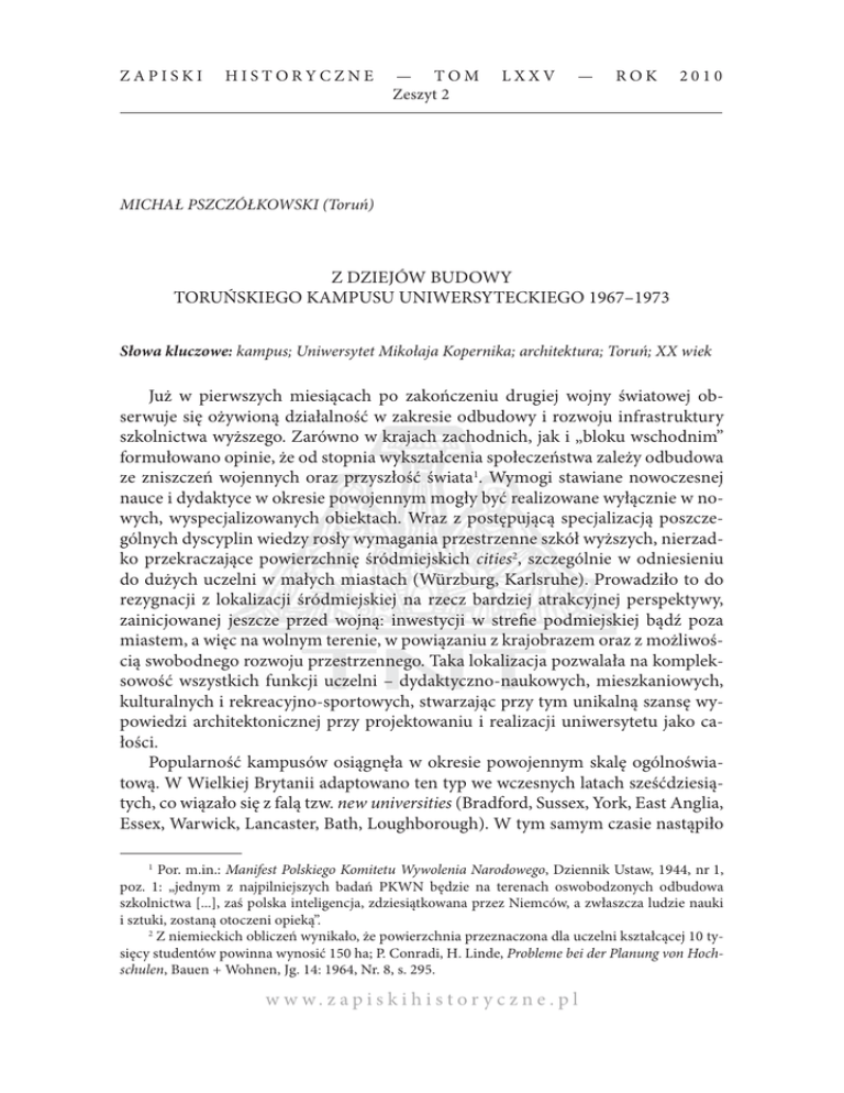ZAPISKI HISTORYCZNE — TOM Zeszyt 2 LXXV — ROK 2010 MICHAŁ PSZCZÓŁKOWSKI (Toruń) Z DZIEJÓW BUDOWY TORUŃSKIEGO KAMPUSU UNIWERSYTECKIEGO 1967–1973 Słowa kluczowe: kampus; Uniwersytet Mikołaja Kopernika; architektura; Toruń; XX wiek Już w pierwszych miesiącach po zakończeniu drugiej wojny światowej obserwuje się ożywioną działalność w zakresie odbudowy i rozwoju infrastruktury szkolnictwa wyższego. Zarówno w krajach zachodnich, jak i „bloku wschodnim” formułowano opinie, że od stopnia wykształcenia społeczeństwa zależy odbudowa ze zniszczeń wojennych oraz przyszłość świata1. Wymogi stawiane nowoczesnej nauce i dydaktyce w okresie powojennym mogły być realizowane wyłącznie w nowych, wyspecjalizowanych obiektach. Wraz z postępującą specjalizacją poszczególnych dyscyplin wiedzy rosły wymagania przestrzenne szkół wyższych, nierzadko przekraczające powierzchnię śródmiejskich cities2, szczególnie w odniesieniu do dużych uczelni w małych miastach (Würzburg, Karlsruhe). Prowadziło to do rezygnacji z lokalizacji śródmiejskiej na rzecz bardziej atrakcyjnej perspektywy, zainicjowanej jeszcze przed wojną: inwestycji w strefie podmiejskiej bądź poza miastem, a więc na wolnym terenie, w powiązaniu z krajobrazem oraz z możliwością swobodnego rozwoju przestrzennego. Taka lokalizacja pozwalała na kompleksowość wszystkich funkcji uczelni – dydaktyczno-naukowych, mieszkaniowych, kulturalnych i rekreacyjno-sportowych, stwarzając przy tym unikalną szansę wypowiedzi architektonicznej przy projektowaniu i realizacji uniwersytetu jako całości. Popularność kampusów osiągnęła w okresie powojennym skalę ogólnoświatową. W Wielkiej Brytanii adaptowano ten typ we wczesnych latach sześćdziesiątych, co wiązało się z falą tzw. new universities (Bradford, Sussex, York, East Anglia, Essex, Warwick, Lancaster, Bath, Loughborough). W tym samym czasie nastąpiło 1 Por. m.in.: Manifest Polskiego Komitetu Wywolenia Narodowego, Dziennik Ustaw, 1944, nr 1, poz. 1: „jednym z najpilniejszych badań PKWN będzie na terenach oswobodzonych odbudowa szkolnictwa [...], zaś polska inteligencja, zdziesiątkowana przez Niemców, a zwłaszcza ludzie nauki i sztuki, zostaną otoczeni opieką”. 2 Z niemieckich obliczeń wynikało, że powierzchnia przeznaczona dla uczelni kształcącej 10 tysięcy studentów powinna wynosić 150 ha; P. Conradi, H. Linde, Probleme bei der Planung von Hochschulen, Bauen + Wohnen, Jg. 14: 1964, Nr. 8, s. 295. w w w. z a p i s k i h i s t o r y c z n e . p l 152 Michał Pszczółkowski [326] upowszechnienie kampusu w krajach skandynawskich (Roskilde, Oslo, Lyngby, Likoping), RFN (Bochum, Konstancja, Ulm, Ratyzbona), Francji (Orlean, Dijon, Bordeaux). Często decydowano się na rozwiązania częściowe, to jest ograniczone do obiektów dydaktyczno-naukowych i administracyjnych (Odense, Besançon, Delft) bądź tylko mieszkaniowo-socjalnych w postaci „osiedli studenckich”, nieraz zaspokajających potrzeby kilku uczelni (Stuttgart, Trondheim, Louvain, Sztokholm, Kraków). Zdarzały się też inicjatywy kompleksowe w skali miejskiej, polegające na wspólnym planowaniu kompleksów akademickich i ośrodków przemysłowych. Wiele kampusów powstało w Stanach Zjednoczonych – kraju o najdłuższej tradycji tego założenia, a także w państwach Trzeciego Świata (Hawana, Meksyk, Bogota, Brasilia, Caracas, Akra, Ibadan, Lusaka). Były to prestiżowe inwestycje o ambitnej architekturze, wielkim nakładem kreowane na pomniki narodowej kultury jako dowód intelektualnej samodzielności młodych państw, powstałych po rozpadzie systemu kolonialnego. Podatnym gruntem okazały się wreszcie kraje socjalistyczne3. Typ kampusu odpowiadał ideologii ze względu na „komunizację” społeczności studenckiej, co ułatwiało kontrolę nad środowiskiem młodym i światłym, w związku z czym niespokojnym i potencjalnie niebezpiecznym. Rozwiązanie w typie kampusu miało szereg zalet. Należały do nich względy ideologiczne (humboldtowska jedność nauczania i badań, ucieleśnienie idei universitas jako instytucji niepodzielnej i powstałej w jednym miejscu), perspektywa nieskrępowanego rozwoju przestrzennego, a więc prawidłowe warunki pracy, izolacja od zgiełku śródmieścia, kontakt z naturą, wreszcie mniejszy koszt terenów w porównaniu ze strefą śródmiejską. Połączenie wszystkich funkcji ułatwiało pracę administracyjną oraz sprzyjało interdyscyplinarności systemu naukowo-dydaktycznego, odciążało obszar śródmiejski, wreszcie przyczyniało się do rozwoju kontaktów i więzi w środowisku akademickim4. Pierwszą, kompleksową realizacją kampusu akademickiego na gruncie polskim jest tzw. miasteczko uniwersyteckie w Toruniu. Wszechnica toruńska została założona wkrótce po zakończeniu działań wojennych: 24 VIII 1945 r. Rada Ministrów zdecydowała o utworzeniu Uniwersytetu Mikołaja Kopernika5. Jeszcze przed wybuchem wojny, w trakcie starań o powołanie uczelni wyobrażano sobie, że będzie to zwarty zespół nowo wzniesionych, a przynajmniej przejętych gmachów. Zdawano sobie sprawę, że obiekty zlokalizo3 Por. W. Queck, Einige Probleme des Hochschulbaus in der Sowjetunion, Deutsche Architektur, Jg. 20: 1971, Nr. 4, s. 245. 4 S. Vassal, Les nouveaux ensembles universitaires françaises, Annales de Géographie, An. 78: 1969, no. 2, p. 136; S. Wehle-Strzelecka, Kształtowanie struktury przestrzennej wyższej uczelni w powiązaniu z miejskim organizmem, Życie Szkoły Wyższej, R. 25: 1977, nr 4, s. 44; H. Aminde, Hochschulen als Gegenstand der Stadt- und Regionalplanung, [in:] Hochschulplanung. Beiträge zur Struktur- und Bauplanung, Bd. 4, hrsg. v. H. Linde, Düsseldorf 1969, s. 71; A. Znojkiewicz, Lokalizacja wyższej uczelni, Architektura, R. 25: 1971, nr 6, s. 195; idem, Problemy lokalizacji wyższej uczelni, Studia + Projekty, R. 1: 1977, nr 1, s. 54. 5 Dekret z dnia 24 sierpnia 