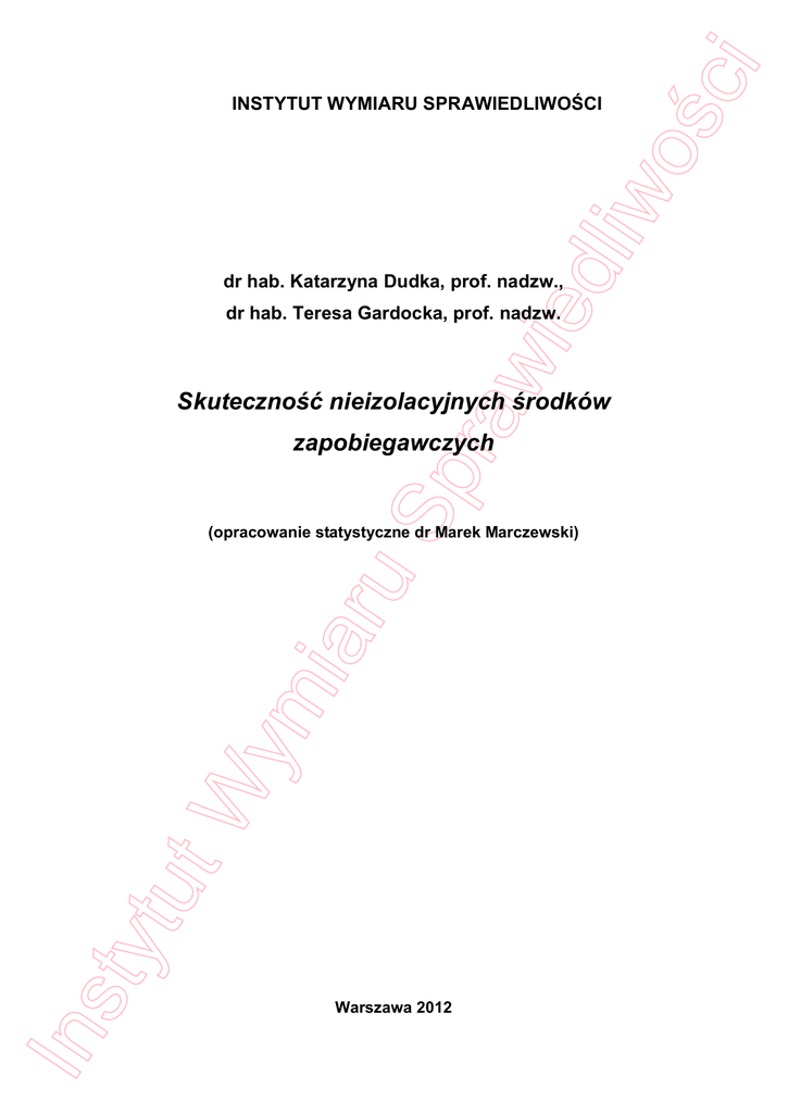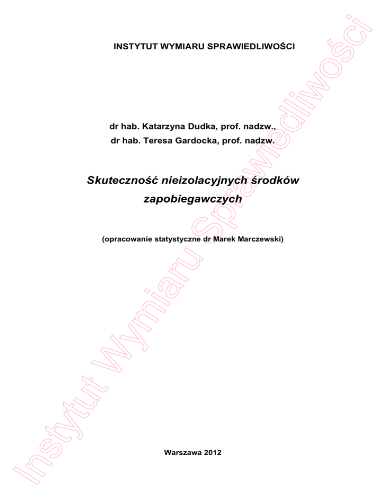 ied ci liw o INSTYTUT WYMIARU SPRAWIEDLIWO CI dr hab. Katarzyna Dudka, prof. nadzw., Skuteczno raw dr hab. Teresa Gardocka, prof. nadzw. nieizolacyjnych rodków Sp zapobiegawczych Ins tyt ut W ym i aru (opracowanie statystyczne dr Marek Marczewski) Warszawa 2012 Ins tyt ym i ut W aru ied raw Sp liw o ci ci Spis tre ci liw o 1. Zagadnienia wst pne .......................................................................................... 1 2. Dobór próby ...................................................................................................... 13 4. Uchylenie warunkowego dozoru Policji i ied 3. Stosowanie rodków zapobiegawczych z art. 275 § 3 k.p.k. i art. 275a k.p.k. .. 30 nakazu opuszczenia lokalu zajmowanego wspólnie z pokrzywdzonym............................................................ 45 raw 5. Warunkowy dozór Policji ................................................................................... 51 6. Nakaz opuszczenia lokalu zajmowanego wspólnie z pokrzywdzonym ............. 54 Sp 7. Podsumowanie.................................................................................................. 57 Ins tyt ut W ym i aru 8. Wybrane stany faktyczne: ................................................................................. 60 Ins tyt ym i ut W aru ied raw Sp liw o ci ci liw o 1. Zagadnienia wst pne Warunkowy dozór Policji (art. 275 § 3 k.p.k.) oraz nakaz opuszczenia lokalu zajmowanego wspólnie z pokrzywdzonym uzupe niaj Kodeksu post powania karnego katalog zawarty w rozdziale 28 rodków zapobiegawczych stosowanych ied w procesie karnym. W polskim systemie prawnym instytucja warunkowego dozoru Policji istnia a ju od raw 2005 r., uregulowana w art. 14 ustawy o przeciwdzia aniu przemocy w rodzinie.1 Celem tej ustawy by o zwi kszenie skuteczno ci przeciwdzia ania przemocy w rodzinie, inicjowanie i wspieranie dzia polegaj cych na podnoszeniu wiadomo ci spo ecznej w zakresie przyczyn i skutków takiej przemocy. Ustawa w rodzinie, jak i stosuj cych przemoc. Sp okre la a zasady post powania zarówno wobec osób dotkni tych przemoc Art. 14 ust. 1 u.przem.rodz. pozwala na zastosowanie wobec oskar onego o przest pstwo pope nione z u yciem przemocy lub gro by bezprawnej wobec aru cz onka rodziny, rodka zapobiegawczego w postaci dozoru Policji, pod warunkiem, e oskar ony opu ci lokal zajmowany wspólnie z pokrzywdzonym i ustali miejsce pobytu. Dozór ten nie ró ni si od dozoru Policji uregulowanego w art. 275 k.p.k., ym i stanowi c swoiste superfluum ustawowe, za umiejscowienie tego rodka w ustawie o przeciwdzia aniu przemocy w rodzinie, zamiast w Kodeksie post powania karnego, zaburza o spójno systemu prawa karnego procesowego, co w przypadku rodków przymusu ingeruj cych w prawa i swobody obywatelskie ma szczególne znaczenie. dozoru warunkowego uregulowanego w ustawie o przeciwdzia aniu ut W Specyfik przemocy w rodzinie by o przede wszystkim to, e móg on zosta zastosowany wy cznie w stosunku do sprawcy przest pstwa pope nionego z u yciem przemocy lub gro by bezprawnej, którego pokrzywdzonym by cz onek rodziny i tylko wtedy, gdy w konkretnej sprawie istnia y przes anki do zastosowania tymczasowego Ins tyt aresztowania. Nale y podkre li , e opuszczenie lokalu zamieszkiwanego wspólnie z pokrzywdzonym nie nale 1 o do obowi zków na onych na oskar onego ustawa z dnia 29 lipca 2005 r. o przeciwdzia aniu przemocy w rodzinie, Dz. U. z 2005 r. Nr 180, poz. 1493, dalej powo ywana jako u.przem.rodz., wesz a w ycie w dniu 29 wrze nia 2005 r. ci w ramach dozoru wskazanego w art. 14 ust. 1 u.przem.rodz., lecz by o warunkiem powstrzymywaniu si one w ramach dozoru, mog y polega na liw o zastosowania tego rodka. Obowi zki na od kontaktu z pokrzywdzonym w okre lony sposób, nie wyklucza o to przy tym mo liwo ci na enia na oskar onego obowi zków, o których mowa w art. 275 § 2 k.p.k. ied Zarówno w post powaniu przygotowawczym jak i s dowym decyzj o warunkowym dozorze Policji podejmowa S d, co zapewne (brak uzasadnienia projektu w tym zakresie) wynika o z faktu, e mo na by o ten rodek zastosowa wy cznie raw w przypadku zaistnienia przes anek tymczasowego aresztowania. Je li si przy tym uwzgl dni fakt, e rodek, o którym mowa, stanowi ingerencj w prawo cz owieka do prywatno ci, a w szczególno ci w prawo do domu2, regulacja taka staje si zrozumia a, cho niekoniecznie s uszna. Sp Warunkowy dozór Policji zosta wprowadzony do Kodeksu post powania karnego ustaw z dnia 5 listopada 2009 r. o zmianie ustawy - Kodeks karny, ustawy - Kodeks post powania karnego, ustawy - Kodeks karny wykonawczy, ustawy - Kodeks karny zapobiegawczych spójno . aru skarbowy oraz niektórych innych ustaw3, przez co przywrócono systemowi rodków Zgodnie z art. 275 § 3 k.p.k. je li zachodz przes anki tymczasowego aresztowania wobec oskar onego o przest pstwo pope nione z u yciem przemocy lub gro by ym i bezprawnej na szkod osoby najbli szej albo innej osoby zamieszkuj cej wspólnie ze sprawc , zamiast tymczasowego aresztowania mo na zastosowa dozór, pod warunkiem, e oskar ony w wyznaczonym terminie opu ci lokal zajmowany wspólnie ut W z pokrzywdzonym oraz okre li miejsce swojego pobytu. Zastosowanie dozoru warunkowego jest uzale nione od spe nienia ogólnych i szczególnych przes anek tymczasowego aresztowania. Art. 249 § 1 k.p.k. przewiduje dwie przes anki ogólne wyznaczaj cel ich stosowania. Nale rodków zapobiegawczych, które jednocze nie do nich: Ins tyt - zabezpieczenia prawid owego toku post powania, oraz niekiedy - zapobie enie pope nieniu przez oskar onego nowego, ci 2 Zob. Decyzja Cypr v. Turcja, 4.10.1983, skarga nr 8007/77, DR 72/5. 3 Dz. U. z 2009, nr 206, poz. 1589. 2 kiego przest pstwa. prawid owego toku post powania jest ci Zabezpieczenie podstawowym liw o i zasadniczym celem stosowania rodków zapobiegawczych. W doktrynie podnosi si , e pod poj ciem tym nale y rozumie stworzenie warunków, które umo liwi prowadzenie procesu karnego bez przeszkód oraz osi gni cie celów post pow