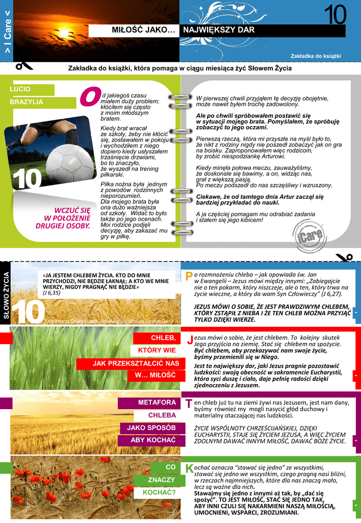 > I Care < 10 MIŁOŚĆ JAKO… NAJWIĘKSZY DAR Zakładka do książki Zakładka do książki, która pomaga w ciągu miesiąca żyć Słowem Życia O LUCIO BRAZYLIA W pierwszej chwili przyjąłem tę decyzję obojętnie, może nawet byłem trochę zadowolony. Kiedy brat wracał ze szkoły, żeby nie kłócić się, zostawałem w pokoju i wychodziłem z niego dopiero kiedy usłyszałem trzaśnięcie drzwiami, bo to znaczyło, że wyszedł na trening piłkarski. 10 WCZUĆ SIĘ W POŁOŻENIE DRUGIEJ OSOBY. SŁOWO ŻYCIA d jakiegoś czasu miałem duży problem; kłóciłem się często z moim młodszym bratem. Piłka nożna była jednym z powodów rodzinnych nieporozumień. Dla mojego brata była ona dużo ważniejsza od szkoły. Widać to było także po jego ocenach. Moi rodzice podjęli decyzję, aby zakazać mu gry w piłkę. «JA JESTEM CHLEBEM ŻYCIA. KTO DO MNIE PRZYCHODZI, NIE BĘDZIE ŁAKNĄŁ; A KTO WE MNIE WIERZY, NIGDY PRAGNĄĆ NIE BĘDZIE» (J 6,35) 10 Z komentarza Chiary Lubich - Adaptacja pod redakcją Centrum Gen 3 CHLEB, KTÓRY WIE JAK PRZEKSZTAŁCIĆ NAS W… MIŁOŚĆ METAFORA CHLEBA JAKO SPOSÓB ABY KOCHAĆ CO ZNACZY KOCHAĆ? Ale po chwili spróbowałem postawić się w sytuacji mojego brata. Pomyślałem, że spróbuję zobaczyć to jego oczami. Pierwszą rzeczą, która mi przyszła na myśl było to, że nikt z rodziny nigdy nie poszedł zobaczyć jak on gra na boisku. Zaproponowałem więc rodzicom, by zrobić niespodziankę Arturowi. Kiedy minęła połowa meczu, zauważyliśmy, że doskonale się bawimy, a on, widząc nas, grał z większą pasją. Po meczu podszedł do nas szczęśliwy i wzruszony. Ciekawe, że od tamtego dnia Artur zaczął się bardziej przykładać do nauki. A ja częściej pomagam mu odrabiać zadania i stałem się jego kibicem! chleba – jak opowiada św. Jan P owrozmnożeniu Ewangelii – Jezus mówi między innymi: „Zabiegajcie nie o ten pokarm, który niszczeje, ale o ten, który trwa na życie wieczne, a który da wam Syn Człowieczy” (J 6,27). JEZUS MÓWI O SOBIE, ŻE JEST PRAWDZIWYM CHLEBEM, KTÓRY ZSTĄPIŁ Z NIEBA I ŻE TEN CHLEB MOŻNA PRZYJĄĆ TYLKO DZIĘKI WIERZE. mówi o sobie, że jest chlebem. To kolejny skutek Jezus Jego przyjścia na ziemię. Stać się chlebem na spożycie. Być chlebem, aby przekazywać nam swoje życie, byśmy przemienili się w Niego. Jest to największy dar, jaki Jezus pragnie pozostawić ludzkości: swoją obecność w sakramencie Eucharystii, która syci duszę i ciało, daje pełnię radości dzięki zjednoczeniu z Jezusem. - chleb już tu na ziemi żywi nas Jezusem, jest nam dany, T en byśmy również my mogli nasycić głód duchowy i materialny otaczającej nas ludzkości. ŻYCIE WSPÓLNOTY CHRZEŚCIJAŃSKIEJ, DZIĘKI EUCHARYSTII, STAJE SIĘ ŻYCIEM JEZUSA, A WIĘC ŻYCIEM ZDOLNYM DAWAĆ INNYM MIŁOŚĆ, DAWAĆ BOŻE ŻYCIE. - oznacza “stawać się jedno” ze wszystkimi, Kochać stawać się jedno we wszystkim, czego pragną nasi bliźni, w rzeczach najmniejszych, które dla nas znaczą mało, lecz są ważne dla nich. Stawajmy się jedno z innymi aż tak, by „dać się spożyć”. TO JEST MIŁOŚĆ, STAĆ SIĘ JEDNO TAK, ABY INNI CZULI SIĘ NAKARMIENI NASZĄ MIŁOŚCIĄ, UMOCNIENI, WSPARCI, ZROZUMIANI. -