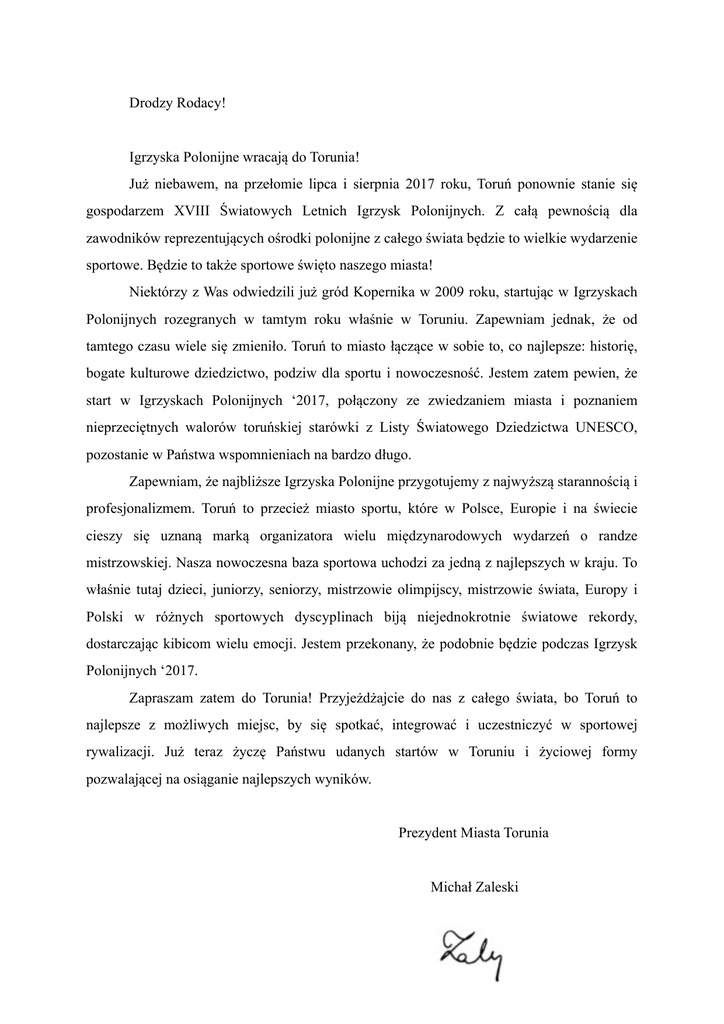! ! Drodzy Rodacy! ! Igrzyska Polonijne wracają do Torunia! Już niebawem, na przełomie lipca i sierpnia 2017 roku, Toruń ponownie stanie się gospodarzem XVIII Światowych Letnich Igrzysk Polonijnych. Z całą pewnością dla zawodników reprezentujących ośrodki polonijne z całego świata będzie to wielkie wydarzenie sportowe. Będzie to także sportowe święto naszego miasta! Niektórzy z Was odwiedzili już gród Kopernika w 2009 roku, startując w Igrzyskach Polonijnych rozegranych w tamtym roku właśnie w Toruniu. Zapewniam jednak, że od tamtego czasu wiele się zmieniło. Toruń to miasto łączące w sobie to, co najlepsze: historię, bogate kulturowe dziedzictwo, podziw dla sportu i nowoczesność. Jestem zatem pewien, że start w Igrzyskach Polonijnych ‘2017, połączony ze zwiedzaniem miasta i poznaniem nieprzeciętnych walorów toruńskiej starówki z Listy Światowego Dziedzictwa UNESCO, pozostanie w Państwa wspomnieniach na bardzo długo. Zapewniam, że najbliższe Igrzyska Polonijne przygotujemy z najwyższą starannością i profesjonalizmem. Toruń to przecież miasto sportu, które w Polsce, Europie i na świecie cieszy się uznaną marką organizatora wielu międzynarodowych wydarzeń o randze mistrzowskiej. Nasza nowoczesna baza sportowa uchodzi za jedną z najlepszych w kraju. To właśnie tutaj dzieci, juniorzy, seniorzy, mistrzowie olimpijscy, mistrzowie świata, Europy i Polski w różnych sportowych dyscyplinach biją niejednokrotnie światowe rekordy, dostarczając kibicom wielu emocji. Jestem przekonany, że podobnie będzie podczas Igrzysk Polonijnych ‘2017. Zapraszam zatem do Torunia! Przyjeżdżajcie do nas z całego świata, bo Toruń to najlepsze z możliwych miejsc, by się spotkać, integrować i uczestniczyć w sportowej rywalizacji. Już teraz życzę Państwu udanych startów w Toruniu i życiowej formy pozwalającej na osiąganie najlepszych wyników. ! Prezydent Miasta Torunia ! Michał Zaleski