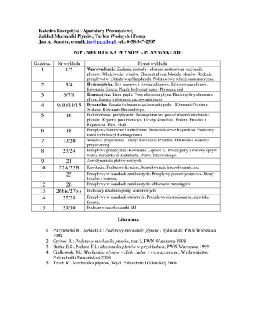 Katedra Energetyki i Aparatury Przemysłowej Zakład Mechaniki Płynów, Turbin Wodnych i Pomp Jan A. Szantyr, e-mail; [email protected], tel.: 0-58-347-2507 ZiIP - MECHANIKA PŁYNÓW – PLAN WYKŁADU Godzina. Nr wykładu Temat wykładu 1 1/2 2 3/4 3 6/7/8 4 9/10/11/15 5 16 6 18 7 19/20 8 23/24 9 10 11 21 22A/22B 25 Wprowadzenie: Zadania, metody i obszary zastosowań mechaniki płynów. Właściwości płynów. Element płynu. Modele płynów. Rodzaje przepływów. Układy współrzędnych. Podstawowe relacje matematyczne. Hydrostatyka: Siły masowe i powierzchniowe. Równowaga płynów. Równanie Eulera. Napór hydrostatyczny. Pływanie ciał Kinematyka: Linie prądu. Tory elementu płynu. Ruch ogólny elementu płynu. Zasada i równanie zachowania masy Dynamika: Zasada i równanie zachowania pędu . Równanie NavieraStokesa. Równanie Bernoulliego. Podobieństwo przepływów: Bezwymiarowa postać równań mechaniki płynów Kryteria podobieństwa. Liczby Strouhala, Eulera, Froudea i Reynoldsa. Efekt skali. Przepływy laminarne i turbulentne. Doświadczenie Reynoldsa. Podstawy teorii turbulencji Kołmogorowa. Warstwy przyścienne i ślady: Równania Prandtla. Oderwanie warstwy przyściennej. Przepływy potencjalne: Równanie Laplace’a.. Potencjalny i wirowy opływ walca. Paradoks d’Alemberta. Prawo Żukowskiego. Aerodynamika płatów nośnych. 12 13 14 26 26bis/27bis 27/28 15 29/30 Kawitacja. Podstawy fizyczne, konsekwencje hydrodynamiczne. Przepływy w kanałach zamkniętych: Przepływy jednowymiarowe. Straty lokalne i liniowe. Przepływy w kanałach zamkniętych: obliczanie rurociągów Podstawy działania pomp wirnikowych Przepływy w kanałach otwartych. Przepływy niestacjonarne, zjawiska falowe. Podstawy gazodynamiki I/II Literatura 1. Puzyrewski R., Sawicki J.: Podstawy mechaniki płynów i hydrauliki, PWN Warszawa 1998 2. Gryboś R.: Podstawy mechaniki płynów, tom I, PWN Warszawa 1998 3. Burka E.S., Nałęcz T.J.: Mechanika płynów w przykładach, PWN Warszawa 1999 4. Ciałkowski M.: Mechanika płynów – zbiór zadań z rozwiązaniami, Wydawnictwo Politechniki Poznańskiej 2008 5. Tesch K.: Mechanika płynów, Wyd. Politechniki Gdańskiej 2008