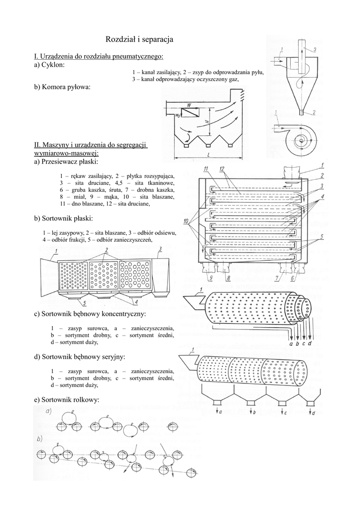 Rozdział i separacja I. Urządzenia do rozdziału pneumatycznego: a) Cyklon: 1 – kanał zasilający, 2 – zsyp do odprowadzania pyłu, 3 – kanał odprowadzający oczyszczony gaz, b) Komora pyłowa: II. Maszyny i urządzenia do segregacji wymiarowo-masowej: a) Przesiewacz płaski: 1 – rękaw zasilający, 2 – płytka rozsypująca, 3 – sita druciane, 4,5 – sita tkaninowe, 6 – gruba kaszka, śruta, 7 – drobna kaszka, 8 – miał, 9 – mąka, 10 – sita blaszane, 11 – dno blaszane, 12 – sita druciane, b) Sortownik płaski: 1 – lej zasypowy, 2 – sita blaszane, 3 – odbiór odsiewu, 4 – odbiór frakcji, 5 – odbiór zanieczyszczeń, c) Sortownik bębnowy koncentryczny: 1 – zasyp surowca, a – zanieczyszczenia, b – sortyment drobny, c – sortyment średni, d – sortyment duży, d) Sortownik bębnowy seryjny: 1 – zasyp surowca, a – zanieczyszczenia, b – sortyment drobny, c – sortyment średni, d – sortyment duży, e) Sortownik rolkowy: f) Wibrograder: 1 – wlot mieszaniny cząstek, 2 – produkt lekki, 3 – produkt mieszany, 4 – produkt ciężki, 5 – wibromotor, 6 – płaszczyzna robocza, g) Koncentrator: 1 – wlot ziarna, 2 – sito do wydzielania frakcji drobnej, 3 – sito do rozdzielania na frakcję dużą i mieszaną, 4 – zastawki regulacyjne powietrza, 5 – wylot powietrza, 6 – wylot frakcji lekkiej ziarna, 7 – wylot frakcji ciężkiej ziarna, 8 – wylot frakcji mieszanej ziarna, 9 – wylot zanieczyszczeń, 11 – wibromotor, III. Filtry: a) Filtr płytowy: 1 – odprowadzenie wody myjącej z osadem, 2 – doprowadzenie zawiesiny, 3 – odprowadzenie filtratu, 4 – manometr do pomiaru ciśnienia w zbiorniku, 5 – manometr do pomiaru ciśnienia filtratu, 6 – elementy filtrujące, 7 – wózek na osad, b) Filtr tarczowy: 1 – zbiornik na zawiesinę tworzącą warstwę filtrującą, 2 – pompa dozująca ziemię okrzemkową, 3 – pompa zasilająca, 4 – silnik napędzający mieszadło i elementy filtracyjne podczas ich czyszczenia, zbiornik z zawiesiną ziemi okrzemkowej, c) Filtr bębnowy: 1 – zasilanie, 2 – mieszadło, 3 – filtr, 4 – odprowadzenie filtratu, 5 – skrobak, 6 – osad, 7 – zasysane powietrze, IV. Prasy: a) Prasa koszowa: 1 – doprowadzenie miazgi, 2 – płyta oporowa, 3 – kolektor soku, 4 – konstrukcja nośna, 5 – kosz, 6 – system wzdłużnego ruchu kosza, 7 – napęd, 8 – doprowadzenie ciśnienia, 9 – tłok, 10 – przenośnik ślimakowy wytłoków, 11 – uszczelka, 12 – odprowadzenie soku, węże drenażowe, b) Prasa pneumatyczna: 1 – perforowany stalowy bęben, 2 – otwór do załadunku, 3 – gumowy cylinder, 4 – doprowadzenie sprężonego powietrza, 5 – odbiór soku, 6 – zbiornik na wytłoki, 7 – przenośnik slimakowy, c) Prasa ślimakowa (śrubowa) pionowa – wyżymaczka: 1 – napęd, 2 – zasyp wysłodków, 3 – ślimak, 4 – sito, 5 – występy oporowe, 6 – odprowadzenie zawiesiny wysłodkowej, 7 – wysyp wysłodków wyżętych, d) Prasa taśmowa: 1 – doprowadzenie miazgi, 2 – taśma górna lita, 3 – odbiór wytłoków, taśma dolna perforowana, 5 – odbiór soku, 6 – regulacja stopnia zgniotu, V. Przecieraczki: a) Przecieraczka łapowa: 1 – zasyp surowca, 2 – obudowa, 3 – sito, 4 – listwy, 5 – odprowadzenie młóta, 6 – odbiór przecieru VI. Wirówki: a) Wirówka filtracyjna wisząca: 1 – pokrywa, 2 – doprowadzenie zawiesiny, 3 – wrzeciono, 4 – doprowadzenie wody, 5 – doprowadzenie pary wodnej, 6 – osłona, 7 – zbiornik filtratu, 8 – odprowadzenie osadu, 9 – grzybek stożkowy, 10 – talerz rozprowadzający, b) Wirówka sedymentacyjna oddzielcza 1 – bęben zewnętrzny, 2 – bęben wewnętrzny, 3 – odprowadzenie osadu, 4 – doprowadzenie zawiesiny, 5 – odprowadzenie cieczy, c) Wirówka sedymentacyjna talerzowa: 1 – doprowadzenie zawiesiny, 2 – odprowadzenie cieczy, 3 – zamknięcie bębna, 4 – stos talerzy, 5 – osad, d) Wirówka sedymentacyjna samooczyszczająca się: 1 – odprowadzenie cieczy, 2 – doprowadzenie zawiesiny, 3 – kanał zbiorczy cieczy, 4 – talerze, 5 – dysze odprowadzające osad, e) Wirówka separacyjna: 1 – doprowadzenie emulsji, 2 – talerze, 3 – odprowadzenie cieczy cięższej, 4 – odprowadzenie cieczy lżejszej,