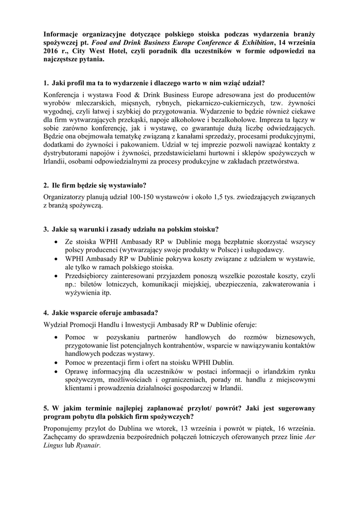 Informacje organizacyjne dotyczące polskiego stoiska podczas wydarzenia branży spożywczej pt. Food and Drink Business Europe Conference & Exhibition, 14 września 2016 r., City West Hotel, czyli poradnik dla uczestników w formie odpowiedzi na najczęstsze pytania. 1. Jaki profil ma ta to wydarzenie i dlaczego warto w nim wziąć udział? Konferencja i wystawa Food & Drink Business Europe adresowana jest do producentów wyrobów mleczarskich, mięsnych, rybnych, piekarniczo-cukierniczych, tzw. żywności wygodnej, czyli łatwej i szybkiej do przygotowania. Wydarzenie to będzie również ciekawe dla firm wytwarzających przekąski, napoje alkoholowe i bezalkoholowe. Impreza ta łączy w sobie zarówno konferencję, jak i wystawę, co gwarantuje dużą liczbę odwiedzających. Będzie ona obejmowała tematykę związaną z kanałami sprzedaży, procesami produkcyjnymi, dodatkami do żywności i pakowaniem. Udział w tej imprezie pozwoli nawiązać kontakty z dystrybutorami napojów i żywności, przedstawicielami hurtowni i sklepów spożywczych w Irlandii, osobami odpowiedzialnymi za procesy produkcyjne w zakładach przetwórstwa. 2. Ile firm będzie się wystawiało? Organizatorzy planują udział 100-150 wystawców i około 1,5 tys. zwiedzających związanych z branżą spożywczą. 3. Jakie są warunki i zasady udziału na polskim stoisku? Ze stoiska WPHI Ambasady RP w Dublinie mogą bezpłatnie skorzystać wszyscy polscy producenci (wytwarzający swoje produkty w Polsce) i usługodawcy. WPHI Ambasady RP w Dublinie pokrywa koszty związane z udziałem w wystawie, ale tylko w ramach polskiego stoiska. Przedsiębiorcy zainteresowani przyjazdem ponoszą wszelkie pozostałe koszty, czyli np.: biletów lotniczych, komunikacji miejskiej, ubezpieczenia, zakwaterowania i wyżywienia itp. 4. Jakie wsparcie oferuje ambasada? Wydział Promocji Handlu i Inwestycji Ambasady RP w Dublinie oferuje: Pomoc w pozyskaniu partnerów handlowych do rozmów biznesowych, przygotowanie list potencjalnych kontrahentów, wsparcie w nawiązywaniu kontaktów handlowych podczas wystawy. Pomoc w prezentacji firm i ofert na stoisku WPHI Dublin. Oprawę informacyjną dla uczestników w postaci informacji o irlandzkim rynku spożywczym, możliwościach i ograniczeniach, porady nt. handlu z miejscowymi klientami i prowadzenia działalności gospodarczej w Irlandii. 5. W jakim terminie najlepiej zaplanować przylot/ powrót? Jaki jest sugerowany program pobytu dla polskich firm spożywczych? Proponujemy przylot do Dublina we wtorek, 13 września i powrót w piątek, 16 września. Zachęcamy do sprawdzenia bezpośrednich połączeń lotniczych oferowanych przez linie Aer Lingus lub Ryanair. Sugerowany program: 14 września br. miejsce: hotel Citywest, Saggart link do Google Maps: https://goo.gl/maps/1g1kK2P5dgv godz. 9.00 – 17.00 udział w konferencji i wystawie Food & Drink, prezentacje ofert i nawiązywanie kontaktów handlowych 15 września br. miejsce: Dublin Chamber of Commerce: 7 Clare St, Dublin 2, link do Google Maps: https://goo.gl/maps/a1UtjdF39Xs godz. 8.00 – 10.00 udział w briefingu nt. irlandzkiego rynku spożywczego, możliwości i bariery w rozwoju sprzedaży w tym kraju godz. 10.00 – 12.00 spotkania B2B z firmami irlandzkimi (o ile firmy irlandzkie potwierdzą udział) 6. Gdzie odbywa się wydarzenie Food and Drink Business Europe? Wystawa odbywa się w centrum hotelowo-konferencyjnym City West, które położone jest na obrzeżach Dublina. Adres: Citywest Hotel, Conference & Event Centre, Saggart, D24 V0NV. Link do Google Maps: https://goo.gl/maps/1g1kK2P5dgv 7. Czy można prosić o jakieś sugestie odnośnie zakwaterowania w Dublinie? Ceny hoteli w Dublinie są zróżnicowane, jednak przyzwoity standard dostępny jest w ramach normy delegacyjnej. Warto rozważyć nocleg w hotelu Citywest, w którym odbywa się wystawa. Jest on stosunkowo niedrogi jak na Irlandię. Należy jednak mieć na uwadze, że z lotniska w godzinach nocnych trzeba będzie dojechać tu takówką. Położenie hotelu na obrzeżach miasta oznaczać będzie również kłopotliwe dojazdy do centrum. Należy pamiętać, że wydarzenie zaplanowane na 15 września o godz. 8.00 – briefing nt. sektora spożywczego odbywa się w centrum Dublina. Citywest: rezerwacja tel. +353 1 401 0500, email: [email protected]. Więcej ofert noclegowych można znaleźć na portalach internetowych typu www.trivago.ie lub www.booking.com. Jeśli jednak ktoś wolałby zatrzymać się bliżej centrum to pod względem łatwości dojazdu z lotniska i na wystawę sugerujemy wybór hotelu znajdującego się niedaleko rzeki Liffey. W te okolice bez problemu można dojechać z lotniska nawet w godzinach nocnych. Po północnej stronie rzeki biegnie linia tramwajowa – Luas, która prowadzi na wystawę (kierunek Saggart). 8. Jak dojechać z lotniska do hotelu? Jak działa komunikacja miejska? Z lotniska do hotelu Citywest najłatwiej będzie dostać się taksówką. Osoby, które zdecydowały się na zakwaterowanie w centrum mogą skorzystać z autokarów firmy Air Coach (błękitne autobusy). Przystanek znajduje się tuż przy wyjściu z lotniska. Bilet można zakupić w kasie przy przystanku lub u kierowcy. Cena biletu w jedną stronę to około 10 EUR. Bilet powrotny będzie trochę tańszy. Generalnie komunikacja miejska w Dublinie funkcjonuje trochę odmiennie niż w Polsce. Na przystankach trudno znaleźć rozkłady jazdy i dokładną trasę autobusów. W centrum są za to elektroniczne wyświetlacze podające przybliżony czas oczekiwania. Osoby, które będą chciały korzystać z komunikacji miejskiej w Dublinie mogą kupić kartę Leap Card, która pozwala na podróżowanie wszelkimi środkami transportu – autobusem, tramwajem (Luas) i kolejką podmiejską (Dart). Leap Card nie obowiązuje jednak na prywatnych liniach np. wycieczkowych. Kartę można kupić w wielu kioskach, ale też przez internet. Więcej na ten temat można znaleźć na str