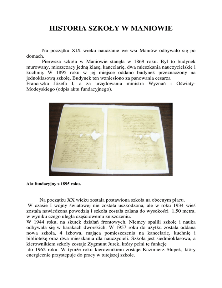 HISTORIA SZKOŁY W MANIOWIE Na początku XIX wieku nauczanie we wsi Maniów odbywało się po domach. Pierwsza szkoła w Maniowie stanęła w 1869 roku. Był to budynek murowany, mieszczący jedną klasę, kancelarię, dwa mieszkania nauczycielskie i kuchnię. W 1895 roku w jej miejsce oddano budynek przeznaczony na jednoklasową szkołę. Budynek ten wzniesiono za panowania cesarza Franciszka Józefa I, a za urzędowania ministra Wyznań i OświatyModeyskiego (odpis aktu fundacyjnego). Akt fundacyjny z 1895 roku. Na początku XX wieku została postawiona szkoła na obecnym placu. W czasie I wojny światowej nie została uszkodzona, ale w roku 1934 wieś została nawiedzona powodzią i szkoła została zalana do wysokości 1,50 metra, w wyniku czego uległa częściowemu zniszczeniu. W 1944 roku, na skutek działań frontowych, Niemcy spalili szkołę i nauka odbywała się w barakach dworskich. W 1957 roku do użytku została oddana nowa szkoła, 4 izbowa, mająca pomieszczenia na kancelarię, kuchnię i bibliotekę oraz dwa mieszkania dla nauczycieli. Szkoła jest siedmioklasowa, a kierownikiem szkoły zostaje Zygmunt Jurek, który pełni tę funkcję do 1962 roku. W tymże roku kierownikiem zostaje Kazimierz Słupek, który energicznie przystępuje do pracy w tutejszej szkole. W roku 1967/68 uczniowie realizują program szkoły ośmioklasowej. Po jedenastu latach pracy odchodzi dyr. Słupek, a jego obowiązki przejmuje pani Helena Gumuła. W latach 1975/76 szkoła przeżywa kryzys personalny, wobec czego klasy VII i VIII zostają przeniesione do Szkoły Podstawowej w Borkach, przyspieszając tym planowane utworzenie szkoły zbiorczej. Od tego czasu szkoła w Maniowie była sześcioklasowa. 4 lipca 1977 roku rozpoczęło pracę Państwowe Przedszkole w Maniowie. Szkoła oddała do jego dyspozycji 2 sale, kuchnię oraz piwnicę. Instytucją tą kieruje pani Elżbieta Litwin, późniejsza dyrektor przedszkola w Borkach. W roku 1985/ 86 na stanowisko dyrektora szkoły zostaje powołana pani Mieczysława Warzecha, która przenosi się z Borek. Szkoła jest nadal sześcioklasowa,w roku 1995 jest natomiast siedmioklasowa, a od 1996 istnieje klasa VIII. W latach 1997/98 dzięki władzom Gminnym, Oświatowym i sponsorowi, panu A. Wójcickiemu wykonany został generalny remont wewnątrz i na zewnątrz budynku, dzięki czemu uczniowie uczą się w bardzo dobrych warunkach. W 2001 roku w wyniku reformy oświaty nastąpiła reorganizacja i szkoła została przekształcona w Zespół Szkolno Przedszkolny z klasami I-III. Od 2005 roku dyrektorem szkoły zostaje pani Grażyna Glica i pełni tę funkcję do dnia dzisiejszego. Obecnie szkoła liczy 65 uczniów. Do grona nauczycielskiego należą: p. Grażyna Glica, p. Marta Dubajka, p. Lucyna Bełzowska, p. Elżbieta Starzec, p. Elżbieta Ryś, ks. Grzegorz Krakowski i p. Anna Zięba. Pracownicy obsługi: p. Władysława Duda, p. Ewa Duda, p. Małgorzata Duda, p. Marian Włodarczyk. Przedszkole liczy 25 dzieci, opiekunem jest p. Urszula Kupiec. Szkoła dysponuje jasnymi salami, pracownią komputerową z dostępem do Internetu i biblioteką. Uczniowie, którzy chcą aktywnie spędzić czas, mają do dyspozycji bogatą ofertę zajęć pozalekcyjnych, na które pozyskano fundusze w ramach programów: Integracji Społecznej, finansowanego ze środków PPWOW; Rządowego programu wyrównywania szans edukacyjnych dzieci i młodzieży w 2008 roku, zagospodarowanie czasu wolnego dzieci i młodzieży pod nazwą „Już pływam” i w ramach realizacji programu profilaktycznego. Są nimi: wyjazdy na basen, zajęcia profilaktyczne, artystyczne, taneczne i informatyczne. Szkoła na bieżąco realizuje ogólnoszkolne projekty edukacyjne, których celem jest integracja środowiska szkolnego i rodzicielskiego oraz promocja szkoły w środowisku lokalnym, m.in. Dzień Babci i Dziadka, Święto Rodziny, Dni Szczucina, itp. Oferta edukacyjna szkoły, realizowane projekty edukacyjne mają odzwierciedlenie w sukcesach naszych uczniów. Są to zarówno sukcesy w konkursach przedmiotowych, artystycznych jak i sportowych. Osiągane wyniki są efektem starannej pracy nauczycieli, którzy zawsze są życzliwi, służą radą i pomocą wszystkim uczniom w szkole. barak szkolny z 1955 roku szkoła dziś