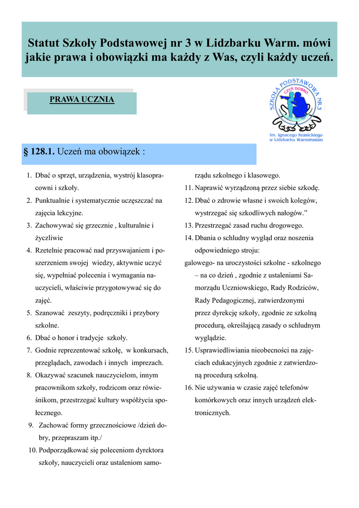Statut Szkoły Podstawowej nr 3 w Lidzbarku Warm. mówi jakie prawa i obowiązki ma każdy z Was, czyli każdy uczeń. PRAWA UCZNIA § 128.1. Uczeń ma obowiązek : 1. Dbać o sprzęt, urządzenia, wystrój klasopracowni i szkoły. 2. Punktualnie i systematycznie uczęszczać na zajęcia lekcyjne. 3. Zachowywać się grzecznie , kulturalnie i życzliwie 4. Rzetelnie pracować nad przyswajaniem i poszerzeniem swojej wiedzy, aktywnie uczyć rządu szkolnego i klasowego. 11. Naprawić wyrządzoną przez siebie szkodę. 12. Dbać o zdrowie własne i swoich kolegów, wystrzegać się szkodliwych nałogów.” 13. Przestrzegać zasad ruchu drogowego. 14. Dbania o schludny wygląd oraz noszenia odpowiedniego stroju: galowego- na uroczystości szkolne - szkolnego się, wypełniać polecenia i wymagania na- – na co dzień , zgodnie z ustaleniami Sa- uczycieli, właściwie przygotowywać się do morządu Uczniowskiego, Rady Rodziców, zajęć. Rady Pedagogicznej, zatwierdzonymi 5. Szanować zeszyty, podręczniki i przybory szkolne. 6. Dbać o honor i tradycje szkoły. 7. Godnie reprezentować szkołę, w konkursach, przeglądach, zawodach i innych imprezach. 8. Okazywać szacunek nauczycielom, innym pracownikom szkoły, rodzicom oraz rówie- przez dyrekcję szkoły, zgodnie ze szkolną procedurą, określającą zasady o schludnym wyglądzie. 15. Usprawiedliwiania nieobecności na zajęciach edukacyjnych zgodnie z zatwierdzoną procedurą szkolną. 16. Nie używania w czasie zajęć telefonów śnikom, przestrzegać kultury współżycia spo- komórkowych oraz innych urządzeń elek- łecznego. tronicznych. 9. Zachować formy grzecznościowe /dzień dobry, przepraszam itp./ 10. Podporządkować się poleceniom dyrektora szkoły, nauczycieli oraz ustaleniom samo- § 129.1. Uczeń ma prawo: 1. 2. Występować z inicjatywami dotyczącymi pracy szkoły. Wyrażać swoje wątpliwości, sądy, przekonania, poglądy na temat trudności nauczania, życia szkoły i klasy. 3. Uczestniczyć w zajęciach pozalekcyjnych organizowanych przez szkołę. 4. Uzyskać ocenę jawną , obiektywną i umotywowaną. 5. Zwolnienia od prac domowych na okres przerw świątecznych i ferii. 6. Uzyskania informacji o sprawdzianie pracy klasowej z wyprzedzeniem 7 dni. 7. Odmówienia sprawdzianu, jeżeli w tym dniu odbył się już jeden, a w ciągu tygodnia trzy. 8. Zwrotu prac pisemnych w terminie 14 dni i wglądu do tych prac razem z rodzicami. 9. Odwołać się od oceny okresowej lub rocznej z przedmiotów nauczania. Tryb odwołania określa WZO. 10. Odwołać się od zastosowania wobec niego kary w terminie 7 dni od dnia postanowienia o ukaraniu. 11. Wybierać, być wybieranym i pełnić funkcje w Samorządzie Uczniowskim ( szkolnym i klasowym) i organizacjach młodzieżowych. 12. Korzystać: z pomocy w nauce /pomoc koleżeńska, zespoły korekcyjno-wyrównawcze, Str. 2 z doraźnej pomocy materialnej / darmowe obiady, zapomogi, półkolonie) w sytuacjach szczególnie trudnych, opieki zdrowotnej i socjalnej / stomatolog, pielęgniarka, świetlica, ciepły posiłek/, ulg w przejazdach kolejowych. 13. Informacji na temat zakresu wymagań oraz metod nauczania. 14. Posiadać pełną wiedzę na temat kryteriów ocen z przedmiotów i z zachowania. 15. Korzystania ze wszystkich pomieszczeń i urządzeń zgodnie z ich przeznaczeniem i w myśl obowiązujących regulaminów. 16. Reprezentowania szkoły w konkursach, przeglądach i zawodach. 17. Poszanowania swej godności, podmiotowego traktowania w procesie dydaktyczno wychowawczym, nietykalności osobistej. 18. Uczeń posiada prawo do wolności wyznania i nauczania religii oraz kształtowania tożsamości narodowej. DRODZY UCZNIOWIE! Pamiętaj, że jesteś ofiarą przemocy także wtedy gdy: jesteś przezywany ktoś opowiada innym nieprawdziwe historie na Twój temat jesteś ośmieszany przez swoich kolegów i koleżanki ktoś niszczy lub zabiera Twoje rzeczy ktoś kradnie Twoje pieniądze w Internecie publikowane są obraźliwe informacje o Tobie dostajesz obraźliwe sms-y lub telefony nie chcesz iść do szkoły, bo boisz się spotkać swoich prześladowców Sprawcy najczęściej dobrze wiedzą, w jaki sposób mogą cię zranić. Gdy chcą Ci sprawić przykrość, złośliwie komentują: Twój wygląd: wagę, kolor włosów, sposób ubierania to, że dobrze się uczysz to, że uczysz się gorzej to, że nie masz pieniędzy Twoją popularność w szkole jeśli masz inną religię nosisz okulary lub aparat słuchowy masz wadę wymowy lub dysleksję Pamiętaj - niezależnie od tego, czego dotyczy prześladowanie i dokuczanie, to nie Twoja wina. Nikt nie ma prawa stosować przemocy wobec innych osób. Str. 3 Co możesz zrobić? Jeśli jesteś prześladowany, koniecznie po- moment, kiedy będziesz mógł powiedzieć mu wiedz o tym komuś. Możesz powiedzieć przyjacie- o tym tak, aby nikt się nie zorientował. Możesz lowi, nauczycielowi albo rodzicom. Pamiętaj, że np. zostać po lekcji prosząc o wyjaśnienie ja- prześladowanie samo się nie skończy, jeśli nikomu kiegoś tematu. Jeśli masz większe zaufanie do o tym nie powiesz. Nie jest to łatwe. Możesz się innego nauczyciela lub pracownika szkoły wstydzić lub obawiać, że zmartwisz tym rodziców (pedagog lub psycholog szkolny, pielęgniarka) lub sprawisz im kłopot. Jeśli nie chcesz sam opo- - porozmawiaj z wybraną przez Ciebie osobą. wiedzieć o problemie poproś np. kolegę, koleżankę, Masz prawo do tego, aby poczuć się bezpiecz- rodzeństwo, babcię lub dziadka, aby pomogli Ci nie. o wszystkim opowiedzieć rodzicom. Jeśli zamiast Możesz wybrać także inną dorosłą oso- mówić o problemie wolisz o tym napisać - przygo- bę, której ufasz np. lekarza. Osoba taka powin- tuj list do rodziców i opisz jak się czujesz. na znaleźć odpowiedni sposób, aby skontakto- Pamiętaj, że w szkole zawsze jest Twój wychowawca lub inny nauczyciel, który powinien wie- wać się ze szkołą i Twoimi rodzicami, by ci p