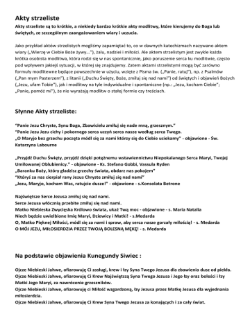 Akty strzeliste Akty strzeliste są to krótkie, a niekiedy bardzo krótkie akty modlitwy, które kierujemy do Boga lub świętych, ze szczególnym zaangażowaniem wiary i uczucia. Jako przykład aktów strzelistych mogliśmy zapamiętać to, co w dawnych katechizmach nazywano aktem wiary („Wierzę w Ciebie Boże żywy...”), żalu, nadziei i miłości. Ale aktem strzelistym jest zwykle każda krótka osobista modlitwa, która rodzi się w nas spontanicznie, jako poruszenie serca ku modlitwie, często pod wpływem jakiejś sytuacji, w której się znajdujemy. Zatem aktami strzelistymi mogą być zarówno formuły modlitewne będące powszechnie w użyciu, wzięte z Pisma św. („Panie, ratuj”), np. z Psalmów („Pan mym Pasterzem”), z litanii („Duchu Święty, Boże, zmiłuj się nad nami”) od świętych i objawień Bożych („Jezu, ufam Tobie”), jak i modlitwy na tyle indywidualne i spontaniczne (np.: „Jezu, kocham Ciebie”; „Panie, pomóż mi”), że nie wyrażają modlitw o stałej formie czy treściach. Słynne Akty strzeliste: “Panie Jezu Chryste, Synu Boga, Zbawicielu zmiłuj się nade mną, grzesznym.” “Panie Jezu Jezu cichy i pokornego serca uczyń serca nasze według serca Twego. „O Maryjo bez grzechu poczęta módl się za nami którzy się do Ciebie uciekamy” - objawione - Św. Katarzyna Labourne „Przyjdź Duchu Święty, przyjdź dzięki potężnemu wstawiennictwu Niepokalanego Serca Maryi, Twojej Umiłowanej Oblubienicy.” - objawione - Ks. Stefano Gobbi, Vassula Ryden „Baranku Boży, który gładzisz grzechy świata, obdarz nas pokojem” “Któryś za nas cierpiał rany Jezus Chryste zmiłuj się nad nami” „Jezu, Maryjo, kocham Was, ratujcie dusze!” - objawione - s.Konsolata Betrone Najświętsze Serce Jezusa zmiłuj się nad nami. Serce Jezusa włócznią przebite zmiłuj się nad nami. Matko Niebieska Zwycięska Królowo świata, ukaż Twą moc - objawione - s. Maria Natalia Niech będzie uwielbione Imię Maryi, Dziewicy i Matki! - s.Medarda O, Matko Pięknej Miłości, módl się za nami i spraw, aby serca nasze gorzały miłością! - s. Medarda O MÓJ JEZU, MIŁOSIERDZIA PRZEZ TWOJĄ BOLESNĄ MĘKĘ! - s. Medarda Na podstawie objawienia Kunegundy Siwiec : Ojcze Niebieski Jahwe, ofiarowuję Ci zasługi, krew i łzy Syna Twego Jezusa dla zbawienia dusz od piekła. Ojcze Niebieski Jahwe, ofiarowuję Ci Krew Najświętszą Syna Twego Jezusa i Jego łzy oraz boleści i łzy Matki Jego Maryi, za nawrócenie grzeszników. Ojcze Niebieski Jahwe, ofiarowuję ci Miłość wzgardzoną, łzy Jezusa przez Matkę Jezusa dla wyjednania miłosierdzia. Ojcze Niebieski Jahwe, ofiarowuję Ci Krew Syna Twego Jezusa za konających i za cały świat. Akty strzeliste Papieża Jana XXIII („Dziennik Duszy”) : - „O Maryjo najpokorniejsza, spraw bym się do ciebie upodobnił” - „O Jezu, O Maryjo, wiecie przecież, że was kocham” - „O mój Jezus miłosierdzia” - „Matko Niepokalana, dopomóż mi” - „Jezus zmiłuj się nade mną” - „Jezu, Maryjo, bądźcie mi zbawieniem !” - „O Pani moja zbaw mnie” - „Jezus, Maryjo, Józefie, kocham was, chcę dla was żyć, dla was cierpieć i dla was umrzeć” - „Boże bądź miłościw mnie grzesznemu” - „Serce Jezusa gorejące miłością ku nam, rozpal serca nasze miłością ku Tobie” - „O Jezu uczyń mnie godnym wielbienia Ciebie” - „O Jezu, nadzieją moją i ucieczką moją Ty jesteś” – Ps 30:4 - „O Jezu, o Maryjo, strzeżcie mnie bym się nigdy od was nie oddalił” - „O dobry Jezu, Ty wiesz, ty wiesz, że pragnę cię kochać” - „Daj mi tylko miłość ku tobie i łaskę swoją a dość będę bogaty i niczego więcej nie pragnę” - „Jezu cichy i serca pokornego uczyń serce moje według serca twego” - „O dobry Jezu, wspieraj mnie ! Maryjo, Maryjo okaż mi się Matką” - „Jezu nadziejo duszy stęsknionej, wspomnij na mnie” - „O Jezu, o Maryjo, niech tęskni i rozpływa się dusza moja” - „O dobra Matko, Mistrzyni pokory, spraw bym stał się podobnym do Ciebie” - „O Jezu spraw bym był pokorny” - „O Maryjo Panno najpobożniejsza daj umysłowi memu skupienie”