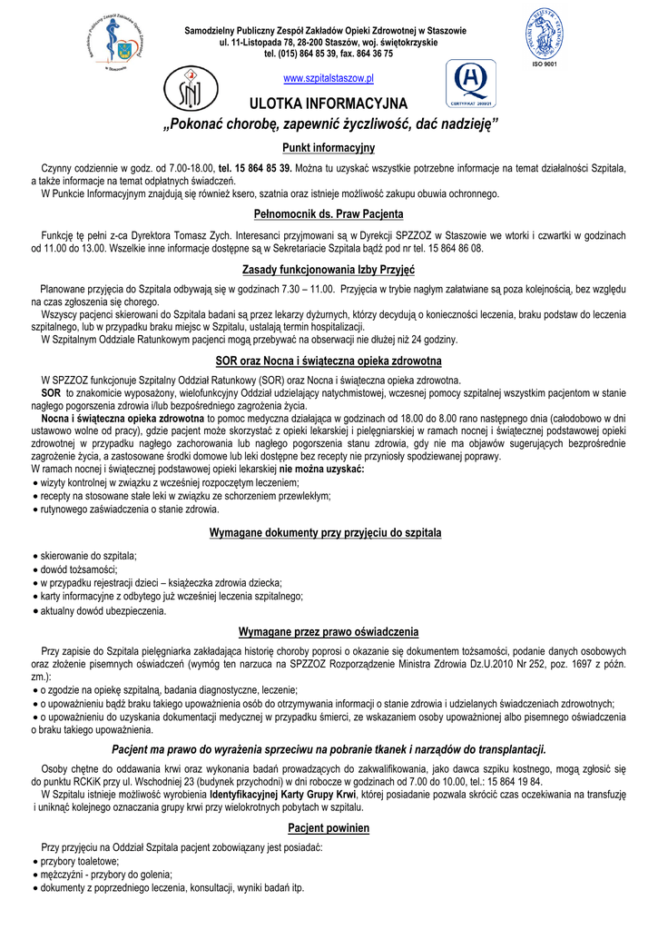 Samodzielny Publiczny Zespół Zakładów Opieki Zdrowotnej w Staszowie ul. 11-Listopada 78, 28-200 Staszów, woj. świętokrzyskie tel. (015) 864 85 39, fax. 864 36 75 www.szpitalstaszow.pl ULOTKA INFORMACYJNA „Pokonać chorobę, zapewnić życzliwość, dać nadzieję” Punkt informacyjny Czynny codziennie w godz. od 7.00-18.00, tel. 15 864 85 39. Można tu uzyskać wszystkie potrzebne informacje na temat działalności Szpitala, a także informacje na temat odpłatnych świadczeń. W Punkcie Informacyjnym znajdują się również ksero, szatnia oraz istnieje możliwość zakupu obuwia ochronnego. Pełnomocnik ds. Praw Pacjenta Funkcję tę pełni z-ca Dyrektora Tomasz Zych. Interesanci przyjmowani są w Dyrekcji SPZZOZ w Staszowie we wtorki i czwartki w godzinach od 11.00 do 13.00. Wszelkie inne informacje dostępne są w Sekretariacie Szpitala bądź pod nr tel. 15 864 86 08. Zasady funkcjonowania Izby Przyjęć Planowane przyjęcia do Szpitala odbywają się w godzinach 7.30 – 11.00. Przyjęcia w trybie nagłym załatwiane są poza kolejnością, bez względu na czas zgłoszenia się chorego. Wszyscy pacjenci skierowani do Szpitala badani są przez lekarzy dyżurnych, którzy decydują o konieczności leczenia, braku podstaw do leczenia szpitalnego, lub w przypadku braku miejsc w Szpitalu, ustalają termin hospitalizacji. W Szpitalnym Oddziale Ratunkowym pacjenci mogą przebywać na obserwacji nie dłużej niż 24 godziny. SOR oraz Nocna i świąteczna opieka zdrowotna W SPZZOZ funkcjonuje Szpitalny Oddział Ratunkowy (SOR) oraz Nocna i świąteczna opieka zdrowotna. SOR to znakomicie wyposażony, wielofunkcyjny Oddział udzielający natychmistowej, wczesnej pomocy szpitalnej wszystkim pacjentom w stanie nagłego pogorszenia zdrowia i/lub bezpośredniego zagrożenia życia. Nocna i świąteczna opieka zdrowotna to pomoc medyczna działająca w godzinach od 18.00 do 8.00 rano następnego dnia (całodobowo w dni ustawowo wolne od pracy), gdzie pacjent może skorzystać z opieki lekarskiej i pielęgniarskiej w ramach nocnej i świątecznej podstawowej opieki zdrowotnej w przypadku nagłego zachorowania lub nagłego pogorszenia stanu zdrowia, gdy nie ma objawów sugerujących bezprośrednie zagrożenie życia, a zastosowane środki domowe lub leki dostępne bez recepty nie przyniosły spodziewanej poprawy. W ramach nocnej i świątecznej podstawowej opieki lekarskiej nie można uzyskać: wizyty kontrolnej w związku z wcześniej rozpoczętym leczeniem; recepty na stosowane stałe leki w związku ze schorzeniem przewlekłym; rutynowego zaświadczenia o stanie zdrowia. Wymagane dokumenty przy przyjęciu do szpitala skierowanie do szpitala; dowód tożsamości; w przypadku rejestracji dzieci – książeczka zdrowia dziecka; karty informacyjne z odbytego już wcześniej leczenia szpitalnego; aktualny dowód ubezpieczenia. Wymagane przez prawo oświadczenia Przy zapisie do Szpitala pielęgniarka zakładająca historię choroby poprosi o okazanie się dokumentem tożsamości, podanie danych osobowych oraz złożenie pisemnych oświadczeń (wymóg ten narzuca na SPZZOZ Rozporządzenie Ministra Zdrowia Dz.U.2010 Nr 252, poz. 1697 z późn. zm.): o zgodzie na opiekę szpitalną, badania diagnostyczne, leczenie; o upoważnieniu bądź braku takiego upoważnienia osób do otrzymywania informacji o stanie zdrowia i udzielanych świadczeniach zdrowotnych; o upoważnieniu do uzyskania dokumentacji medycznej w przypadku śmierci, ze wskazaniem osoby upoważnionej albo pisemnego oświadczenia o braku takiego upoważnienia. Pacjent ma prawo do wyrażenia sprzeciwu na pobranie tkanek i narządów do transplantacji. Osoby chętne do oddawania krwi oraz wykonania badań prowadzących do zakwalifikowania, jako dawca szpiku kostnego, mogą zgłosić się do punktu RCKiK przy ul. Wschodniej 23 (budynek przychodni) w dni robocze w godzinach od 7.00 do 10.00, tel.: 15 864 19 84. W Szpitalu istnieje możliwość wyrobienia Identyfikacyjnej Karty Grupy Krwi, której posiadanie pozwala skrócić czas oczekiwania na transfuzję i uniknąć kolejnego oznaczania grupy krwi przy wielokrotnych pobytach w szpitalu. Pacjent powinien Przy przyjęciu na Oddział Szpitala pacjent zobowiązany jest posiadać: przybory toaletowe; mężczyźni - przybory do golenia; dokumenty z poprzedniego leczenia, konsultacji, wyniki badań itp. Pacjent może mieć własne sztućce, kubek bądź szklankę. W przypadku obłożnie chorego pacjenta długotrwale leczonego rodzina może dostarczyć środki higieny osobistej (pampersy) dla poprawy komfortu hospitalizacji. Ponadto kobieta rodząca powinna posiadać: kartę przebiegu ciąży; oznaczenie grupy krwi; ostatnie wyniki badań (morfologia, badanie moczu, ostatnie badania mikrobiologiczne); wynik badania USG; wyniki badań na obecność przeciwciał w przypadku ujemnego czynnika Rh. Szczegółowe Prawa i Obowiązki Pacjenta dostępne są na Izbie Przyjęć i Oddziałach w formie ulotek, a także są umieszczone na tablicach ogłoszeniowych. Identyfikacja personelu W celu zapewnienia pacjentom i odwiedzającym możliwości identyfikowania personelu Szpitala oraz zapewnieniu informacji, kto sprawuje nad nim bezprośrednią opiekę, przy każdej sali chorych znajduje się tabliczka informacyjna. Dodatkowo, obowiązkiem całego personelu Szpitala jest noszenie identyfikatorów. Depozyt ubrań i rzeczy wartościowych Pacjent przebiera się w Izbie Przyjęć. Personel w obecności pacjenta dokonuje spisu rzeczy przekazywanych przez pacjenta do depozytu. Depozyt rzeczy wartościowych znajduje się na parterze w Kasie Głównej Szpitala. Jest czynny w dni robocze w godzinach pracy Kasy Głównej od 7.10 do 14.00. W każdej chwili pacjent może zgłosić pielęgniarce potrzebę przekazania rzeczy do Depozytu. Depozyt czynny jest codziennie i znajduje się w podziemiu Szpitala. Odbiór ubrań oraz rzeczy wartościowych znajduje się na Izbie Przyjęć. Personel Oddziałów nie ponosi odpowied