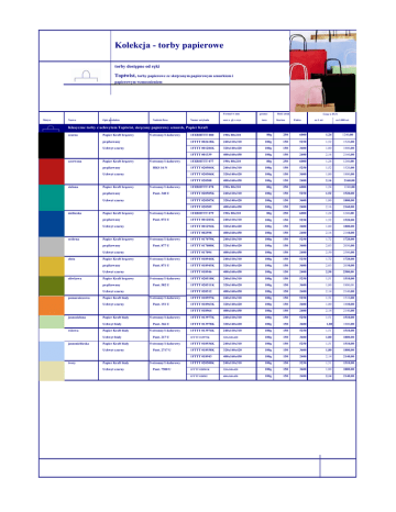 Kolekcja - torby papierowe torby dostępne od ręki Toptwist, torby papierowe ze skręcanym papierowym sznurkiem i papierowym wzmocnieniem Motyw Nazwa Opis produktu Nadruk flexo Numer artykułu Format w mm grama- szer.x gł. x wys tura Ilość sztuk Karton Cena w PLN Paleta za 1 szt za 1.000 szt Klasyczne torby z uchwytem Toptwist, skręcany papierowy sznurek, Papier Kraft czarna czerwona 1FZBHTTT 080 190x 80x210 80g 250 6000 1,24 prążkowany 1FTTT 002618K 240x110x310 100g 150 5250 1,52 1520,00 Uchwyt czarny 1FTTT 001284K 320x140x420 100g 150 3600 1,80 1800,00 Papier Kraft brązowy Papier Kraft brązowy prążkowany 5-stronny/1-kolorowy 5-stronny/1-kolorowy HKS 16 N Uchwyt czarny zielona Papier Kraft brązowy prążkowany 5-stronny/1-kolorowy Pant. 348 U Uchwyt czarny niebieska Papier Kraft brązowy prążkowany 5-stronny/1-kolorowy Pant. 072 U Uchwyt czarny srebrna Papier Kraft brązowy prążkowany 5-stronny/1-kolorowy Pant. 877 U Uchwyt czarny złota Papier Kraft brązowy prążkowany 5-stronny/1-kolorowy Pant. 871 U Uchwyt czarny oliwkowa Papier Kraft brązowy prążkowany 5-stronny/1-kolorowy Pant. 582 U Uchwyt czarny pomarańczowa Papier Kraft biały Uchwyt czarny jasnozielona Papier Kraft biały Uchwyt biały różowa Papier Kraft biały Uchwyt biały jasnoniebieska Papier Kraft biały Uchwyt czarny ivory Papier Kraft biały Uchwyt czarny 5-stronny/1-kolorowy Pant. 151 U 5-stronny/1-kolorowy Pant. 366 U 5-stronny/1-kolorowy Pant. 217 U 5-stronny/1-kolorowy Pant. 2717 U 5-stronny/1-kolorowy Pant. 7500 U 1240,00 1FTTT 001339 400x160x450 100g 150 2400 2,16 2160,00 1FZBHTTT 077 190x 80x210 80g 250 6000 1,24 1240,00 1FTTT 020504K 240x110x310 100g 150 5250 1,52 1520,00 1FTTT 020506K 320x140x420 100g 150 3600 1,80 1800,00 1FTTT 020508 400x160x450 100g 150 2400 2,16 2160,00 1FZBHTTT 078 190x 80x210 80g 250 6000 1,24 1240,00 1FTTT 020505K 240x110x310 100g 150 5250 1,52 1520,00 1800,00 1FTTT 020507K 320x140x420 100g 150 3600 1,80 1FTTT 020509 400x160x450 100g 150 2400 2,16 2160,00 1FZBHTTT 079 190x 80x210 80g 250 6000 1,24 1240,00 1FTTT 001283K 240x110x310 100g 150 5250 1,52 1520,00 1FTTT 001294K 320x140x420 100g 150 3600 1,80 1800,00 1FTTT 002598 400x160x450 100g 150 2400 2,16 2160,00 1FTTT 017079K 240x110x310 100g 150 5250 1,72 1720,00 1FTTT 017080K 320x140x420 100g 150 3600 2,03 2030,00 1FTTT 017094 400x160x450 100g 150 2400 2,50 2500,00 1FTTT 018944K 240x110x310 100g 150 5250 1,72 1720,00 1FTTT 018945K 320x140x420 100g 150 3600 2,03 2030,00 1FTTT 018946 400x160x450 100g 150 2400 2,50 2500,00 1FTTT 020510K 240x110x310 100g 150 5250 1,51 1510,00 1FTTT 020511K 320x140x420 100g 150 3600 1,80 1800,00 1FTTT 020512 400x160x450 100g 150 2400 2,14 2140,00 1FTTT 018957K 240x110x310 100g 150 5250 1,51 1510,00 1FTTT 018963K 320x140x420 100g 150 3600 1,80 1800,00 1FTTT 018964 400x160x450 100g 150 2400 2,14 2140,00 1FTTT 013977K 240x110x310 100g 150 5250 1,51 1510,00 1FTTT 013978K 320x140x420 100g 150 3600 1,80 1800,00 1FTTT 013974K 240x110x310 100g 150 5250 1,51 1510,00 1FTTT 013975K 320x140x420 100g 150 3600 1,80 1800,00 1FTTT 018936K 240x110x310 100g 150 5250 1,51 1510,00 1FTTT 018938K 320x140x420 100g 150 3600 1,80 1800,00 1FTTT 018943 400x160x450 100g 150 2400 2,14 2140,00 1FTTT 020500K 240x110x310 100g 150 5250 1,51 1510,00 1FTTT 020501K 320x140x420 100g 150 3600 1,80 1800,00 1FTTT 020502 400x160x450 100g 150 2400 2,14 2140,00