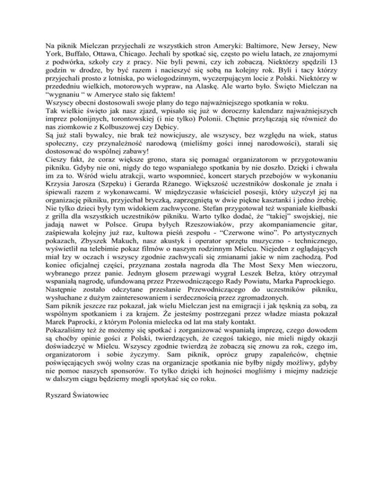 Na piknik Mielczan przyjechali ze wszystkich stron Ameryki: Baltimore, New Jersey, New York, Buffalo, Ottawa, Chicago. Jechali by spotkać się, często po wielu latach, ze znajomymi z podwórka, szkoły czy z pracy. Nie byli pewni, czy ich zobaczą. Niektórzy spędzili 13 godzin w drodze, by być razem i nacieszyć się sobą na kolejny rok. Byli i tacy którzy przyjechali prosto z lotniska, po wielogodzinnym, wyczerpującym locie z Polski. Niektórzy w przededniu wielkich, motorowych wypraw, na Alaskę. Ale warto było. Święto Mielczan na “wygnaniu “ w Ameryce stało się faktem! Wszyscy obecni dostosowali swoje plany do tego najwaŜniejszego spotkania w roku. Tak wielkie święto jak nasz zjazd, wpisało się juŜ w doroczny kalendarz najwaŜniejszych imprez polonijnych, torontowskiej (i nie tylko) Polonii. Chętnie przyłączają się równieŜ do nas ziomkowie z Kolbuszowej czy Dębicy. Są juŜ stali bywalcy, nie brak teŜ nowicjuszy, ale wszyscy, bez względu na wiek, status społeczny, czy przynaleŜność narodową (mieliśmy gości innej narodowości), starali się dostosować do wspólnej zabawy! Cieszy fakt, Ŝe coraz większe grono, stara się pomagać organizatorom w przygotowaniu pikniku. Gdyby nie oni, nigdy do tego wspaniałego spotkania by nie doszło. Dzięki i chwała im za to. Wśród wielu atrakcji, warto wspomnieć, koncert starych przebojów w wykonaniu Krzysia Jarosza (Szpeku) i Gerarda RŜanego. Większość uczestników doskonale je znała i śpiewali razem z wykonawcami. W międzyczasie właściciel posesji, który uŜyczył jej na organizację pikniku, przyjechał bryczką, zaprzęgniętą w dwie piękne kasztanki i jedno źrebię. Nie tylko dzieci były tym widokiem zachwycone. Stefan przygotował teŜ wspaniałe kiełbaski z grilla dla wszystkich uczestników pikniku. Warto tylko dodać, Ŝe “takiej” swojskiej, nie jadają nawet w Polsce. Grupa byłych Rzeszowiaków, przy akompaniamencie gitar, zaśpiewała kolejny juŜ raz, kultowa pieśń zespołu - “Czerwone wino”. Po artystycznych pokazach, Zbyszek Makuch, nasz akustyk i operator sprzętu muzyczno - technicznego, wyświetlił na telebimie pokaz filmów o naszym rodzinnym Mielcu. Niejeden z oglądających miał łzy w oczach i wszyscy zgodnie zachwycali się zmianami jakie w nim zachodzą. Pod koniec oficjalnej części, przyznana została nagroda dla The Most Sexy Men wieczoru, wybranego przez panie. Jednym głosem przewagi wygrał Leszek Bełza, który otrzymał wspaniałą nagrodę, ufundowaną przez Przewodniczącego Rady Powiatu, Marka Paprockiego. Następnie zostało odczytane przesłanie Przewodniczącego do uczestników pikniku, wysłuchane z duŜym zainteresowaniem i serdecznością przez zgromadzonych. Sam piknik jeszcze raz pokazał, jak wielu Mielczan jest na emigracji i jak tęsknią za sobą, za wspólnym spotkaniem i za krajem. śe jesteśmy postrzegani przez władze miasta pokazał Marek Paprocki, z którym Polonia mielecka od lat ma stały kontakt. Pokazaliśmy teŜ Ŝe moŜemy się spotkać i zorganizować wspaniałą imprezę, czego dowodem są choćby opinie gości z Polski, twierdzących, Ŝe czegoś takiego, nie mieli nigdy okazji doświadczyć w Mielcu. Wszyscy zgodnie twierdzą Ŝe zobaczą się znowu za rok, czego im, organizatorom i sobie Ŝyczymy. Sam piknik, oprócz grupy zapaleńców, chętnie poświęcających swój wolny czas na organizacje spotkania nie byłby nigdy moŜliwy, gdyby nie pomoc naszych sponsorów. To tylko dzięki ich hojności mogliśmy i miejmy nadzieje w dalszym ciągu będziemy mogli spotykać się co roku. Ryszard Światowiec Przesłanie do Polonii Kanadyjsko-Amerykańskiej Marka Paprockiego Przewodniczącego Rady Powiatu Mieleckiego Kochani Mielczanie W tym radosnym dniu, jakim jest Wasze spotkanie na kontynencie amerykańskim, w Święto Kanady i Niepodległości Stanów Zjednoczonych, pragnę Wam wszystkim, zamieszkałym w tych pięknych krajach, a mających w sercach mielecką nostalgię, złoŜyć najserdeczniejsze Ŝyczenia! Niech przez ten skromny prezent, jakim jest ufundowanie przeze mnie nagrody, dla The Most Sexy Men wieczoru, będę, choć w ten sposób mógł być z Wami obecny. Jak większość z Was dobrze wie, wielokrotnie juŜ gościłem w Waszych domach i na piknikach, jak równieŜ róŜnego rodzaju Waszych uroczystościach. Wielu z Was miałem teŜ przyjemność gościć w swoim domu. Znam Wasze troski, zmartwienia, problemy z którymi na co dzień się borykacie. W miarę moich moŜliwości, staram się Wam pomagać, ale przede wszystkim podziwiam Was! Podziwiam, za to, Ŝe pomimo cięŜkiej drogi, jaką przeszliście, często niedostrzeganej przez rodaków w kraju, wciąŜ staracie się być Polakami. Kultywujecie polski język, tradycje, uczycie dzieci ojczystej mowy, uczęszczacie do polskich kościołów. I właśnie dlatego chcę być i jestem jednym z Was! Podziwiam i rozumiem Was bardziej, niŜ być moŜe ktokolwiek inny. Jesteście moimi przyjaciółmi! Chciałbym więc, by ta przyjaźń pozostała pomiędzy nami na zawsze. JuŜ dziś obiecuję, Ŝe w przyszłym roku zrobię wszystko by móc być tutaj z Wami. Nie będę sam. Mam nadzieję, Ŝe sprawię Wam duŜą frajdę przywoŜąc ze sobą wspaniałego gościa, jakim jest właściciel tygodnika KORSO - Bogdan Rojkowicz! Tygodnika, który tak chętnie czytacie. Proszę więc organizatorów o zarezerwowanie tego miejsca i terminu na nasze wspólne mieleckie biesiadowanie. Do zobaczenia za rok! Przewodniczący Rady Powiatu Mieleckiego Marek Paprocki.